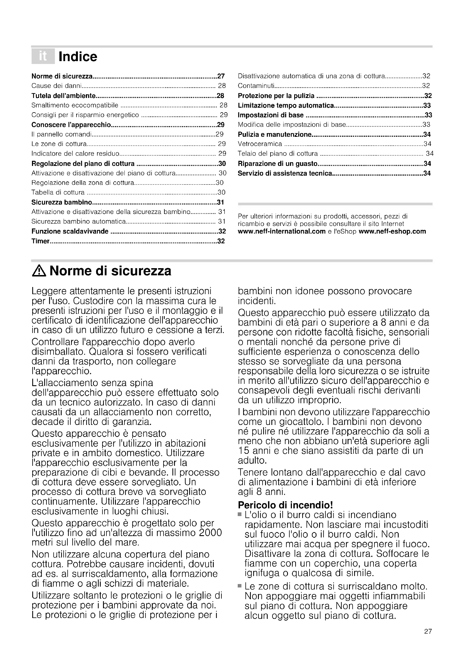 - Stellen Sie keine heißen Töpfe an oder auf das Bedienfeld A 0810 550 544 D 089 12 474 474 CH 0848 840 04027 â Indice [it]Istruzioni per l’uso Norme di sicurezza...................................................................27 Cause dei danni............................................................................... 28 Tutela dell'ambiente.................................................................28 Smaltimento ecocompatibile ......................................................... 28 Consigli per il risparmio energetico ............................................. 29 Conoscere l'apparecchio.........................................................29 Il pannello comandi.........................................................................29 Le zone di cottura............................................................................ 29 Indicatore del calore residuo......................................................... 29 Regolazione del piano di cottura ............................................30 Attivazione e disattivazione del piano di cottura........................ 30 Regolazione della zona di cottura................................................30 Tabella di cottura .............................................................................30 Sicurezza bambino...................................................................31 Attivazione e disattivazione della sicurezza bambino............... 31 Sicurezza bambino automatica..................................................... 31 Funzione scaldavivande ..........................................................32 Timer..........................................................................................32 Disattivazione automatica di una zona di cottura......................32 Contaminuti.......................................................................................32 Protezione per la pulizia ..........................................................32 Limitazione tempo automatica................................................33 Impostazioni di base ................................................................33 Modifica delle impostazioni di base.............................................33 Pulizia e manutenzione............................................................34 Vetroceramica ..................................................................................34 Telaio del piano di cottura ............................................................. 34 Riparazione di un guasto.........................................................34 Servizio di assistenza tecnica.................................................34 Produktinfo Per ulteriori informazioni su prodotti, accessori, pezzi di ricambio e servizi è possibile consultare il sito Internet www.neff-international.com e l'eShop www.neff-eshop.com : Norme di sicurezza Leggere attentamente le presenti istruzioni per l'uso. Custodire con la massima cura le presenti istruzioni per l'uso e il montaggio e il certificato di identificazione dell'apparecchio in caso di un utilizzo futuro e cessione a terzi. Controllare l'apparecchio dopo averlo disimballato. Qualora si fossero verificati danni da trasporto, non collegare l'apparecchio. L'allacciamento senza spina dell'apparecchio può essere effettuato solo da un tecnico autorizzato. In caso di danni causati da un allacciamento non corretto, decade il diritto di garanzia. Questo apparecchio è pensato esclusivamente per l'utilizzo in abitazioni private e in ambito domestico. Utilizzare l'apparecchio esclusivamente per la preparazione di cibi e bevande. Il processo di cottura deve essere sorvegliato. Un processo di cottura breve va sorvegliato continuamente. Utilizzare l'apparecchio esclusivamente in luoghi chiusi. Questo apparecchio è progettato solo per l'utilizzo fino ad un'altezza di massimo 2000 metri sul livello del mare. Non utilizzare alcuna copertura del piano cottura. Potrebbe causare incidenti, dovuti ad es. al surriscaldamento, alla formazione di fiamme o agli schizzi di materiale. Utilizzare soltanto le protezioni o le griglie di protezione per i bambini approvate da noi. Le protezioni o le griglie di protezione per i bambini non idonee possono provocare incidenti. Questo apparecchio può essere utilizzato da bambini di età pari o superiore a 8 anni e da persone con ridotte facoltà fisiche, sensoriali o mentali nonché da persone prive di sufficiente esperienza o conoscenza dello stesso se sorvegliate da una persona responsabile della loro sicurezza o se istruite in merito all'utilizzo sicuro dell'apparecchio e consapevoli degli eventuali rischi derivanti da un utilizzo improprio. I bambini non devono utilizzare l'apparecchio come un giocattolo. I bambini non devono né pulire né utilizzare l'apparecchio da soli a meno che non abbiano un'età superiore agli 15 anni e che siano assistiti da parte di un adulto. Tenere lontano dall'apparecchio e dal cavo di alimentazione i bambini di età inferiore agli 8 anni. Pericolo di incendio!