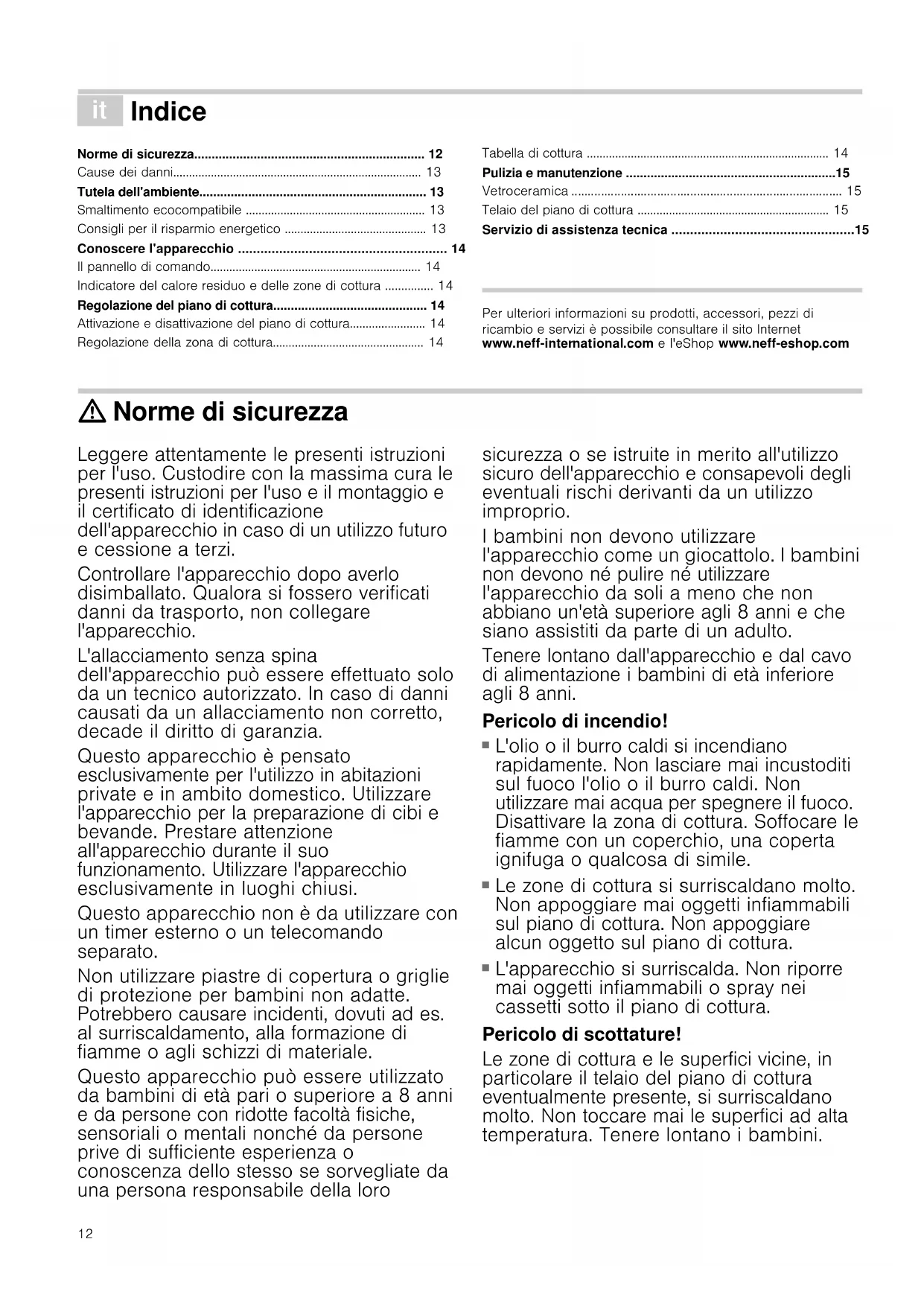 L'apparecchio si surriscalda. Non riporre mai oggetti infiammabili o spray nei cassetti sotto il piano di cottura. Pericolo di scottature! Le zone di cottura e le superfici vicine, in particolare il telaio del piano di cottura eventualmente presente, si surriscaldano molto. Non toccare mai le superfici ad alta temperatura. Tenere lontano i bambini.13 Pericolo di scossa elettrica!