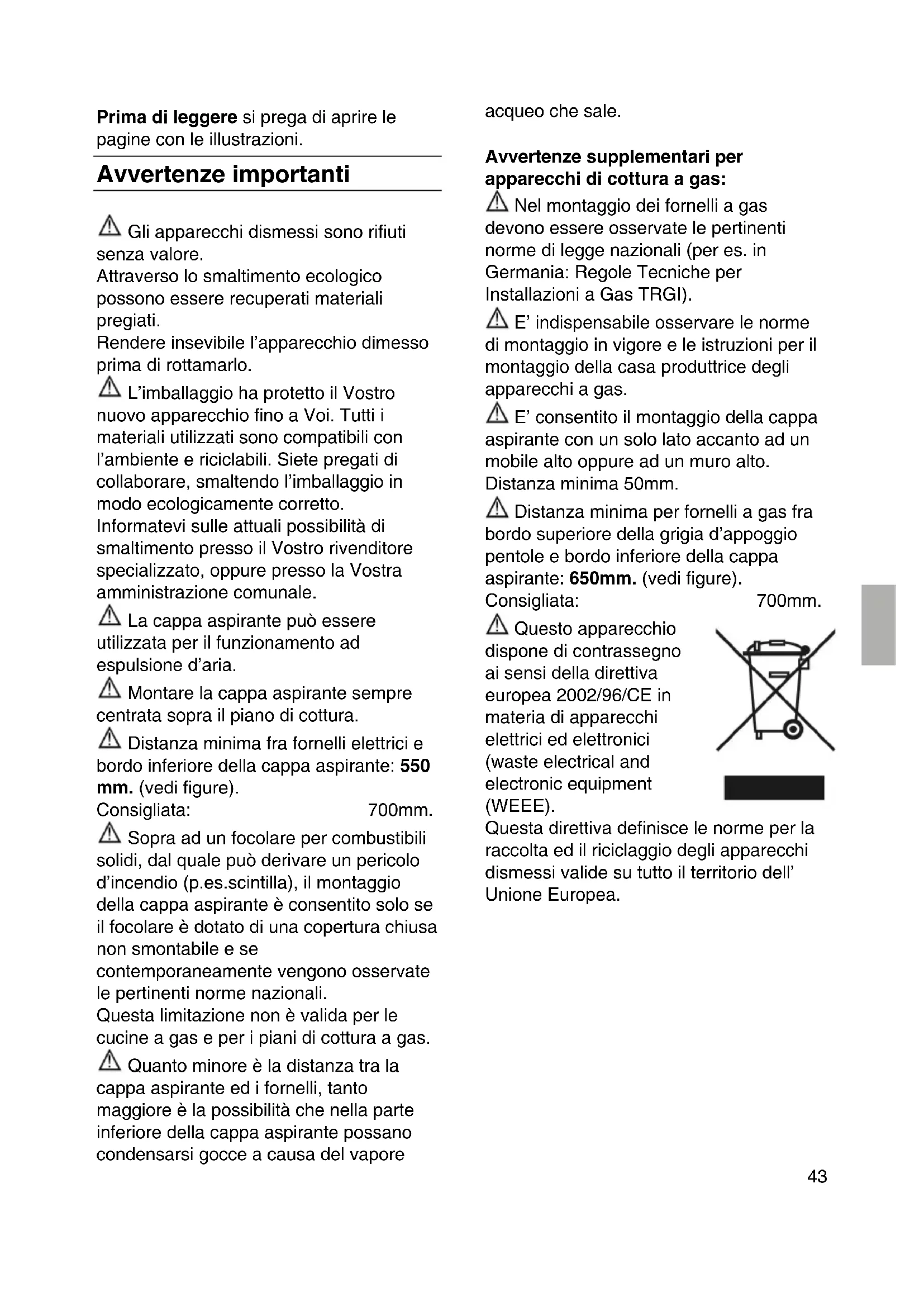Gli apparecchi dismessi sono rifiuti senza valore. Attraverso lo smaltimento ecologico possono essere recuperati materiali pregiati. Rendere insevibile l’apparecchio dimesso prima di rottamarlo. L’imballaggio ha protetto il Vostro nuovo apparecchio fino a Voi. Tutti i materiali utilizzati sono compatibili con l’ambiente e riciclabili. Siete pregati di collaborare, smaltendo l’imballaggio in modo ecologicamente corretto. Informatevi sulle attuali possibilità di smaltimento presso il Vostro rivenditore specializzato, oppure presso la Vostra amministrazione comunale. La cappa aspirante può essere utilizzata per il funzionamento ad espulsione d’aria. Montare la cappa aspirante sempre centrata sopra il piano di cottura. Distanza minima fra fornelli elettrici e bordo inferiore della cappa aspirante: 550 mm. (vedi figure). Consigliata: 700mm. Sopra ad un focolare per combustibili solidi, dal quale può derivare un pericolo d’incendio (p.es.scintilla), il montaggio della cappa aspirante è consentito solo se il focolare è dotato di una copertura chiusa non smontabile e se contemporaneamente vengono osservate le pertinenti norme nazionali. Questa limitazione non è valida per le cucine a gas e per i piani di cottura a gas. Quanto minore è la distanza tra la cappa aspirante ed i fornelli, tanto maggiore è la possibilità che nella parte inferiore della cappa aspirante possano condensarsi gocce a causa del vapore acqueo che sale. Avvertenze supplementari per apparecchi di cottura a gas: Nel montaggio dei fornelli a gas devono essere osservate le pertinenti norme di legge nazionali (per es. in Germania: Regole Tecniche per Installazioni a Gas TRGI). E’ indispensabile osservare le norme di montaggio in vigore e le istruzioni per il montaggio della casa produttrice degli apparecchi a gas. E’ consentito il montaggio della cappa aspirante con un solo lato accanto ad un mobile alto oppure ad un muro alto. Distanza minima 50mm. Distanza minima per fornelli a gas fra bordo superiore della grigia d’appoggio pentole e bordo inferiore della cappa aspirante: 650mm. (vedi figure). Consigliata: 700mm. Questo apparecchio dispone di contrassegno ai sensi della direttiva europea 2002/96/CE in materia di apparecchi elettrici ed elettronici (waste electrical and electronic equipment (WEEE). Questa direttiva definisce le norme per la raccolta ed il riciclaggio degli apparecchi dismessi valide su tutto il territorio dell’ Unione Europea.Prima del montaggio