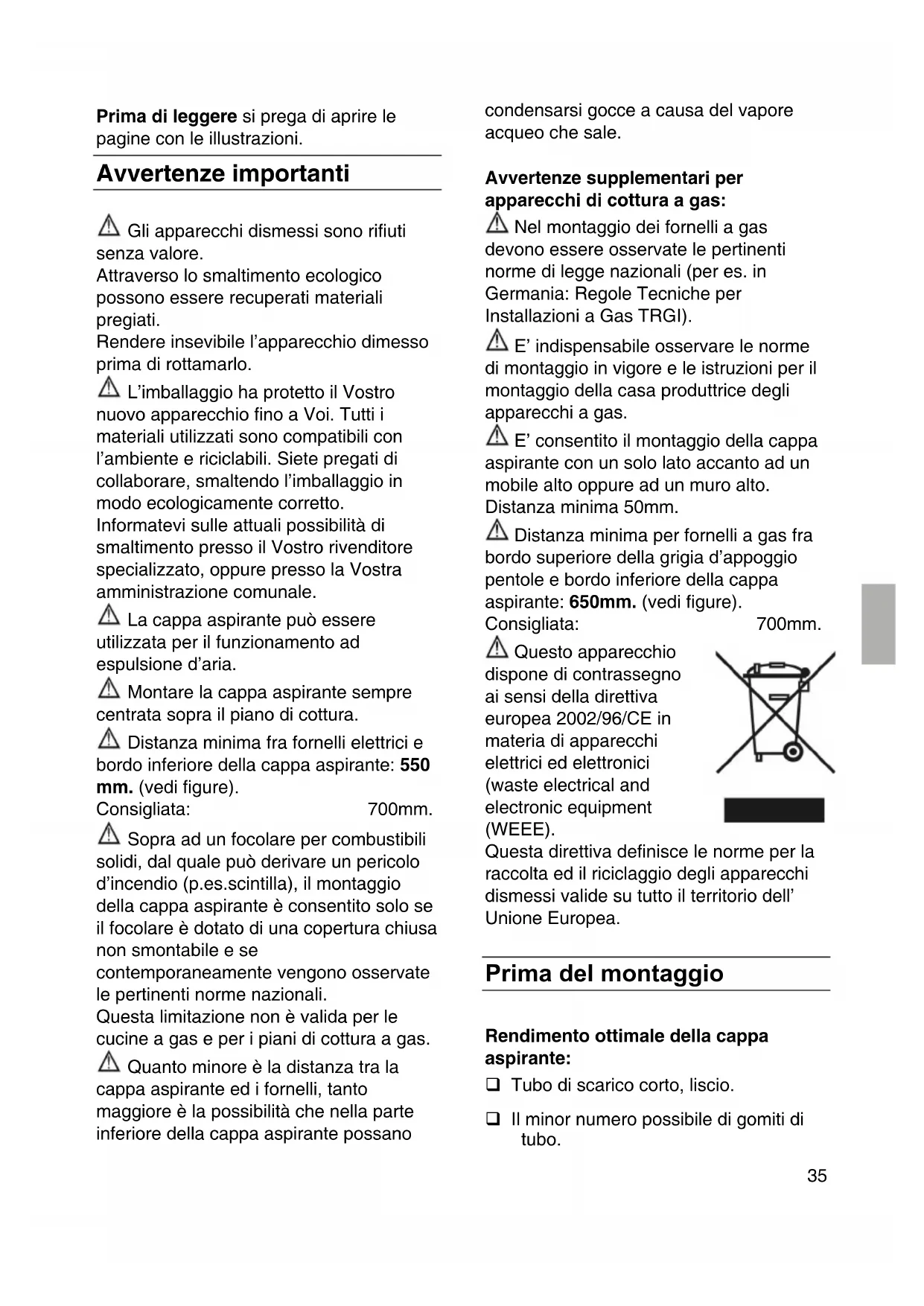 Prima di leggere si prega di aprire le pagine con le illustrazioni. Avvertenze importanti Gli apparecchi dismessi sono rifiuti senza valore. Attraverso lo smaltimento ecologico possono essere recuperati materiali pregiati. Rendere insevibile l’apparecchio dimesso prima di rottamarlo. L’imballaggio ha protetto il Vostro nuovo apparecchio fino a Voi. Tutti i materiali utilizzati sono compatibili con l’ambiente e riciclabili. Siete pregati di collaborare, smaltendo l’imballaggio in modo ecologicamente corretto. Informatevi sulle attuali possibilità di smaltimento presso il Vostro rivenditore specializzato, oppure presso la Vostra amministrazione comunale. La cappa aspirante può essere utilizzata per il funzionamento ad espulsione d’aria. Montare la cappa aspirante sempre centrata sopra il piano di cottura. Distanza minima fra fornelli elettrici e bordo inferiore della cappa aspirante: 550 mm. (vedi figure). Consigliata: 700mm. Sopra ad un focolare per combustibili solidi, dal quale può derivare un pericolo d’incendio (p.es.scintilla), il montaggio della cappa aspirante è consentito solo se il focolare è dotato di una copertura chiusa non smontabile e se contemporaneamente vengono osservate le pertinenti norme nazionali. Questa limitazione non è valida per le cucine a gas e per i piani di cottura a gas. Quanto minore è la distanza tra la cappa aspirante ed i fornelli, tanto maggiore è la possibilità che nella parte inferiore della cappa aspirante possano condensarsi gocce a causa del vapore acqueo che sale. Avvertenze supplementari per apparecchi di cottura a gas: Nel montaggio dei fornelli a gas devono essere osservate le pertinenti norme di legge nazionali (per es. in Germania: Regole Tecniche per Installazioni a Gas TRGI). E’ indispensabile osservare le norme di montaggio in vigore e le istruzioni per il montaggio della casa produttrice degli apparecchi a gas. E’ consentito il montaggio della cappa aspirante con un solo lato accanto ad un mobile alto oppure ad un muro alto. Distanza minima 50mm. Distanza minima per fornelli a gas fra bordo superiore della grigia d’appoggio pentole e bordo inferiore della cappa aspirante: 650mm. (vedi figure). Consigliata: 700mm. Questo apparecchio dispone di contrassegno ai sensi della direttiva europea 2002/96/CE in materia di apparecchi elettrici ed elettronici (waste electrical and electronic equipment (WEEE). Questa direttiva definisce le norme per la raccolta ed il riciclaggio degli apparecchi dismessi valide su tutto il territorio dell’ Unione Europea. Prima del montaggio Rendimento ottimale della cappa aspirante: Tubo di scarico corto, liscio. Il minor numero possibile di gomiti di tubo.36