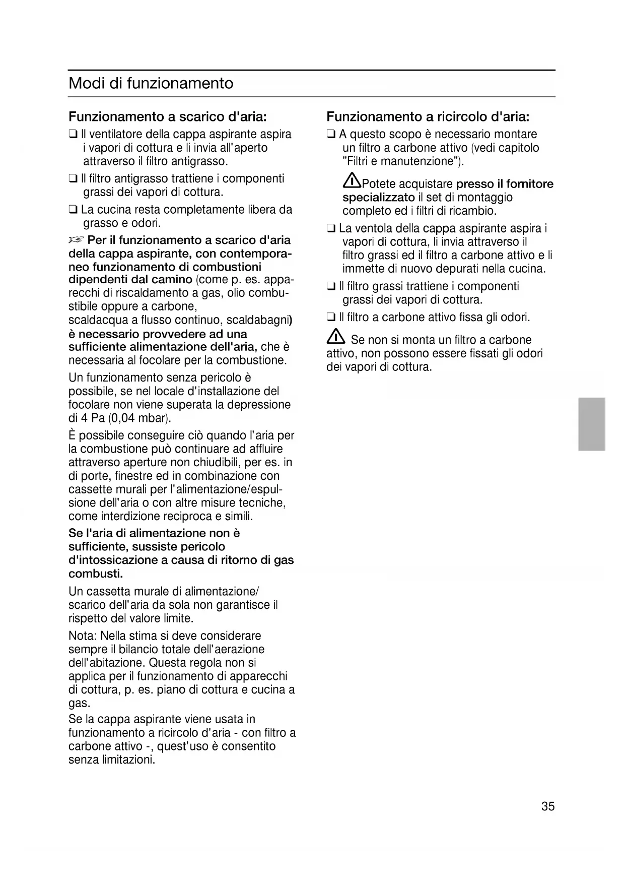 Per il funzionamento a scarico d'aria della cappa aspirante, con contempora- neo funzionamento di combustioni dipendenti dal camino (come p. es. appa- recchi di riscaldamento a gas, olio combu- stibile oppure a carbone, scaldacqua a flusso continuo, scaldabagni) è necessario provvedere ad una sufficiente alimentazione dell'aria, che è necessaria al focolare per la combustione. Un funzionamento senza pericolo è possibile, se nel locale d'installazione del focolare non viene superata la depressione di 4 Pa (0,04 mbar). È possibile conseguire ciò quando l'aria per la combustione può continuare ad affluire attraverso aperture non chiudibili, per es. in di porte, finestre ed in combinazione con cassette murali per l'alimentazione/espul- sione dell'aria o con altre misure tecniche, come interdizione reciproca e simili. Se l'aria di alimentazione non è sufficiente, sussiste pericolo d'intossicazione a causa di ritorno di gas combusti. Un cassetta murale di alimentazione/ scarico dell'aria da sola non garantisce il rispetto del valore limite. Nota: Nella stima si deve considerare sempre il bilancio totale dell'aerazione dell'abitazione. Questa regola non si applica per il funzionamento di apparecchi di cottura, p. es. piano di cottura e cucina a gas. Se la cappa aspirante viene usata in funzionamento a ricircolo d'aria - con filtro a carbone attivo -, quest'uso è consentito senza limitazioni. Modi di funzionamento Funzionamento a ricircolo d'aria: ❑ A questo scopo è necessario montare un filtro a carbone attivo (vedi capitolo "Filtri e manutenzione"). Potete acquistare presso il fornitore specializzato il set di montaggio completo ed i filtri di ricambio. ❑ La ventola della cappa aspirante aspira i vapori di cottura, li invia attraverso il filtro grassi ed il filtro a carbone attivo e li immette di nuovo depurati nella cucina. ❑ Il filtro grassi trattiene i componenti grassi dei vapori di cottura. ❑ Il filtro a carbone attivo fissa gli odori. Se non si monta un filtro a carbone attivo, non possono essere fissati gli odori dei vapori di cottura.36 Precede la prima utilizzazione Primo impiego: ❑ Questo libretto di istruzioni per l'uso èprevisto per più versioni dell' apparecchio. É possibile che siano descritti singoli particolari della dotazio- ne, che non riguardano il Vostro appa- recchio. ❑ Questa cappa aspirante è conforme alle pertinenti norme di sicurezza. Le riparazioni devono essere eseguite solo da personale specializzato. Le riparazioni non eseguite a regola d'arte possono causare pericoli gravi per l'utilizzatore. Piani di cottura a gas / Fornelli a gas Non usare tutti i fornelli contemporaneamente al massimo carico termico per un periodo prolungato (max. 15 minuti), altrimenti sussiste il pericolo di scottature, se si tocca la superficie dell’involucro o pericolo di danni alla cappa aspirante. Nell’uso della cappa aspirante sopra un piano di cottura a gas, in caso d’utilizzazione contemporanea di tre o più fornelli a gas, la cappa aspirante deve funzionare alla massima potenza d’aspirazione. ❑ Prima di usare il nuovo apparecchio, leg- gete attentamente le istruzioni per l'uso. Esse contengono informazioni importanti per la Vostra sicurezza, e anche per l'uso e la manutenzione dell'apparecchio. ❑ Conservate bene il libretto delle istruzioni per l'uso e il montaggio, per un eventuale successivo proprietario. ❑ Questo apparecchio dis- pone di contrassegno ai sensi della direttiva europea 2002/96/CE in materia di apparecchi elettrici ed elettronici (waste electrical and electronic equipment – WEEE). Questa direttiva definisce le norme per la raccolta e il riciclaggio degli apparecchi dismessi valide su tutto il territorio dell’Unione Europea.