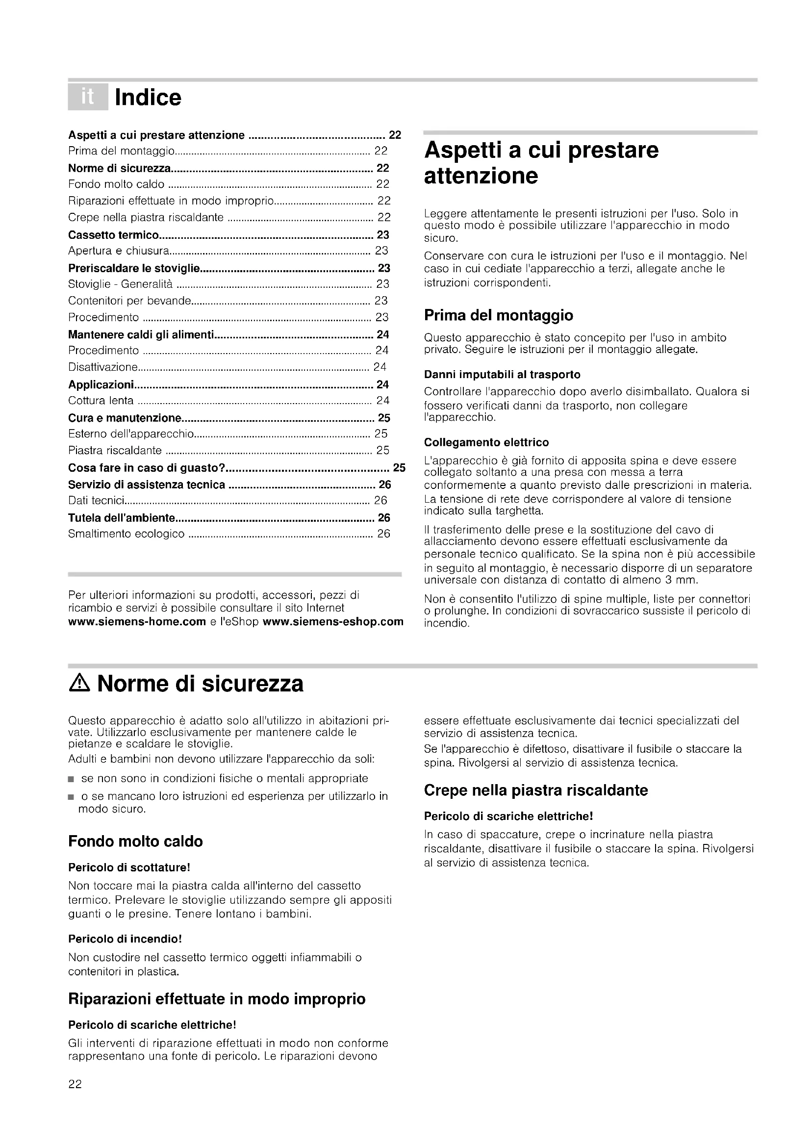 - Smaltimento ecologico Produktinfo Per ulteriori informazioni su prodotti, accessori, pezzi di ricambio e servizi è possibile consultare il sito Internet www.siemens-home.com e l'eShop www.siemens-eshop.com Aspetti a cui prestare attenzione Leggere attentamente le presenti istruzioni per l'uso. Solo in questo modo è possibile utilizzare l'apparecchio in modo sicuro. Conservare con cura le istruzioni per l'uso e il montaggio. Nel caso in cui cediate l'apparecchio a terzi, allegate anche le istruzioni corrispondenti. Prima del montaggio Questo apparecchio è stato concepito per l'uso in ambito privato. Seguire le istruzioni per il montaggio allegate. Danni imputabili al trasporto Controllare l'apparecchio dopo averlo disimballato. Qualora si fossero verificati danni da trasporto, non collegare l'apparecchio. Collegamento elettrico L'apparecchio è già fornito di apposita spina e deve essere collegato soltanto a una presa con messa a terra conformemente a quanto previsto dalle prescrizioni in materia. La tensione di rete deve corrispondere al valore di tensione indicato sulla targhetta. Il trasferimento delle prese e la sostituzione del cavo di allacciamento devono essere effettuati esclusivamente da personale tecnico qualificato. Se la spina non è più accessibile in seguito al montaggio, è necessario disporre di un separatore universale con distanza di contatto di almeno 3 mm. Non è consentito l'utilizzo di spine multiple, liste per connettori o prolunghe. In condizioni di sovraccarico sussiste il pericolo di incendio. ã=Norme di sicurezza Questo apparecchio è adatto solo all'utilizzo in abitazioni pri- vate. Utilizzarlo esclusivamente per mantenere calde le pietanze e scaldare le stoviglie. Adulti e bambini non devono utilizzare l'apparecchio da soli: ■ se non sono in condizioni fisiche o mentali appropriate ■ o se mancano loro istruzioni ed esperienza per utilizzarlo in modo sicuro. Fondo molto caldo Pericolo di scottature! Non toccare mai la piastra calda all'interno del cassetto termico. Prelevare le stoviglie utilizzando sempre gli appositi guanti o le presine. Tenere lontano i bambini. Pericolo di incendio! Non custodire nel cassetto termico oggetti infiammabili o contenitori in plastica. Riparazioni effettuate in modo improprio Pericolo di scariche elettriche! Gli interventi di riparazione effettuati in modo non conforme rappresentano una fonte di pericolo. Le riparazioni devono essere effettuate esclusivamente dai tecnici specializzati del servizio di assistenza tecnica. Se l'apparecchio è difettoso, disattivare il fusibile o staccare la spina. Rivolgersi al servizio di assistenza tecnica. Crepe nella piastra riscaldante Pericolo di scariche elettriche! In caso di spaccature, crepe o incrinature nella piastra riscaldante, disattivare il fusibile o staccare la spina. Rivolgersi al servizio di assistenza tecnica.23 Cassetto termico Il cassetto termico consente di preriscaldare le stoviglie o mantenere caldi gli alimenti. L'apparecchio riscalda soltanto se il cassetto è stato chiuso correttamente. Apertura e chiusura In caso di apparecchi senza maniglia: Per aprire o chiudere il cassetto, premere la parte centrale. Il cassetto fuoriesce leggermente permettendo di estrarlo senza difficoltà. Preriscaldare le stoviglie Preriscaldando le stoviglie, gli alimenti ivi contenuti non si raffredderanno troppo rapidamente. Le bevande restano calde più a lungo. Stoviglie - Generalità Il cassetto scaldavivande può contenere fino a un massimo di 25 kg. Per esempio, è possibile preriscaldare posate per 6 - 12 persone. Disposizione delle stoviglie Disporre le stoviglie in modo uniforme sull'intera superficie. I piatti disposti l'uno sull'altro si scaldano più lentamente rispetto alle stoviglie disposte singolarmente, per esempio 2 ciotole. Contenitori per bevande Per riscaldare i contenitori per bevande, quali le tazze per caffè espresso, usare il livello 2. ã=Pericolo di ustioni! Impostando il livello 3 oppure 4, i contenitori per bevande diventano molto caldi. Procedimento p. 26