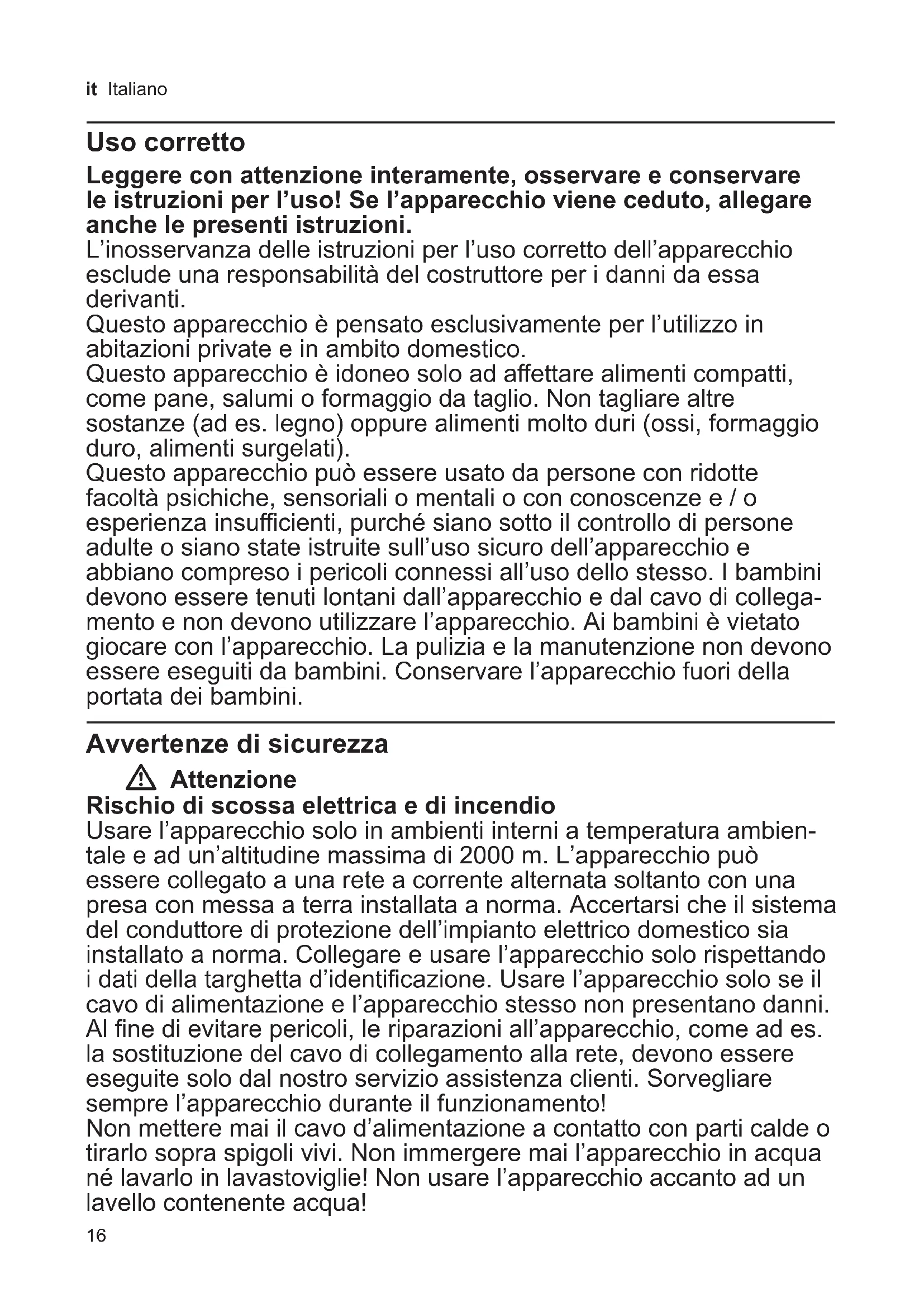 Eliminez l’emballage en respectant l’environnement. Cet appareil est marqué selon la directive européenne 2012/19/UE relative aux appareils électriques et électroniques usagés (waste electrical and electronic equip- ment – WEEE). La directive définit le cadre pour une reprise et une récupération des appareils usagés applicables dans les pays de la CE. S’informer auprès du revendeur sur la procédure actuelle de recyclage. Garantie Les conditions de garantie applicables sont celles publiées par notre distributeur dans le pays où a été e ectué l’achat. Le revendeur chez qui vous vous êtes procuré l’appareil fournira les modalités de garantie sur simple demande de votre part. En cas de recours en garantie, veuillez toujours vous munir de la preuve d’achat. Sous réserve de modi cations.16 it Italiano Uso corretto Leggere con attenzione interamente, osservare e conservare le istruzioni per l’uso! Se l’apparecchio viene ceduto, allegare anche le presenti istruzioni. L’inosservanza delle istruzioni per l’uso corretto dell’apparecchio esclude una responsabilità del costruttore per i danni da essa derivanti. Questo apparecchio è pensato esclusivamente per l’utilizzo in abitazioni private e in ambito domestico. Questo apparecchio è idoneo solo ad aettare alimenti compatti, come pane, salumi o formaggio da taglio. Non tagliare altre sostanze (ad es. legno) oppure alimenti molto duri (ossi, formaggio duro, alimenti surgelati). Questo apparecchio può essere usato da persone con ridotte facoltà psichiche, sensoriali o mentali o con conoscenze e / o esperienza insucienti, purché siano sotto il controllo di persone adulte o siano state istruite sull’uso sicuro dell’apparecchio e abbiano compreso i pericoli connessi all’uso dello stesso. I bambini devono essere tenuti lontani dall’apparecchio e dal cavo di collega- mento e non devono utilizzare l’apparecchio. Ai bambini è vietato giocare con l’apparecchio. La pulizia e la manutenzione non devono essere eseguiti da bambini. Conservare l’apparecchio fuori della portata dei bambini. Avvertenze di sicurezza W Attenzione Rischio di scossa elettrica e di incendio Usare l’apparecchio solo in ambienti interni a temperatura ambien- tale e ad un’altitudine massima di 2000 m. L’apparecchio può essere collegato a una rete a corrente alternata soltanto con una presa con messa a terra installata a norma. Accertarsi che il sistema del conduttore di protezione dell’impianto elettrico domestico sia installato a norma. Collegare e usare l’apparecchio solo rispettando i dati della targhetta d’identicazione. Usare l’apparecchio solo se il cavo di alimentazione e l’apparecchio stesso non presentano danni. Al ne di evitare pericoli, le riparazioni all’apparecchio, come ad es. la sostituzione del cavo di collegamento alla rete, devono essere eseguite solo dal nostro servizio assistenza clienti. Sorvegliare sempre l’apparecchio durante il funzionamento! Non mettere mai il cavo d’alimentazione a contatto con parti calde o tirarlo sopra spigoli vivi. Non immergere mai l’apparecchio in acqua né lavarlo in lavastoviglie! Non usare l’apparecchio accanto ad un lavello contenente acqua!17