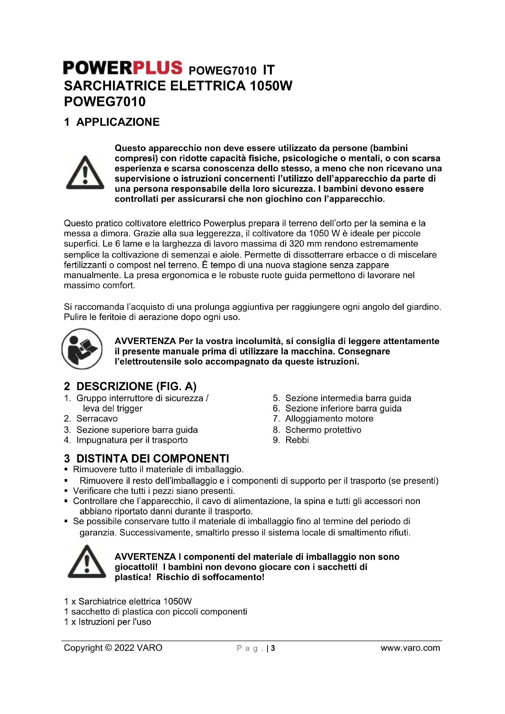 Rimuovere tutto il materiale di imballaggio. Rimuovere il resto dell’imballaggio e i componenti di supporto per il trasporto (se presenti) Verificare che tutti i pezzi siano presenti. Controllare che l’apparecchio, il cavo di alimentazione, la spina e tutti gli accessori non abbiano riportato danni durante il trasporto. Se possibile conservare tutto il materiale di imballaggio fino al termine del periodo di garanzia. Successivamente, smaltirlo presso il sistema locale di smaltimento rifiuti. AVVERTENZA I componenti del materiale di imballaggio non sono giocattoli! I bambini non devono giocare con i sacchetti di plastica! Rischio di soffocamento! 1 x Sarchiatrice elettrica 1050W 1 sacchetto di plastica con piccoli componenti 1 x Istruzioni per l'usoPOWEG7010 IT Copyright © 2022 VARO P a g . | 4 www.varo.com Se alcuni componenti risultano danneggiati o mancanti, rivolgersi al rivenditore.