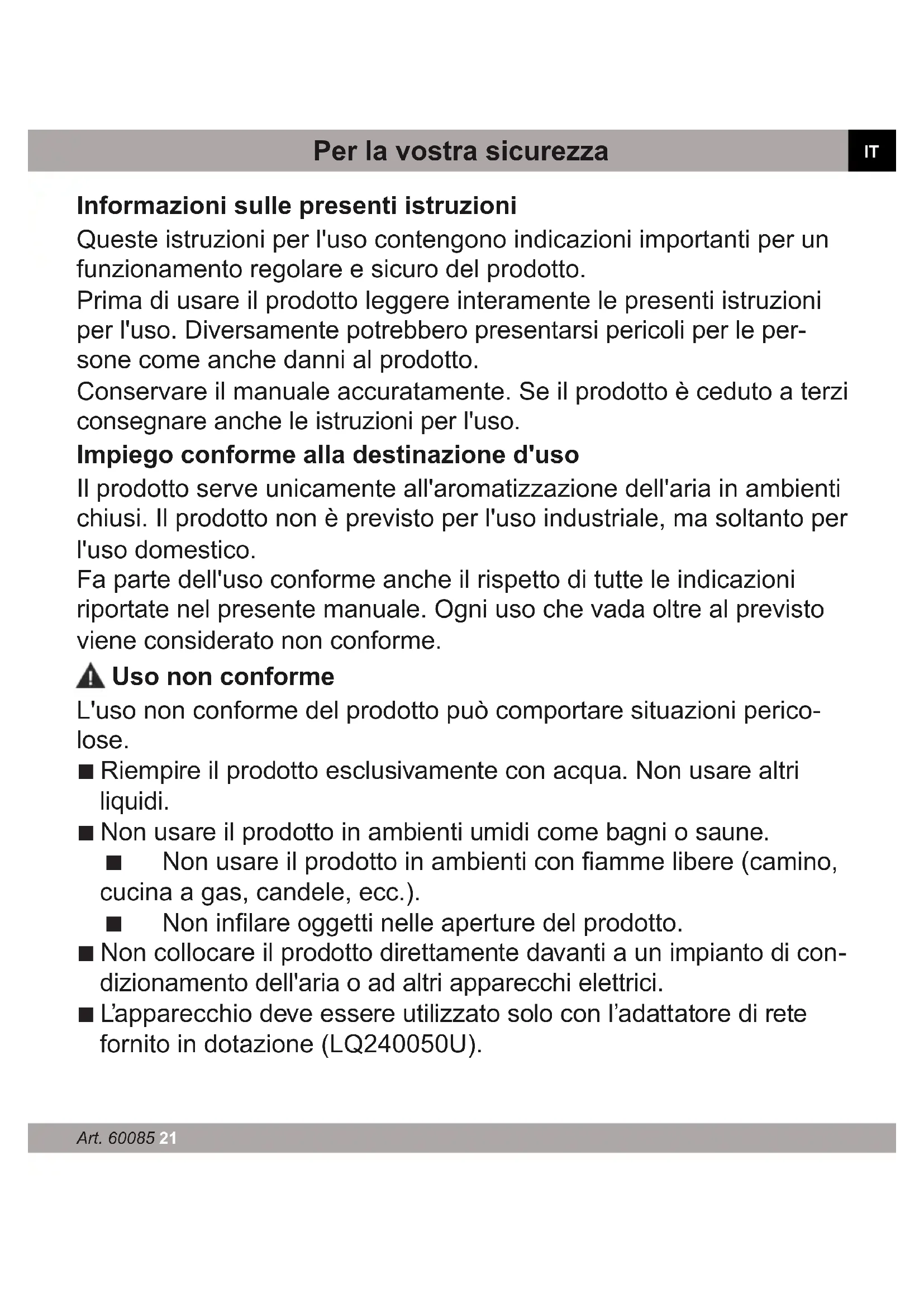 Il prodotto serve unicamente all'aromatizzazione dell'aria in ambienti chiusi. Il prodotto non è previsto per l'uso industriale, ma sostanto per l'uso domestico.