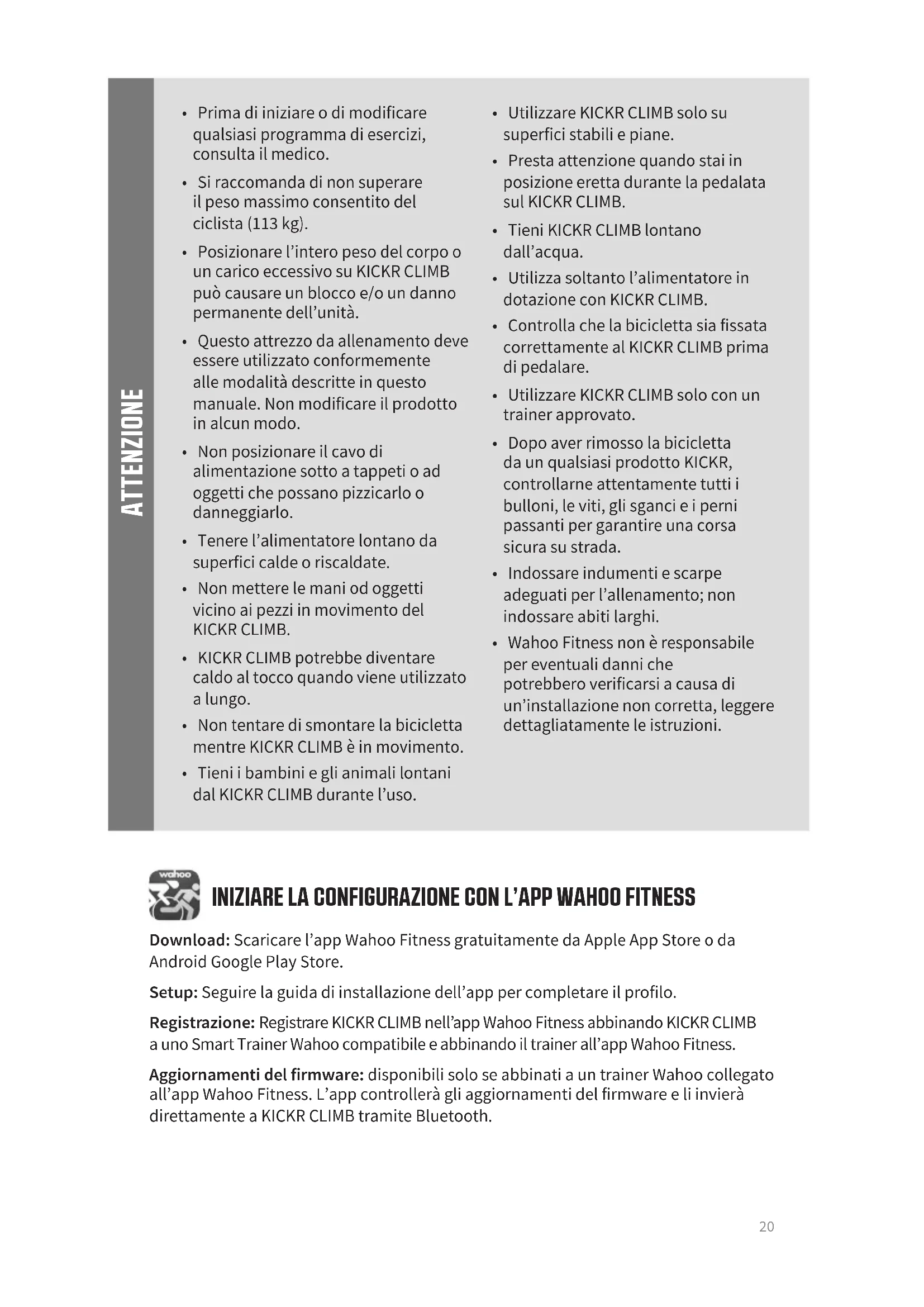 - Wahoo Fitness non è responsabile per eventuali danni che potrebbero verificarsi a causa di un’installazione non corretta, leggere dettagliatamente le istruzioni. ATTENZIONE INIZIARE LA CONFIGURAZIONE CON L’APP WAHOO FITNESS Download: Scaricare l’app Wahoo Fitness gratuitamente da Apple App Store o da Android Google Play Store. Setup: Seguire la guida di installazione dell’app per completare il profilo. Registrazione: Registrare KICKR CLIMB nell’app Wahoo Fitness abbinando KICKR CLIMB a uno Smart Trainer Wahoo compatibile e abbinando il trainer all’app Wahoo Fitness. Aggiornamenti del firmware: disponibili solo se abbinati a un trainer Wahoo collegato all’app Wahoo Fitness. L’app controllerà gli aggiornamenti del firmware e li invierà direttamente a KICKR CLIMB tramite Bluetooth.21 Passaggio 2: installare la bicicletta su un trainer approvato, consultare la guida rapida del trainer per le istruzioni di installazione. Passaggio 3: rimuovere la ruota anteriore della bicicletta e centrare KICKR CLIMB di fronte alla forcella. Attenzione: per evitare di danneggiare la bicicletta, utilizzare KICKR CLIMB solo con un Wahoo Trainers approvato. Per un elenco completo dei trainer approvati, visita www.wahoofitness.com/support
