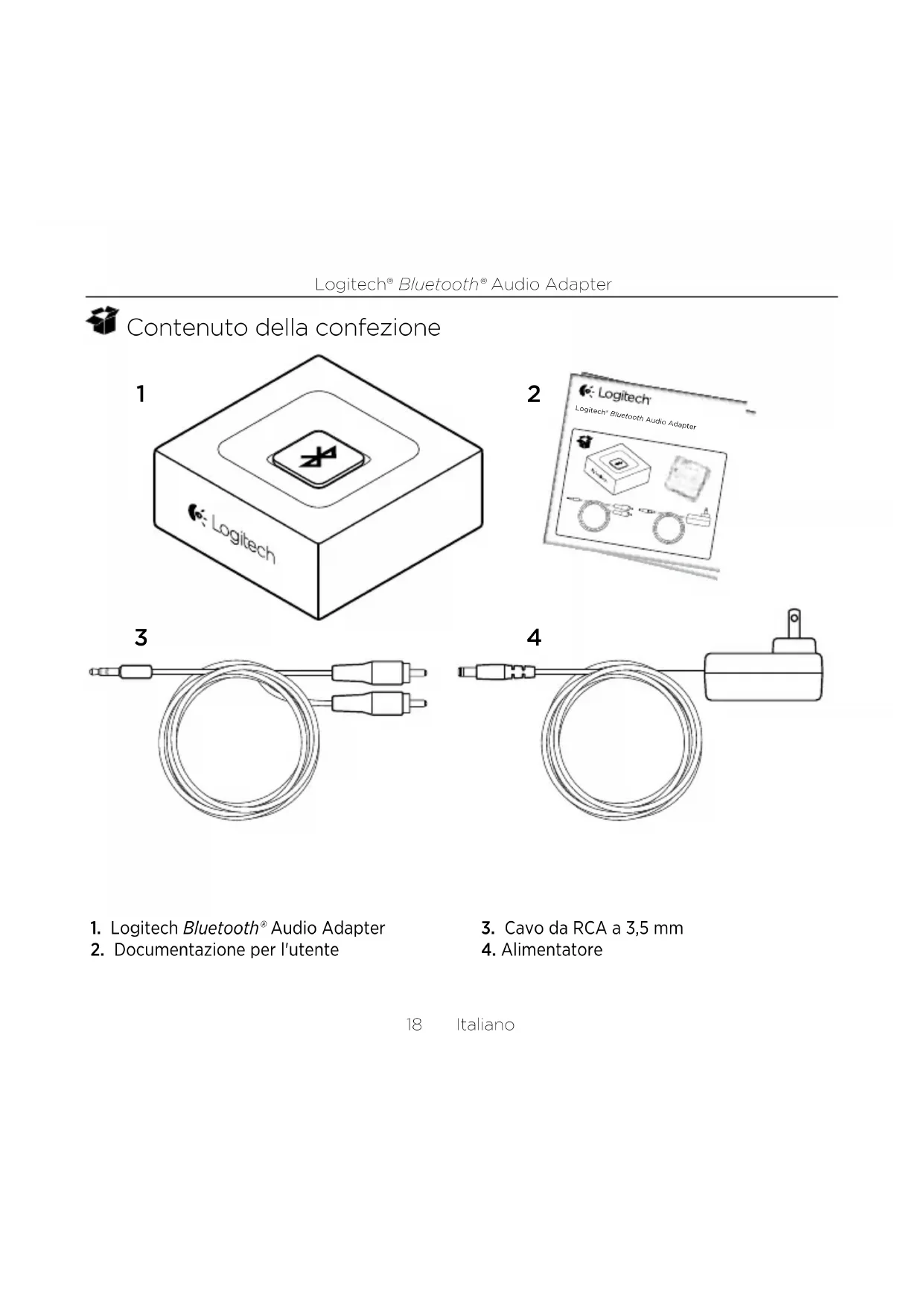 Scarica le istruzioni per il tuo Ricevitore Bluetooth in formato PDF gratuitamente! Trova il tuo manuale Bluetooth Audio Adapter - LOGITECH e riprendi in mano il tuo dispositivo elettronico. In questa pagina sono pubblicati tutti i documenti necessari per l'utilizzo del tuo dispositivo. Bluetooth Audio Adapter del marchio LOGITECH.