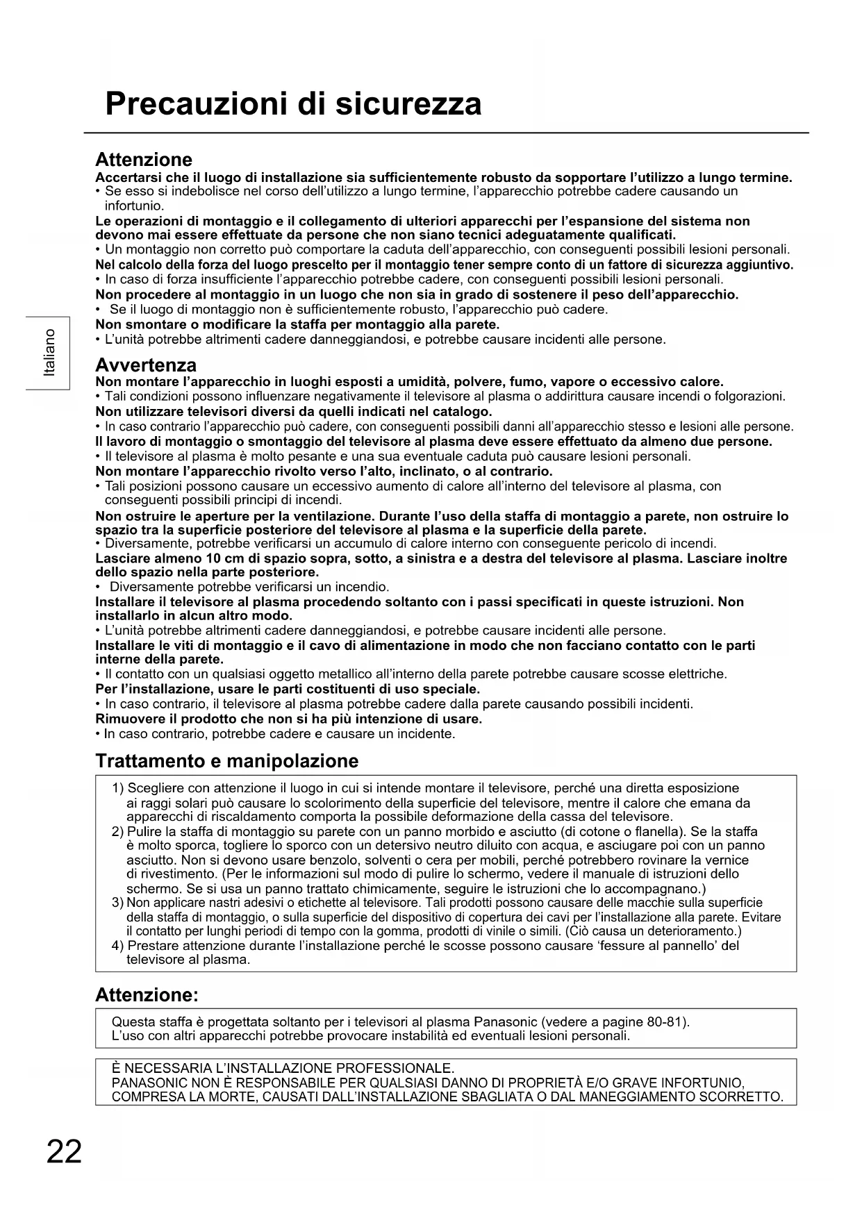 televisore al plasma. Attenzione: Questa staffa è progettata soltanto per i televisori al plasma Panasonic (vedere a pagine 80-81). L’uso con altri apparecchi potrebbe provocare instabilità ed eventuali lesioni personali. È NECESSARIA L’INSTALLAZIONE PROFESSIONALE. PANASONIC NON È RESPONSABILE PER QUALSIASI DANNO DI PROPRIETÀ E/O GRAVE INFORTUNIO, COMPRESA LA MORTE, CAUSATI DALL’INSTALLAZIONE SBAGLIATA O DAL MANEGGIAMENTO SCORRETTO. Precauzioni di sicurezza23 Italiano Parti [ Le immagini mostrate in questo manuale sono soltanto a scopo illustrativo.] Precauzioni per il montaggio della staffa alla parete ♦ La staffa per il montaggio alla parete serve ad applicare il televisore al plasma ad una parete verticale per facilitarne la visione. Non montare l’apparecchio su pareti che non siano verticali. ♦ Per garantire un corretto funzionamento del televisore al plasma e prevenire possibili complicazioni, evitare di montare l’apparecchio nei luoghi seguenti. • nelle vicinanze di polverizzatori di acqua antincendio, o di rivelatori di fumo • in luoghi che possano trovarsi sottoposti a vibrazioni o urti • nelle vicinanze di cavi ad alta tensione o di dispositivi che forniscono energia elettrica • vicino a sorgenti magnetiche, calde, di vapore acqueo o fuligginose • in luoghi esposti a getti d’aria provenienti da apparecchi di riscaldamento • dove si potrebbero formare gocce di condensa da un climatizzatore o altra unità ♦ Procedere al montaggio usando le opportune tecniche adatte alla struttura ed al materiale della parete sulla quale si effettua il montaggio. ♦ Per il montaggio della staffa alla parete, usare viti di con un diametro nominale di 6 mm, disponibili in commercio e adatte al materiale della parete (legno, struttura in acciaio, cemento, ecc.). ♦ Collegare il cavo di alimentazione del televisore al plasma ad una presa di corrente alternata di rete facilmente accessibile. ♦ Fornire una ventilazione adeguata, in modo che la temperatura dell’ambiente nel quale si trova ubicato l’apparecchio non superi i 40 °C. In caso contrario l’interno dell’apparecchio potrebbe surriscaldarsi, con conseguenti possibili disfunzioni. ♦ Stendere una coperta o panno morbidi sul pavimento in modo che il televisore al plasma e il pavimento non rimangano segnati o graffiati durante il lavoro di montaggio e di installazione. ♦ Avvitando le parti, accertarsi che le viti non siano insufficientemente strette o strette eccessivamente. ♦ Fare attenzione alla sicurezza intorno quando si esegue il lavoro di montaggio e di installazione, o spostandosi durante il lavoro. ♦ Non installare il televisore al plasma sotto le lampade del soffitto (faretti, lampade alogene, ecc.). In caso contrario, il suo mobile potrebbe essere deformato o danneggiato dal calore. TY-WK5P1RW Staffa di montaggio alla parete (con angolazione regolabile) Parti usate per l’assemblaggio della staffa di montaggio su parete Accessorio superiore della base (1) Raccordo sinistro base staffa (1) Raccordo destro base staffa (1) Viti M5x10 di assemblaggio attrezzatura (4) Accessorio inferiore della base (1)Etichetta Parti usate per l’installazione Veduta dell’attrezzatura interamente montata Viti esagonali a testa conica M8x32 (4) Distanziatori (4) Rondelle dentate concave (4) M5x50 Vite per il fissaggio dell’unità (2) Distanziatori isolanti (4) Chiave per brugole (attrezzo in dotazione) (1)24 Italiano Procedura di montaggio [ Non si deve usare alcun altro metodo diverso da quello specificato.]