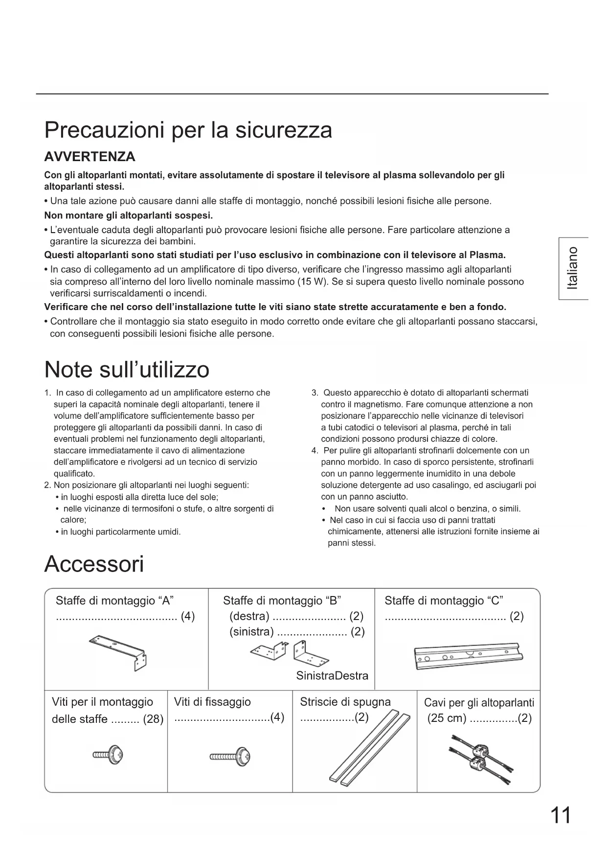 - Nel caso in cui si faccia uso di panni trattati chimicamente, attenersi alle istruzioni fornite insieme ai panni stessi. Note sull’utilizzo Staffe di montaggio “A” ...................................... (4) Staffe di montaggio “B” (destra) ....................... (2) (sinistra) ...................... (2) Viti per il montaggio delle staffe ......... (28) Striscie di spugna .................(2) Cavi per gli altoparlanti (25 cm) ...............(2) SinistraDestra Staffe di montaggio “C” ...................................... (2) Viti di fissaggio ..............................(4) Italiano TYSP65PV50069012095.indb11TYSP65PV50069012095.indb11 2005/09/1215:29:312005/09/1215:29:31Installazione Altoparlante (destro)Altoparlante (sinistro)Viti per il montaggio della staffaStaffe di montaggio “B” (destra)Staffe di montaggio “B” (sinistra)