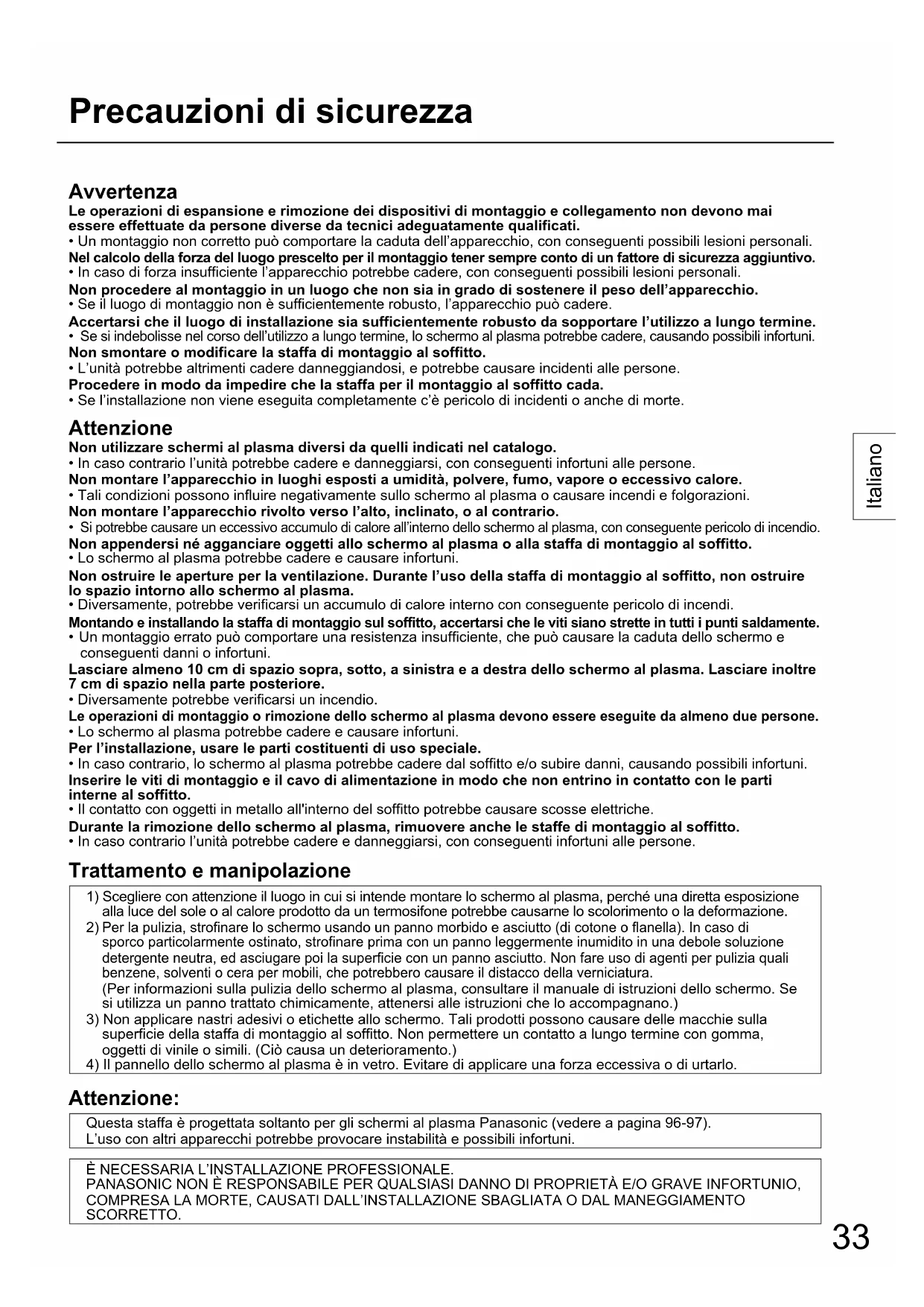 Attenzione: Questa staffa è progettata soltanto per gli schermi al plasma Panasonic (vedere a pagina 96-97). L’uso con altri apparecchi potrebbe provocare instabilità e possibili infortuni. È NECESSARIA L’INSTALLAZIONE PROFESSIONALE. PANASONIC NON È RESPONSABILE PER QUALSIASI DANNO DI PROPRIETÀ E/O GRAVE INFORTUNIO, COMPRESA LA MORTE, CAUSATI DALL’INSTALLAZIONE SBAGLIATA O DAL MANEGGIAMENTO SCORRETTO.34 Italiano [Le immagini mostrate in questo manuale sono soltanto a scopo illustrativo.]