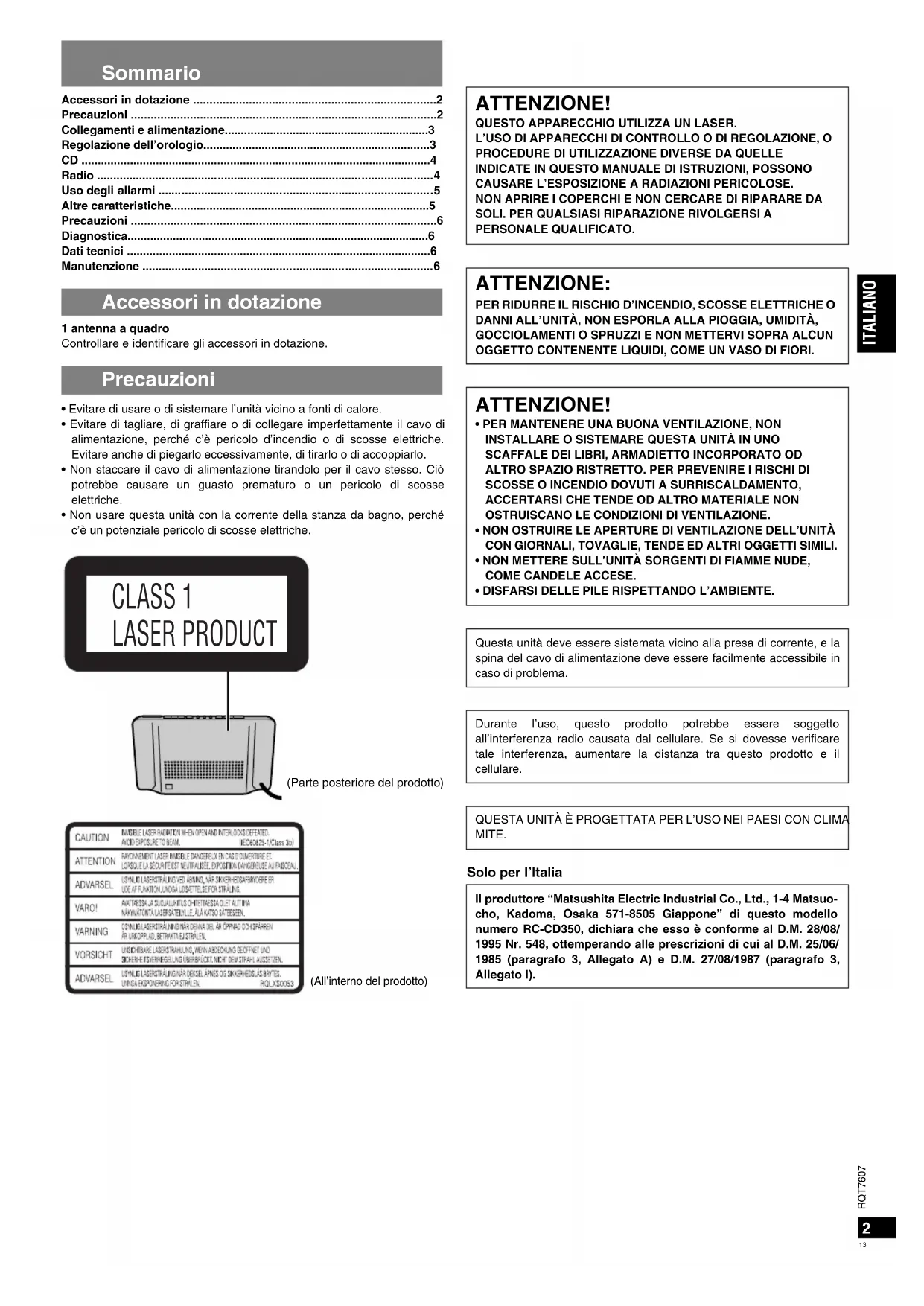 - PER MANTENERE UNA BUONA VENTILAZIONE, NON INSTALLARE O SISTEMARE QUESTA UNITÀ IN UNO SCAFFALE DEI LIBRI, ARMADIETTO INCORPORATO OD ALTRO SPAZIO RISTRETTO. PER PREVENIRE I RISCHI DI SCOSSE O INCENDIO DOVUTI A SURRISCALDAMENTO, ACCERTARSI CHE TENDE OD ALTRO MATERIALE NON OSTRUISCANO LE CONDIZIONI DI VENTILAZIONE. • NON OSTRUIRE LE APERTURE DI VENTILAZIONE DELL’UNITÀ CON GIORNALI, TOVAGLIE, TENDE ED ALTRI OGGETTI SIMILI. • NON METTERE SULL’UNITÀ SORGENTI DI FIAMME NUDE, COME CANDELE ACCESE. • DISFARSI DELLE PILE RISPETTANDO L’AMBIENTE.Questa unità deve essere sistemata vicino alla presa di corrente, e laspina del cavo di alimentazione deve essere facilmente accessibile incaso di problema.Durante l’uso, questo prodotto potrebbe essere soggettoall’interferenza radio causata dal cellulare. Se si dovesse verificaretale interferenza, aumentare la distanza tra questo prodotto e ilcellulare.QUESTA UNITÀ È PROGETTATA PER L’USO NEI PAESI CON CLIMAMITE.Il produttore “Matsushita Electric Industrial Co., Ltd., 1-4 Matsuo-cho, Kadoma, Osaka 571-8505 Giappone” di questo modellonumero RC-CD350, dichiara che esso è conforme al D.M. 28/08/1995 Nr. 548, ottemperando alle prescrizioni di cui al D.M. 25/06/1985 (paragrafo 3, Allegato A) e D.M. 27/08/1987 (paragrafo 3,Allegato I). 2RQT7607