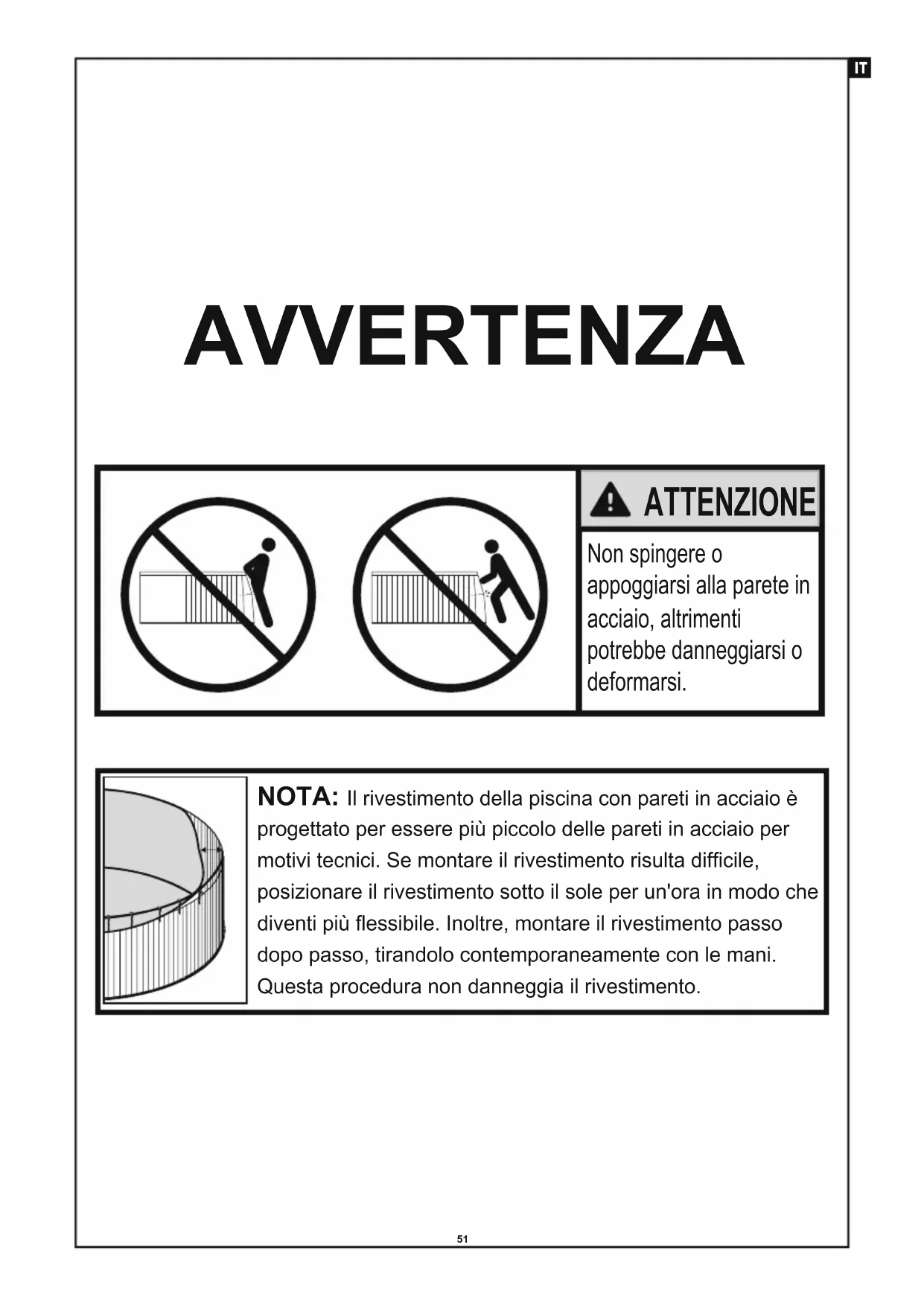 MANUALE D'USO Leggere attentamente, comprendere e seguire tutte le informazioni in questo manuale prima di installare ed utilizzare la piscina. Queste avvertenze, istruzioni e linee guida di sicurezza trattano alcuni rischi comuni dello svago in acqua, ma non possono coprire tutti i rischi e pericoli in tutti i casi. Fare sempre attenzione e usare buon senso e giudizio durante i giochi in piscina. Conservare questo opuscolo per futuri riferimenti. Sicurezza dei non nuotatori- È necessaria la sorveglianza continua, attiva e vigile dei nuotatori poco esperti e non nuotatori da parte di un adulto competente (ricordando che i bambini sotto i cinque anni sono a più alto rischio di annegamento).- Designare un adulto competente che sorvegli la piscina ad ogni utilizzo.- I nuotatori poco esperti e i non nuotatori devono indossare dispositivi di protezione individuale durante l'uso della piscina.- Quando la piscina è inutilizzata o non sorvegliata, rimuovere tutti i giocattoli dalla piscina e dai suoi dintorni per evitare di attirare i bambini verso la piscina. Dispositivi di sicurezza- Per evitare il rischio di annegamento dei bambini, si raccomanda di proteggere l'accesso alla piscina con un dispositivo di sicurezza. Al fine di evitare che i bambini si arrampichino dalla valvola di ingresso e di uscita, si raccomanda di installare una barriera (e proteggere tutte le porte e le finestre, se possibile) per impedire l'accesso non autorizzato alla piscina.- Barriere, coperture e allarmi per piscine, o simili dispositivi di sicurezza sono utili, ma non possono sostituire la sorveglianza continua e competente di un adulto. Attrezzatura di sicurezza- Si raccomanda di tenere le attrezzature di sicurezza (ad es. galleggianti) in prossimità della piscina.- Tenere un telefono funzionante e un elenco di numeri di emergenza vicino alla piscina. Uso sicuro della piscina- Incoraggiare tutti gli utenti e in particolare i bambini ad imparare a nuotare.- Imparare le tecniche di primo soccorso (rianimazione cardiopolmonare - RCP) e aggiornare regolarmente le proprie conoscenze. Ciò può fare la differenza e salvare vite umane in caso di emergenza.- Informare tutti gli utenti della piscina, compresi i bambini, delle procedure da adottare in caso di emergenza.- Non tuffarsi in bacini d'acqua poco profondi. Ciò potrebbe causare lesioni gravi, anche fatali.- Non usare la piscina se sono stati assunti alcol o farmaci che potrebbero compromettere la capacità di utilizzare in modo sicuro la piscina.- Quando si utilizzano le coperture per piscina, rimuoverle completamente dalla superficie dell'acqua prima di entrare in piscina.- Proteggere gli occupanti della piscina da malattie legate all'acqua, mantenendo l'acqua della piscina trattata e in buone condizioni igieniche. Consultare le linee guida per il trattamento dell'acqua contenute nel manuale utente.- Conservare i prodotti chimici (es. trattamento dell'acqua, prodotti per la pulizia e la disinfezione) fuori dalla portata dei bambini.- Utilizzare la segnaletica come indicato di seguito. La segnaletica deve essere esposta in modo visibile entro il raggio di 2 m dalla piscina.- Quando i bambini sono in acqua, sorvegliarli continuamente. Non tuffarsi.- Le scalette rimovibili devono essere collocate su una superficie orizzontale.- Indipendentemente dai materiali utilizzati per la costruzione della piscina, le superfici accessibili devono essere controllate regolarmente per evitare infortuni.- Controllare regolarmente i bulloni e le viti; rimuovere schegge o bordi appuntiti per evitare lesioni. ATTENZIONE: Non lasciare la piscina svuotata all'aperto. La piscina vuota rischia di deformarsi e/o di spostarsi a causa del vento.- Se è presente una pompa filtrante, fare riferimento al relativo manuale di istruzioni.AVVERTENZA! Non adoperare la pompa quando le persone si trovano nella piscina!- Se è presente una scaletta, fare riferimento al relativo manuale di istruzioni. AVVERTENZA! Per utilizzare la piscina è obbligatorio attenersi alle istruzioni relative alla sicurezza riportate nella guida per l'uso e la manutenzione. Al fine di prevenire l'annegamento o altre gravi lesioni, prestare particolare attenzione alla possibilità di accesso inatteso alla piscina da parte di bambini sotto i 5 anni rendendo sicuro l'accesso alla stessa e, durante il bagno, tenerli sotto la costante sorveglianza di un adulto. Leggere attentamente e conservare per futuri riferimenti ! AVVERTENZA !