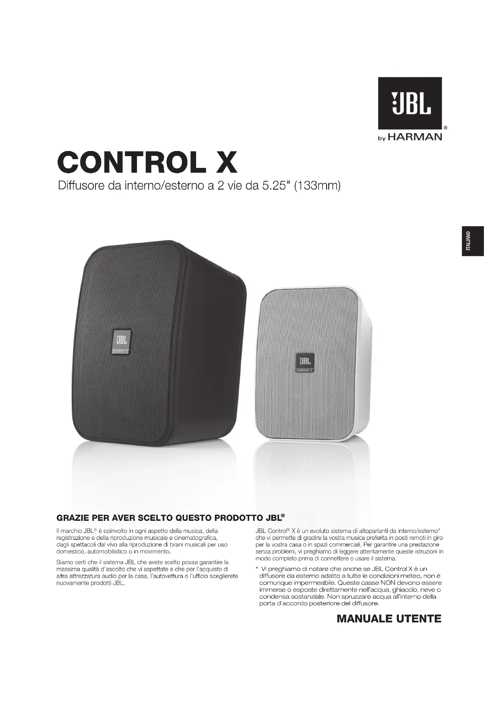 - Vi preghiamo di notare che anche se JBL Control X è un diffusore da esterno adatto a tutte le condizioni meteo, non è comunque impermeabile. Queste casse NON devono essere immerse o esposte direttamente nell’acqua, ghiaccio, neve o condensa sostanziale. Non spruzzare acqua all’interno della porta d’accordo posteriore del diffusore. GRAZIE PER AVER SCELTO QUESTO PRODOTTO JBL