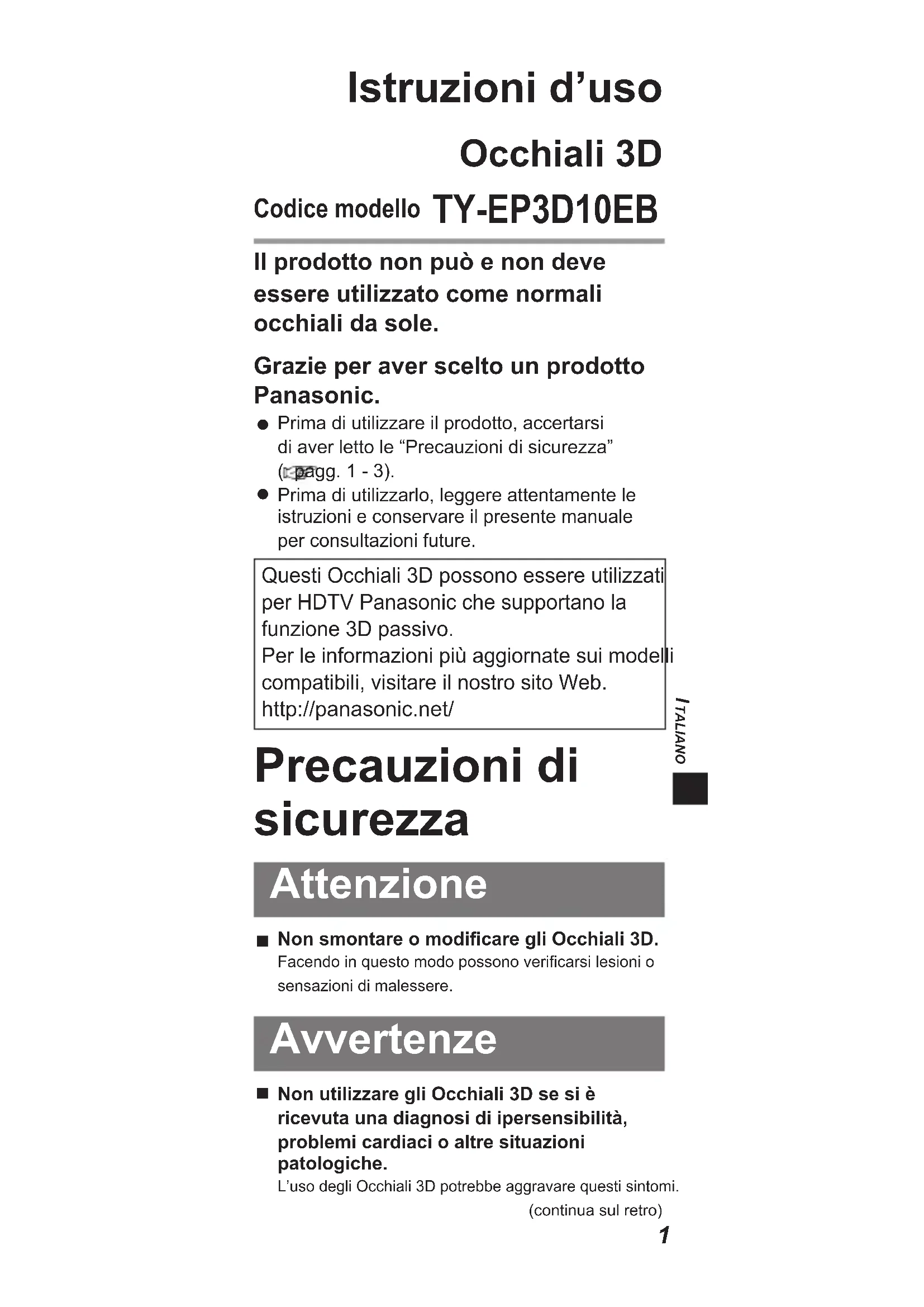Prima di utilizzarlo, leggere attentamente le istruzioni e conservare il presente manuale per consultazioni future.Questi Occhiali 3D possono essere utilizzati per HDTV Panasonic che supportano la funzione 3D passivo.Per le informazioni più aggiornate sui modelli compatibili, visitare il nostro sito Web.http://panasonic.net/ Precauzioni di sicurezza Attenzione