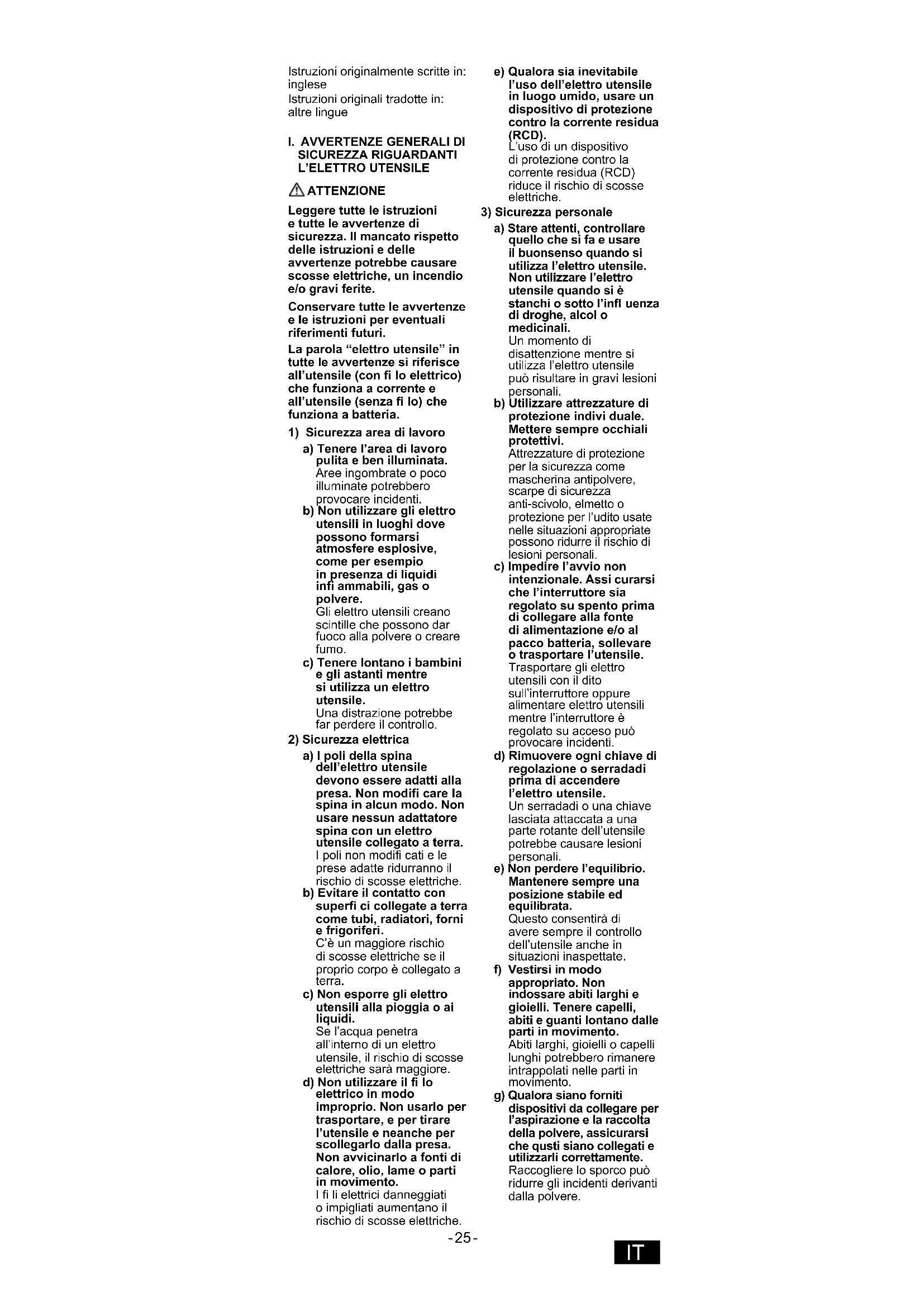 a) I poli della spina dell’elettro utensile devono essere adatti alla presa. Non modifi care la spina in alcun modo. Non usare nessun adattatore spina con un elettro utensile collegato a terra. I poli non modifi cati e le prese adatte ridurranno il rischio di scosse elettriche. b) Evitare il contatto con superfi ci collegate a terra come tubi, radiatori, forni e frigoriferi. C’è un maggiore rischio di scosse elettriche se il proprio corpo è collegato a terra. c) Non esporre gli elettro utensili alla pioggia o ai liquidi. Se l’acqua penetra all’interno di un elettro utensile, il rischio di scosse elettriche sarà maggiore. d) Non utilizzare il fi lo elettrico in modo improprio. Non usarlo per trasportare, e per tirare l’utensile e neanche per scollegarlo dalla presa. Non avvicinarlo a fonti di calore, olio, lame o parti in movimento. I fi li elettrici danneggiati o impigliati aumentano il rischio di scosse elettriche. e) Qualora sia inevitabile l’uso dell’elettro utensile in luogo umido, usare un dispositivo di protezione contro la corrente residua (RCD). L’uso di un dispositivo di protezione contro la corrente residua (RCD) riduce il rischio di scosse elettriche.