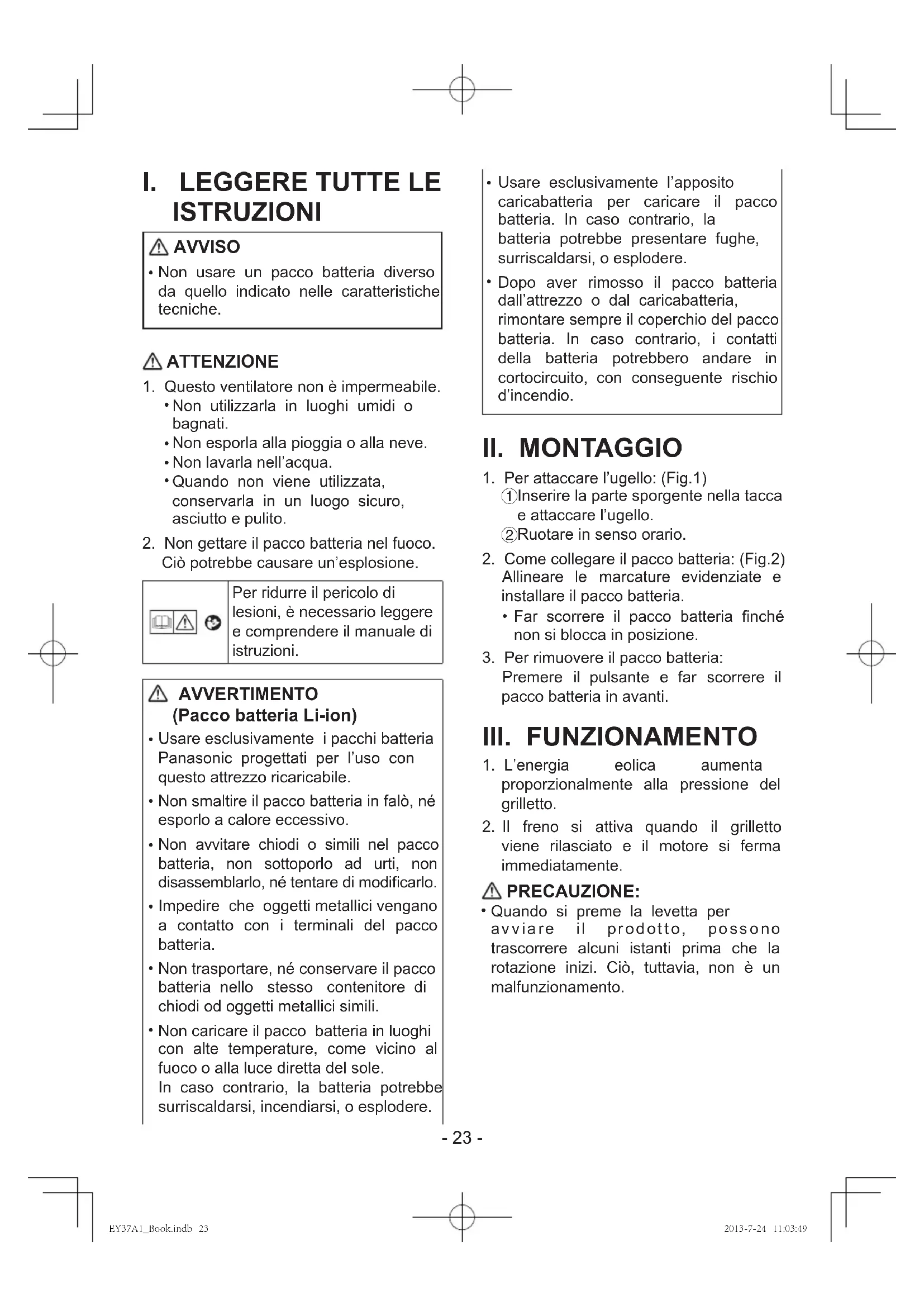 assicurarsi che il luogo di lavoro sia ben ventilato. Durata del pacco batteria Le batterie ricaricabili posseggono una durata limitata. Se il tempo di funzionamento diventa estremamente breve dopo la ricarica, sostituire il pacco batteria con uno nuovo. Riciclo batteria NOTA: Per ragioni relative alla protezione dell’ambiente e al riciclaggio dei materiali, assicurarsi che lo smaltimento Del prodotto avvenga in un luogo ufcialmente preposto a tale ne. EY37A1_Book.indb 24 2013-7-24 11:03:49- 25 - Precauzioni d’uso Terminali Coperchio pacco rossa Assicurarsi di usare il coperchio del pacco batteria Quando il pacco batteria non viene