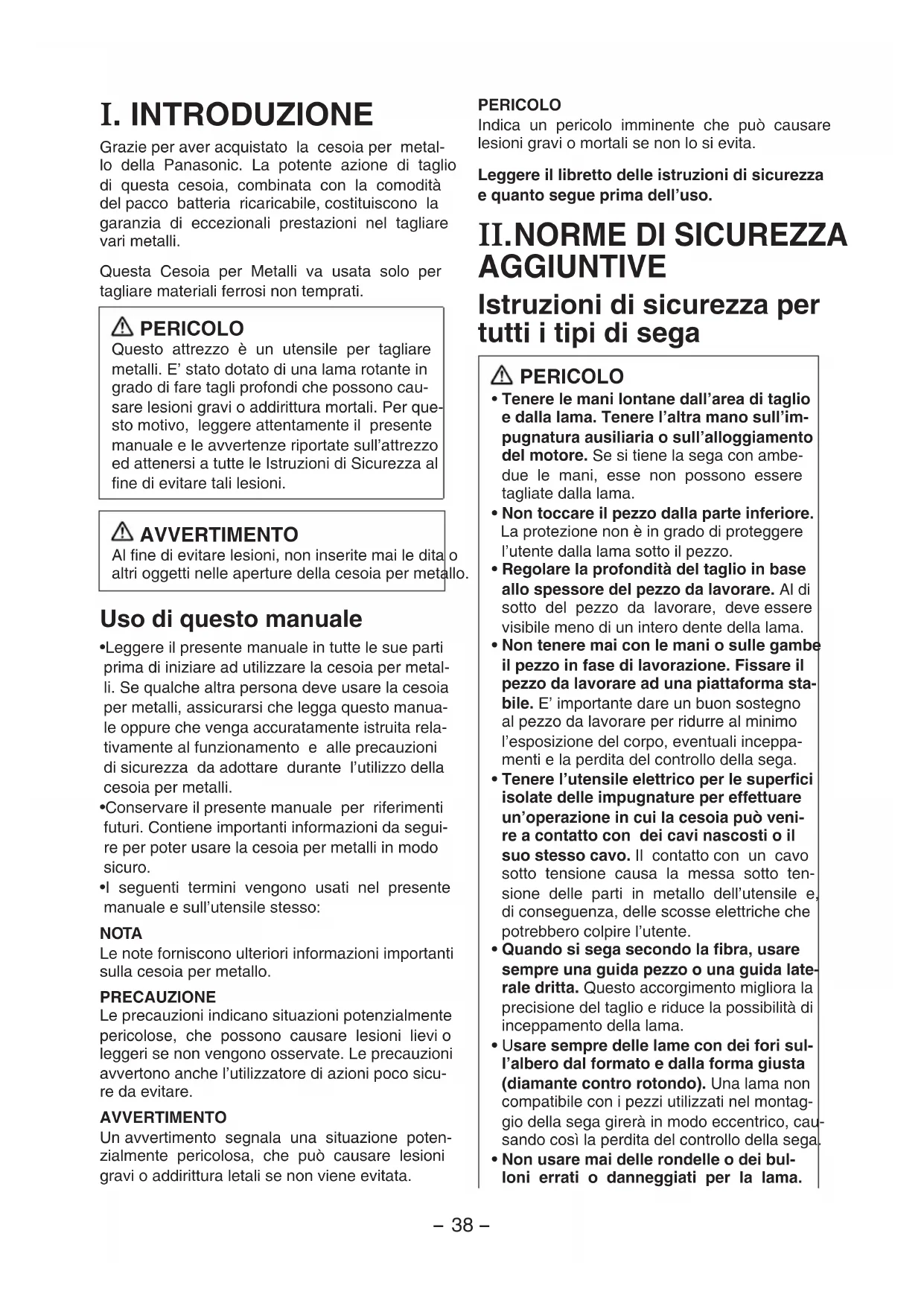 Grazie per aver acquistato la cesoia per metal-lo della Panasonic. La potente azione di taglio di questa cesoia, combinata con la comodità del pacco batteria ricaricabile, costituiscono la garanzia di eccezionali prestazioni nel tagliare vari metalli.Questa Cesoia per Metalli va usata solo per tagliare materiali ferrosi non temprati. PERICOLO Questo attrezzo è un utensile per tagliare metalli. E’ stato dotato di una lama rotante in grado di fare tagli profondi che possono cau-sare lesioni gravi o addirittura mortali. Per que-sto motivo, leggere attentamente il presente manuale e le avvertenze riportate sull’attrezzo ed attenersi a tutte le Istruzioni di Sicurezza al fine di evitare tali lesioni. AVVERTIMENTO Al fine di evitare lesioni, non inserite mai le dita o altri oggetti nelle aperture della cesoia per metallo. Uso di questo manuale