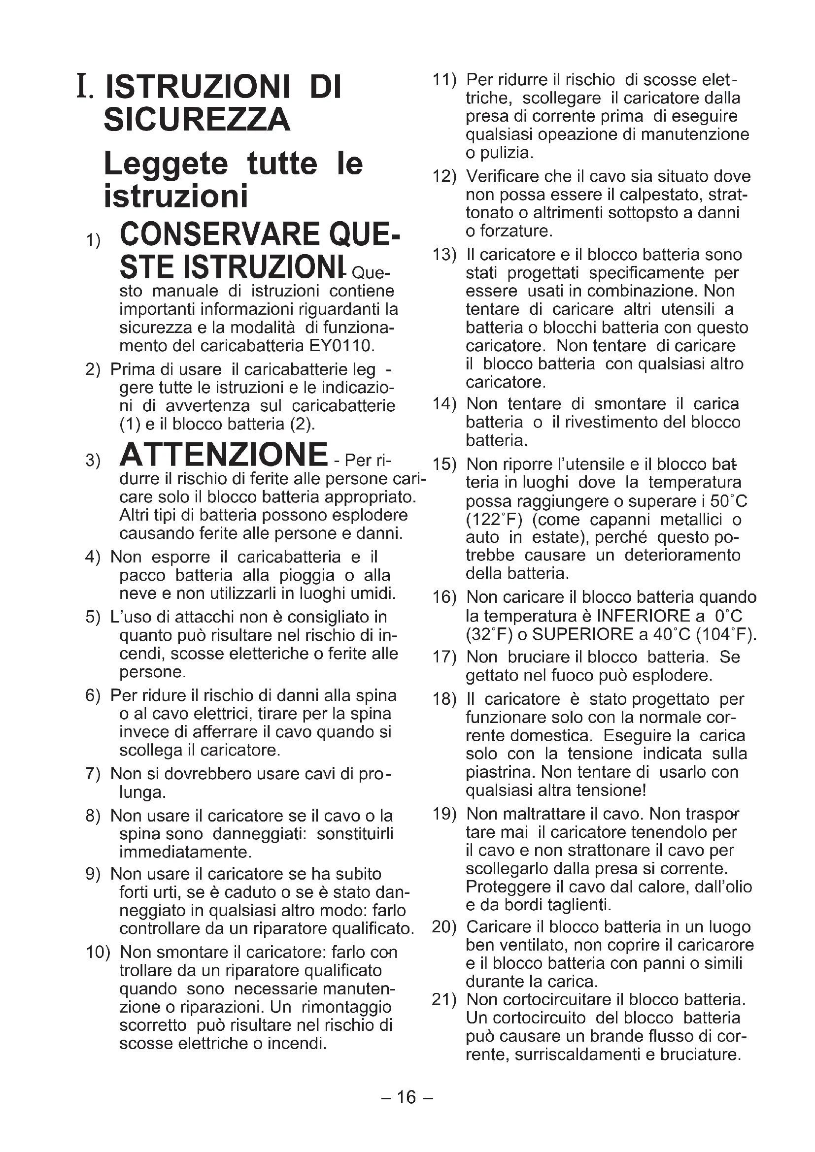 CONSERVARE QUE- STE ISTRUZIONI - Que- sto manuale di istruzioni contiene importanti informazioni riguardanti la sicurezza e la modalità di funziona- mento del caricabatteria EY0110.