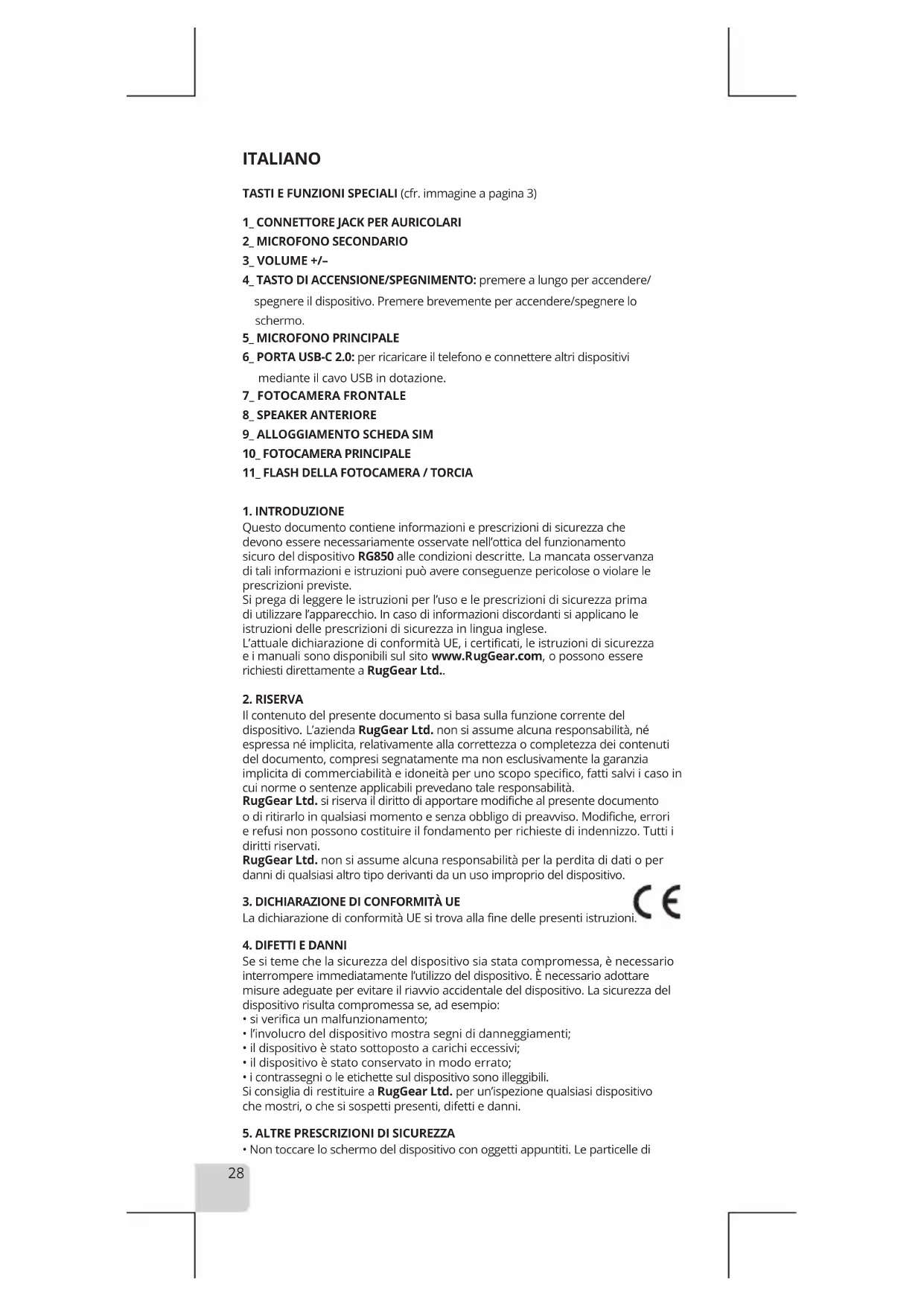 L'attuale dichiarazione di conformità UE, i certificati, le istruzioni di sicurezza e i manuali sono disponibili sul sito www.RugGear.com, o possono essere richiesti direttamente a RugGear Ltd..