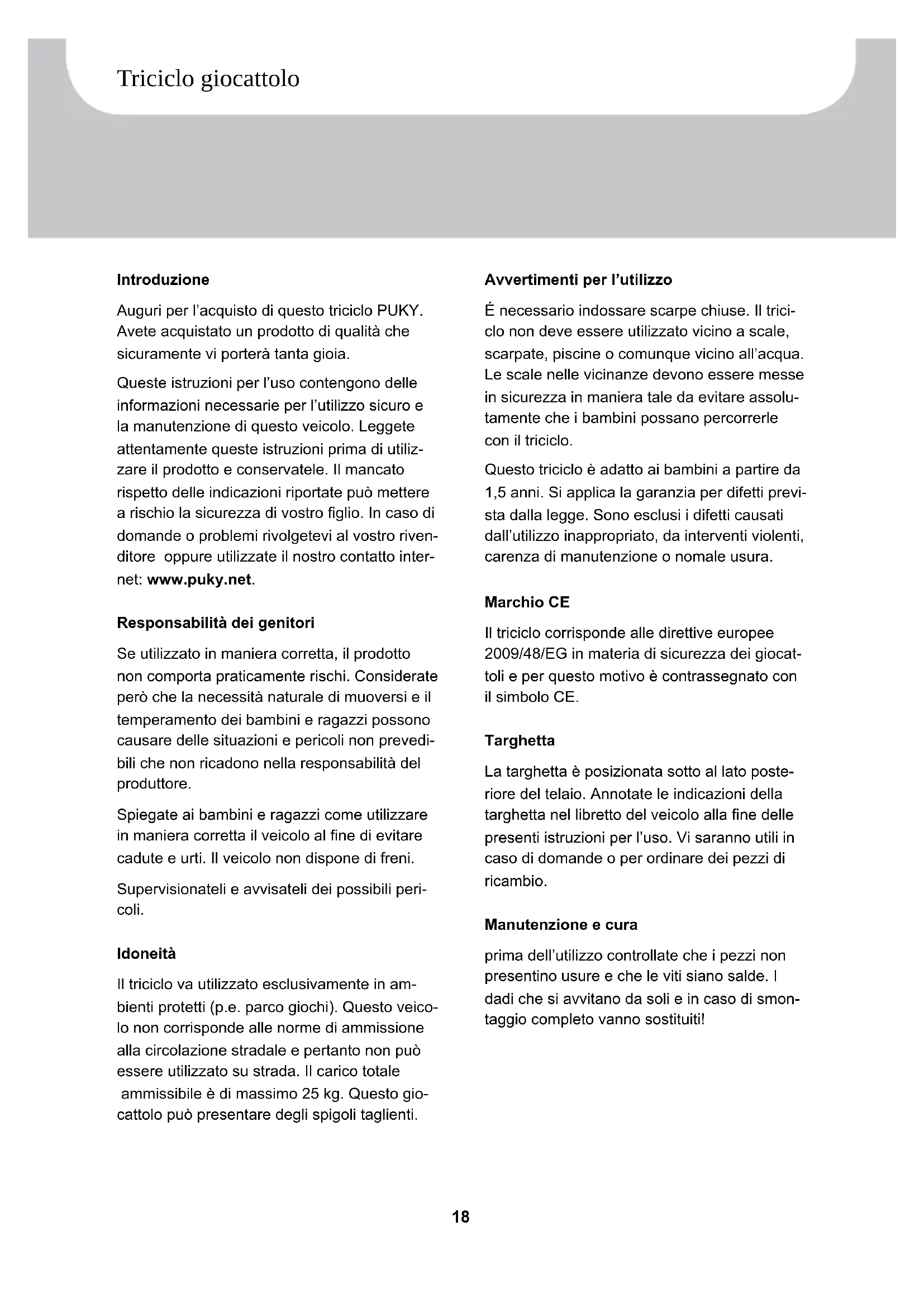 Queste istruzioni per l'uso contengono delle informazioni necessarie per l'utilizzo sicuro e la manutenzione di quello veicolo. Leggete attendamente queste istruzioni prima di utilizzare il prodotto e conservatele. Il mancato rispetto delle indicazioni riportate più monetere a rischio la sicurezza di:vostro figlio. In caso di domande o problemi rivolgetevi al:vostro rivenditore oppure utilizzate il nostroconto internet: www.puky.net.