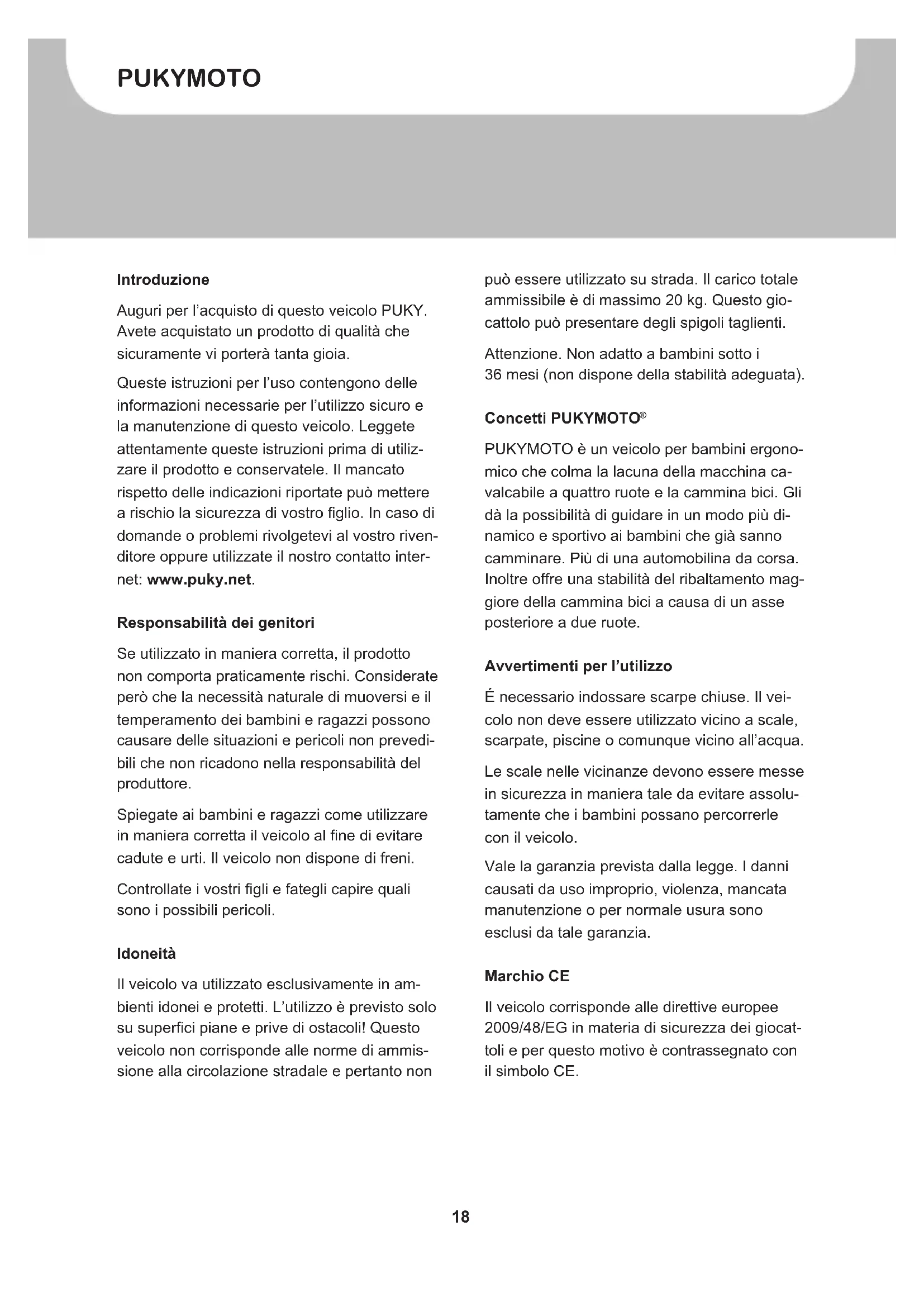 Queste istruzioni per l'uso contengono delle informazioni necessarie per l'utilizzo sicuro e la manutenzione di quello veicolo. Leggete attendamente queste istruzioni prima di utilizzare il prodotto e conservatele. Il mancato rispetto delle indicazioni riportate più monettere a rischio la sicurezza di:vostro figlio. In caso di domande o problemi rivolgetevi al:vostro rivenditore oppure utilizzate il nostro contatto internet: www.puky.net.