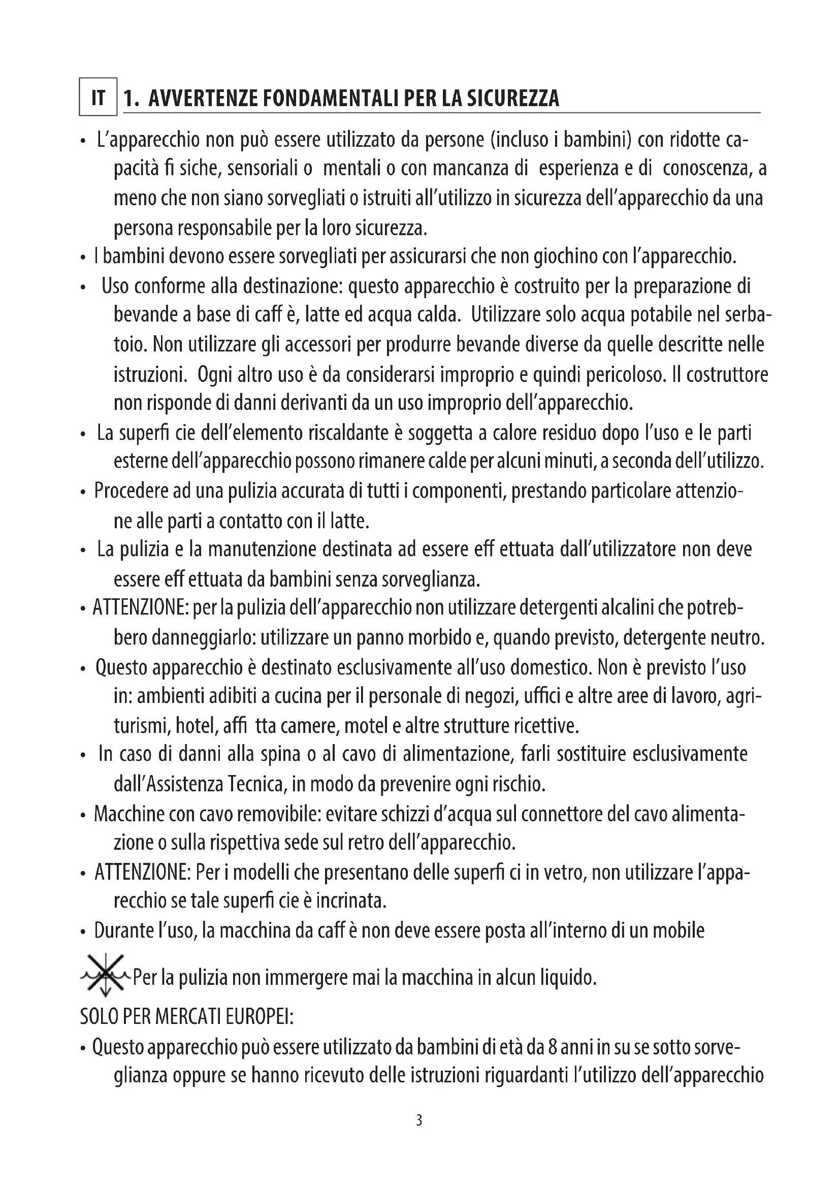 - Durante l’uso, la macchina da ca è non deve essere posta all’interno di un mobile Per la pulizia non immergere mai la macchina in alcun liquido. SOLO PER MERCATI EUROPEI:
