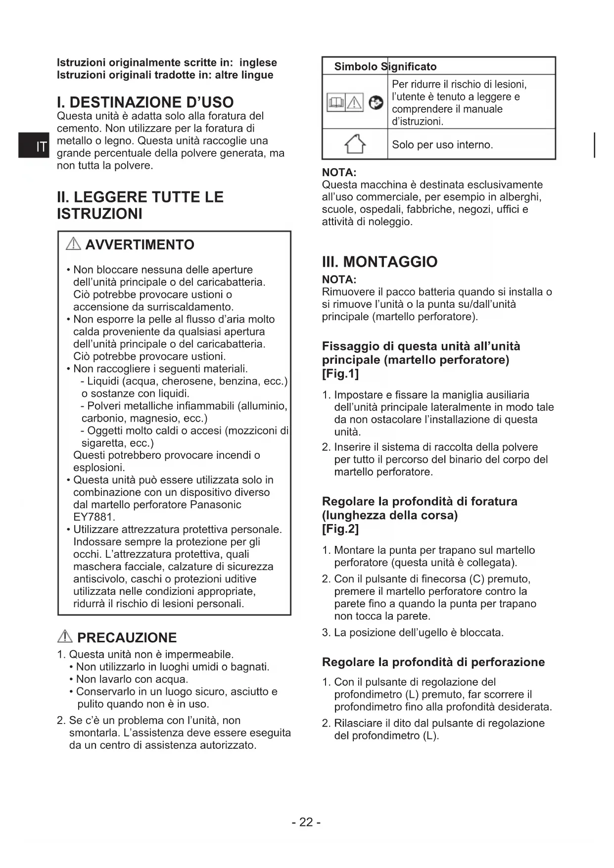 Modello N° EY9X400 Alimentazione unità Dal terminale dedicato di EY7881 Volume d’aria massimo 250 L/min Capacità di raccolta polvere 0,27 L Intervallo approssimativo di sostituzione del filtro 100 riempimenti Regolazione della profondità Corsa completa: 95 mm Profondità massima: 75 mm Punte per trapano disponibili Per il cemento Diametro di perforazione : Φ5 mm ~ Φ18 mm Lunghezza intera: 110 mm ~ 170 mm (Lunghezza effettiva: 50 mm ~ 110 mm) Dimensioni 330 mm × 227 mm × 85 mm (Solo questa unità) Peso 940 g (Solo questa unità. Vuoto) NOTA: Fare riferimento al catalogo generale più recente. Rumore e vibrazioni (Con martello perforatore Panasonic: EY7881) Livello pressione sonora (L