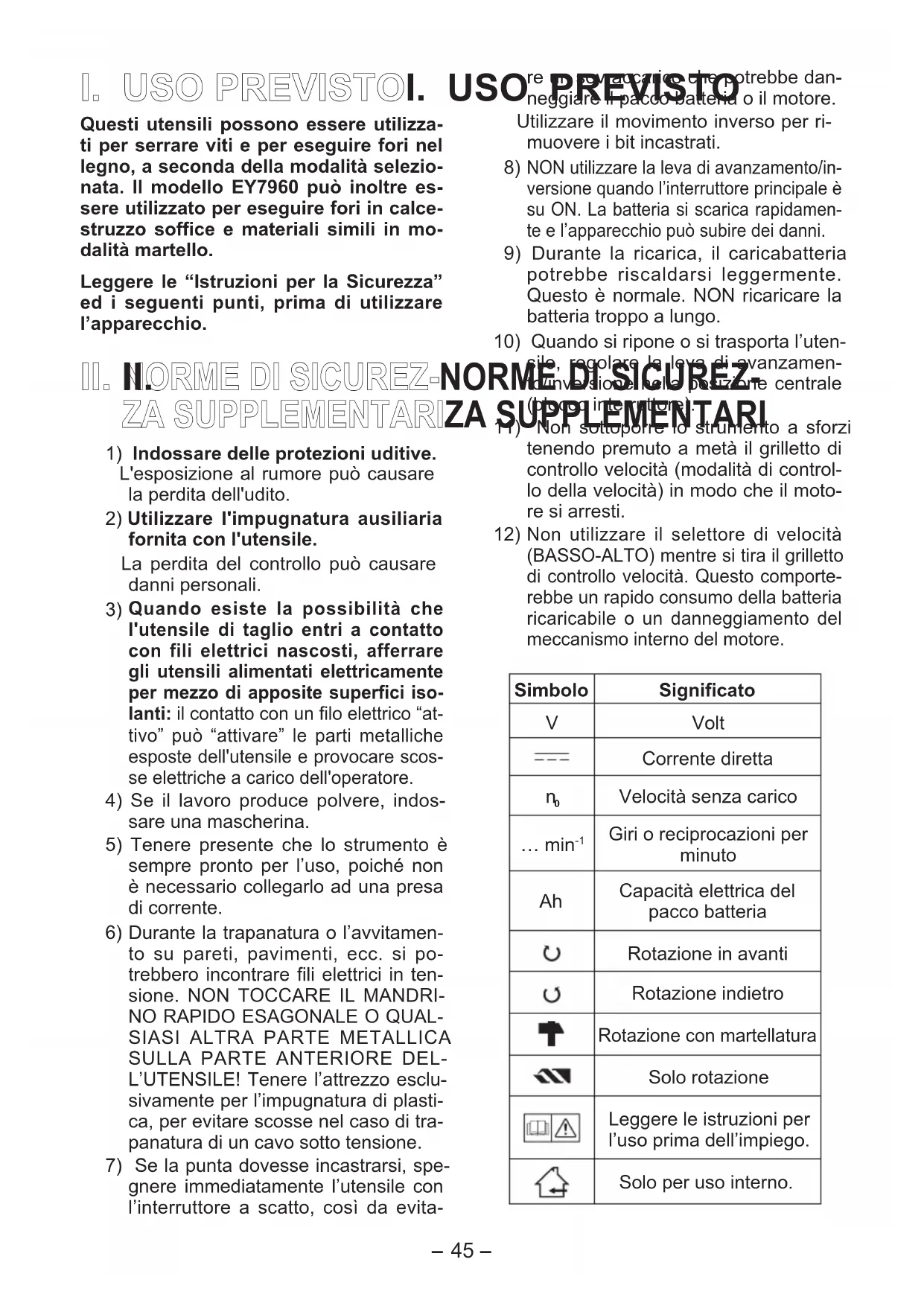 Questi utensili possono essere utilizza- ti per serrare viti e per eseguire fori nel legno, a seconda della modalità selezio- nata. Il modello EY7960 può inoltre es- sere utilizzato per eseguire fori in calce- struzzo soffice e materiali simili in mo- dalità martello. Leggere le “Istruzioni per la Sicurezza” ed i seguenti punti, prima di utilizzare l’apparecchio.