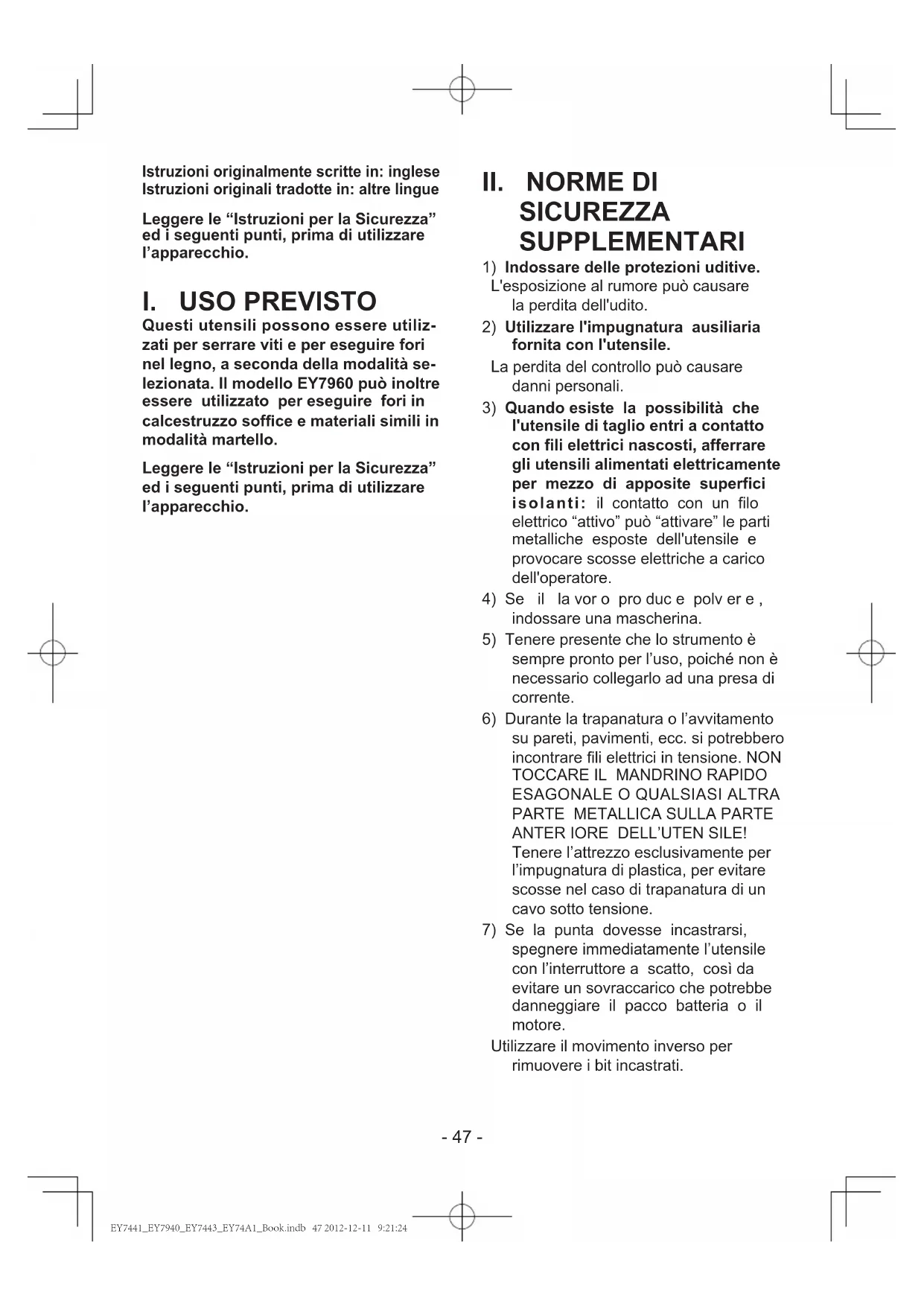 spegnere immediatamente l’utensile con l’interruttore a scatto, così da evitare un sovraccarico che potrebbe danneggiare il pacco batteria o il motore. Utilizzare il movimento inverso per rimuovere i bit incastrati. Istruzioni originalmente scritte in: inglese Istruzioni originali tradotte in: altre lingue Leggere le “Istruzioni per la Sicurezza” ed i seguenti punti, prima di utilizzare l’apparecchio. EY7441_EY7940_EY7443_EY74A1_Book.indb 47 2012-12-11 9:21:24- 48 -