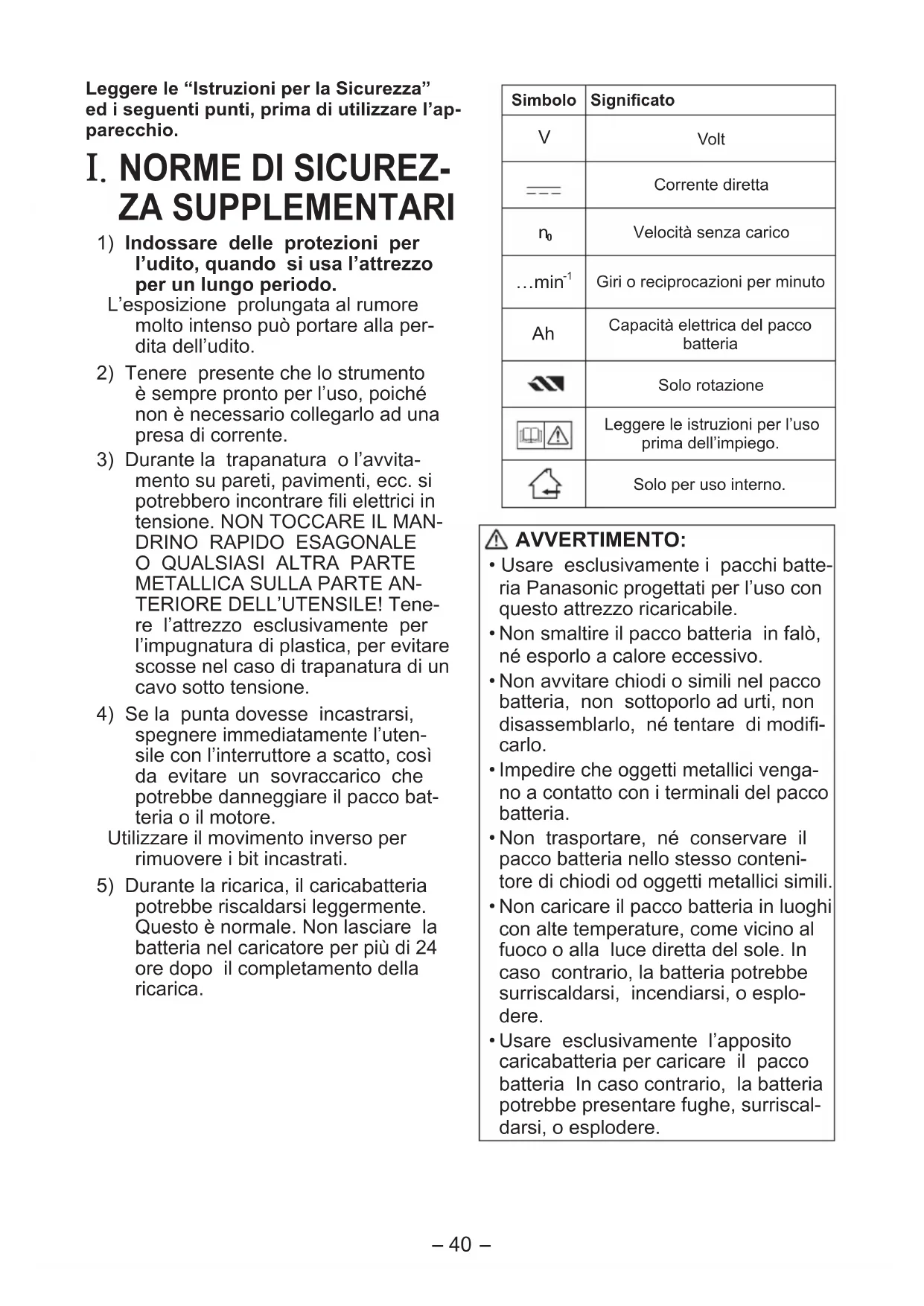 Giri o reciprocazioni per minuto Capacità elettrica del pacco batteriaSolo rotazioneLeggere le istruzioni per l’uso prima dell’impiego.Solo per uso interno. AVVERTIMENTO: