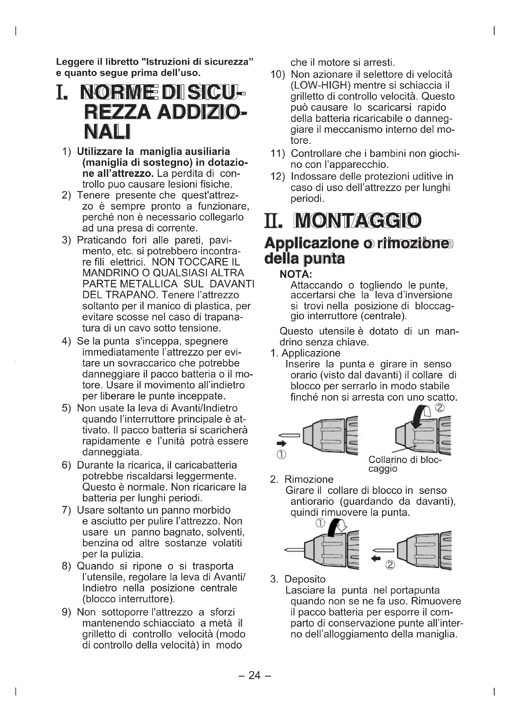 Attaccando o togliendo le punte, accertarsi che la leva d'inversione si trovi nella posizione di bloccaggio interrupttre (centrale).