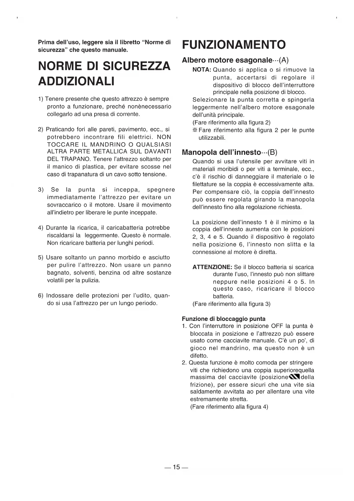 Fare riferimento alla figura 2 per le punte utilizzabili. Manopola dell’innesto···(B) Quando si usa l’utensile per avvitare viti in materiali moribidi o per viti a terminale, ecc., c’è il rischio di danneggiare il materiale o le filettature se la coppia è eccessivamente alta. Per compensare ciò, la coppia dell’innesto può essere regolata girando la manopola dell’innesto fino alla regolazione richiesta. La posizione dell’innesto 1 è il minimo e la coppia dell’innesto aumenta con le posizioni 2, 3, 4 e 5. Quando il dispositivo è regolato nella posizione 6, l’innesto non slitta e la connessione al motore è diretta. ATTENZIONE: Se il blocco batteria si scarica durante l’uso, l’innesto può non slittare neppure nelle posizioni 4 o 5. In questo caso, ricaricare il blocco batteria. (Fare riferimento alla figura 3) Funzione di bloccaggio punta