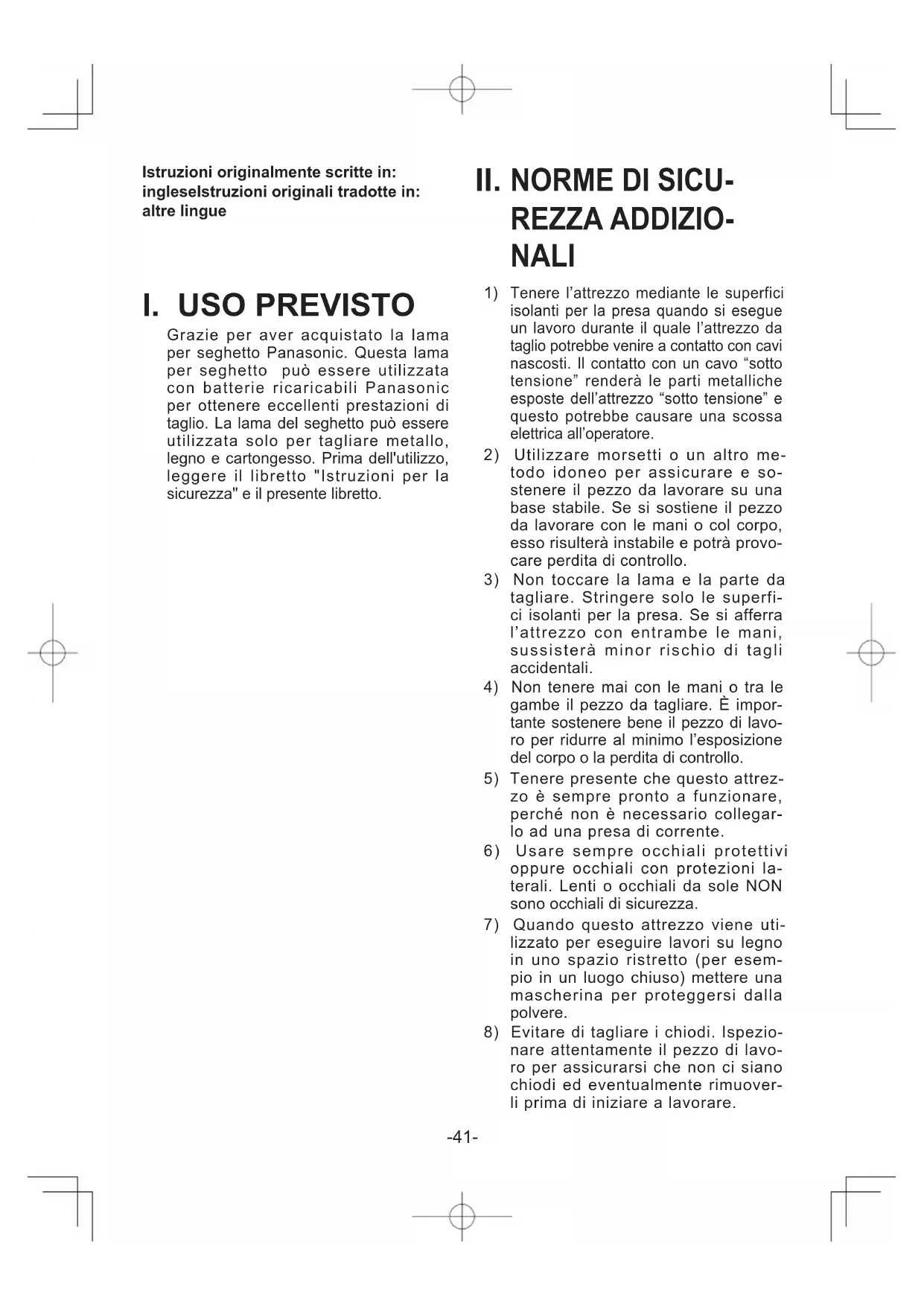 Grazie per aver acquistato la lama per seghetto Panasonic. Questa lama per seghetto può essere utilizzata con batterie ricaricabili Panasonic per ottenere eccellenti prestazioni di taglio. La lama del seghetto può essere utilizzata solo per tagliare metallo, legno e cartongesso. Prima dell'utilizzo, leggere il libretto "Istruzioni per la sicurezza" e il presente libretto. II.