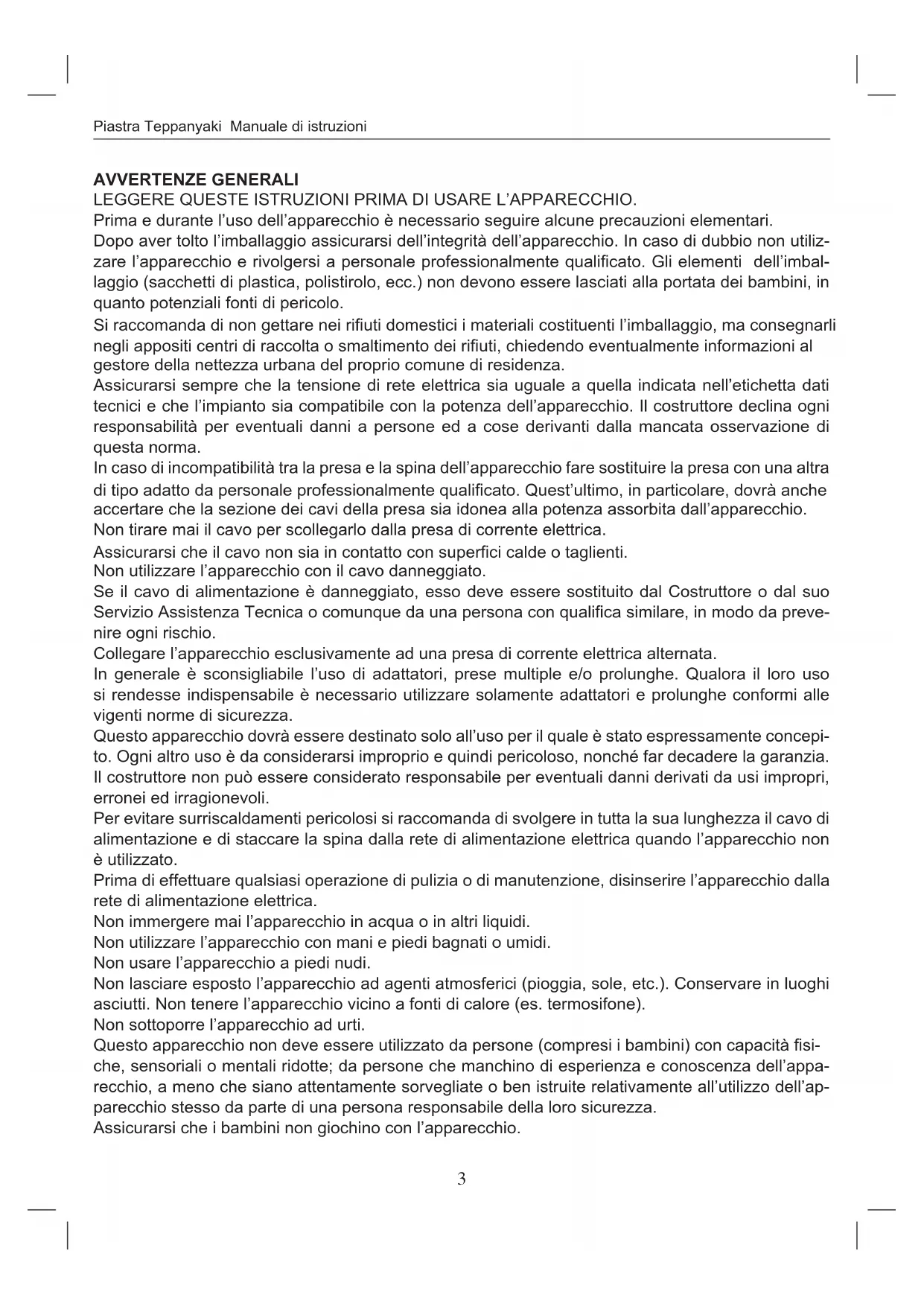 La piastra elettrica è concepito per il solo uso domestico e non deve essere adibito a uso commerciale o industriale.