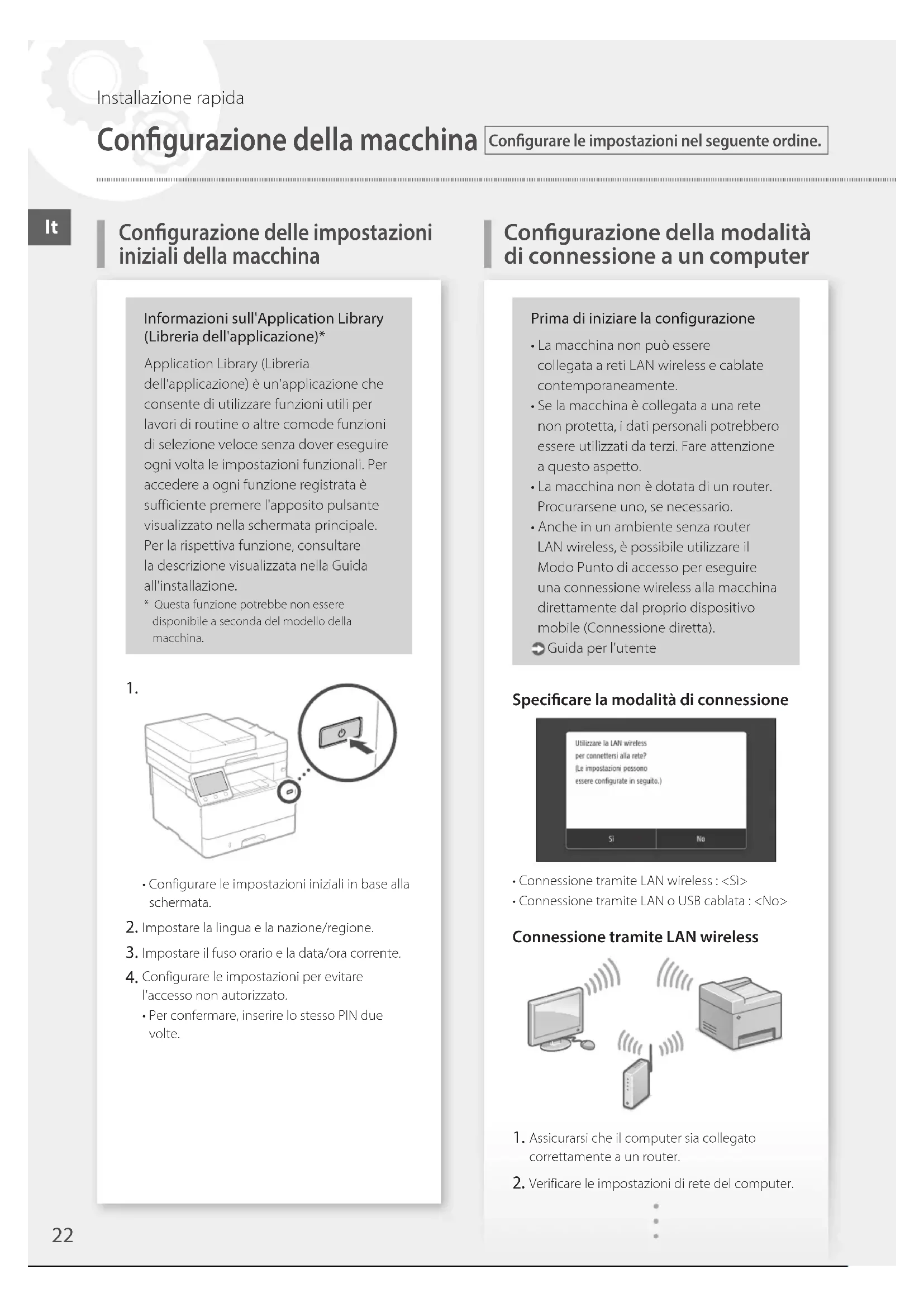 - Configurare le impostazioni iniziali in base alla schermata. Impostare la lingua e la nazione/regione. Impostare il fuso orario e la data/ora corrente. Configurare le impostazioni per evitare l'accesso non autorizzato.• Per confermare, inserire lo stesso PIN due volte.Prima di iniziare la configurazione• La macchina non può essere collegata a reti LAN wireless e cablate contemporaneamente.• Se la macchina è collegata a una rete non protetta, i dati personali potrebbero essere utilizzati da terzi. Fare attenzione a questo aspetto.• La macchina non è dotata di un router. Procurarsene uno, se necessario.• Anche in un ambiente senza router LAN wireless, è possibile utilizzare il Modo Punto di accesso per eseguire una connessione wireless alla macchina direttamente dal proprio dispositivo mobile (Connessione diretta). Guida per l'utenteSpecicare la modalità di connessione• Connessione tramite LAN wireless : <Sì>• Connessione tramite LAN o USB cablata : <No>Connessione tramite LAN wireless Assicurarsi che il computer sia collegato correttamente a un router. Verificare le impostazioni di rete del computer.