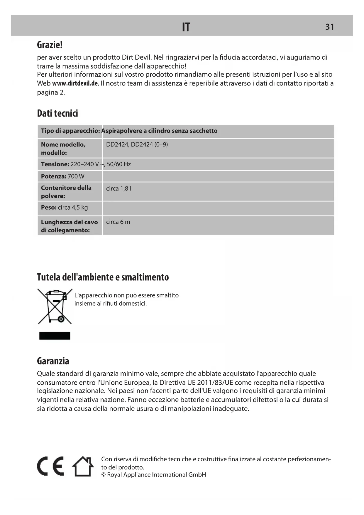 ESTutela dell'ambiente e smaltimento L'apparecchio non può essere smaltito insieme ai riuti domestici. Garanzia Quale standard di garanzia minimo vale, sempre che abbiate acquistato l'apparecchio quale consumatore entro l'Unione Europea, la Direttiva UE 2011/83/UE come recepita nella rispettiva legislazione nazionale. Nei paesi non facenti parte dell'UE valgono i requisiti di garanzia minimi vigenti nella relativa nazione. Fanno eccezione batterie e accumulatori difettosi o la cui durata si sia ridotta a causa della normale usura o di manipolazioni inadeguate. Con riserva di modiche tecniche e costruttive nalizzate al costante perfezionamen- to del prodotto. © Royal Appliance International GmbH Grazie! per aver scelto un prodotto Dirt Devil. Nel ringraziarvi per la ducia accordataci, vi auguriamo di trarre la massima soddisfazione dall'apparecchio! Per ulteriori informazioni sul vostro prodotto rimandiamo alle presenti istruzioni per l'uso e al sito Web www.dirtdevil.de. Il nostro team di assistenza è reperibile attraverso i dati di contatto riportati a pagina 2. Dati tecnici Tipo di apparecchio: Aspirapolvere a cilindro senza sacchetto Nome modello, modello: DD2424, DD2424 (0–9) Tensione: 220–240 V ~, 50/60 Hz Potenza: 700 W Contenitore della polvere: circa 1,8 l Peso: circa 4,5 kg Lunghezza del cavo di collegamento: circa 6 m