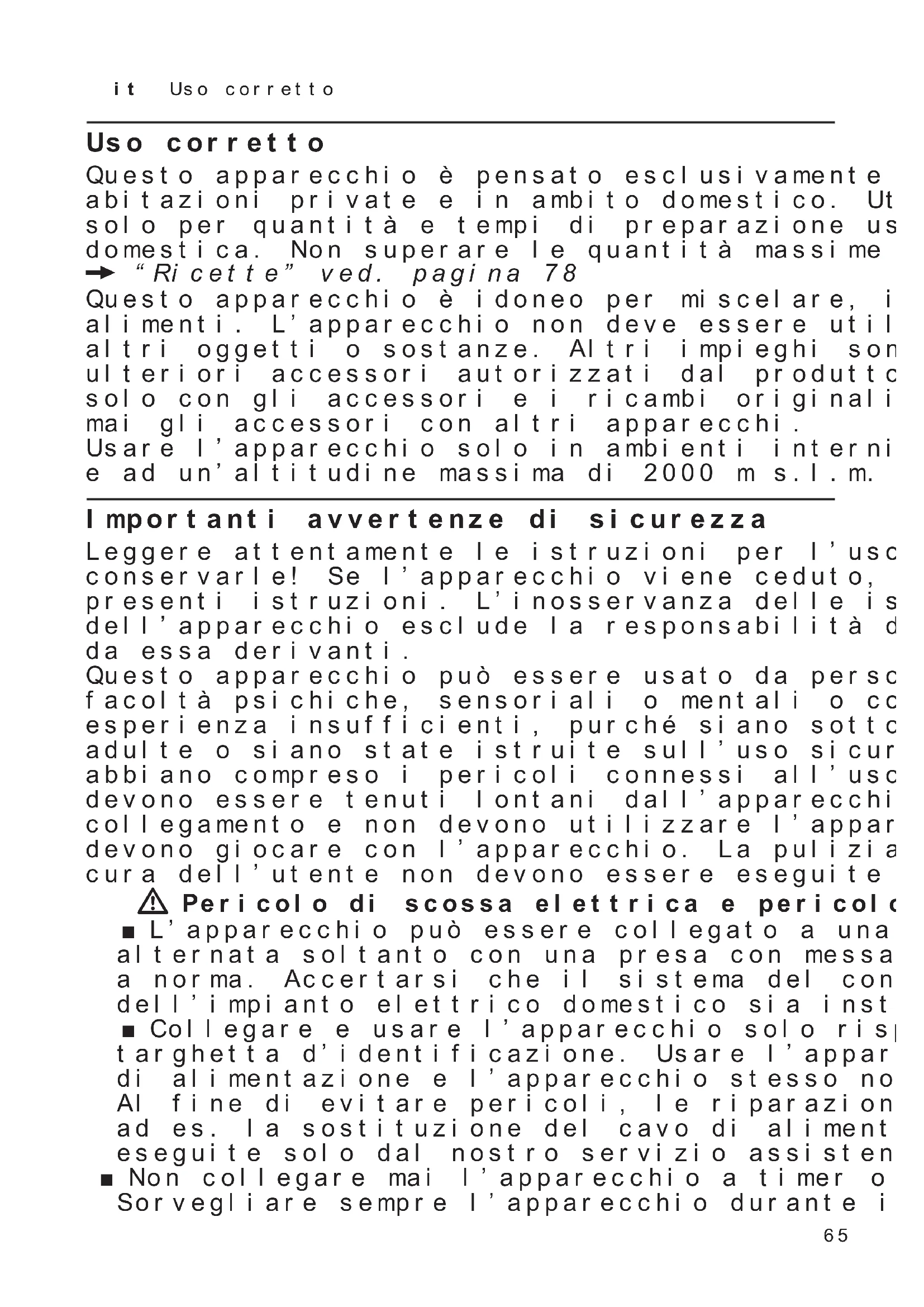 - SOUS-CHARGE lorsque SensorControl Plus est utilisé Trop d’ingrédients, ou pas assez, ont été ajoutés pour le programme sélectionné. ■ Ajouter les ingrédients en fonction des indications de quantité. X « Utilisation de SensorControl Plus » voir page 5365 it Uso corretto Uso corretto Questo apparecchio è pensato esclusivamente per l’utilizzo in abitazioni private e in ambito domestico. Utilizzare l’apparecchio solo per quantità e tempi di preparazione usuali nell’attività domestica. Non superare le quantità massime ammesse. X “Ricette” ved. pagina 78 Questo apparecchio è idoneo per miscelare, impastare e montare alimenti. L’apparecchio non deve essere utilizzato per lavorare altri oggetti o sostanze. Altri impieghi sono possibili se si utilizzano ulteriori accessori autorizzati dal produttore. Usare l’apparecchio solo con gli accessori e i ricambi originali approvati. Non utilizzare mai gli accessori con altri apparecchi. Usare l’apparecchio solo in ambienti interni a temperatura ambiente e ad un’altitudine massima di 2000 m s.l.m. Importanti avvertenze di sicurezza Leggere attentamente le istruzioni per l’uso, osservarle e conservarle! Se l’apparecchio viene ceduto, allegare anche le presenti istruzioni. L’inosservanza delle istruzioni per l’uso corretto dell’apparecchio esclude la responsabilità del costruttore per i danni da essa derivanti. Questo apparecchio può essere usato da persone con ridotte facoltà psichiche, sensoriali o mentali o con conoscenze e/o esperienza insufficienti, purché siano sotto il controllo di persone adulte o siano state istruite sull’uso sicuro dell’apparecchio e abbiano compreso i pericoli connessi all’uso dello stesso. I bambini devono essere tenuti lontani dall’apparecchio e dal cavo di collegamento e non devono utilizzare l’apparecchio. I bambini non devono giocare con l’apparecchio. La pulizia e la manutenzione a cura dell’utente non devono essere eseguite da bambini. W Pericolo di scossa elettrica e pericolo d’incendio! ■ L’apparecchio può essere collegato a una rete a corrente alternata soltanto con una presa con messa a terra installata a norma. Accertarsi che il sistema del conduttore di protezione dell’impianto elettrico domestico sia installato a norma. ■ Collegare e usare l’apparecchio solo rispettando i dati della targhetta d’identificazione. Usare l’apparecchio solo se il cavo di alimentazione e l’apparecchio stesso non presentano danni. Al fine di evitare pericoli, le riparazioni dell’apparecchio, come ad es. la sostituzione del cavo di alimentazione, devono essere eseguite solo dal nostro servizio assistenza clienti. ■ Non collegare mai l’apparecchio a timer o a prese telecomandate. Sorvegliare sempre l’apparecchio durante il funzionamento!66 it Importanti avvertenze di sicurezza ■ Non disporre l’apparecchio sopra oppure in prossimità di superfici molto calde, come per es. fornelli. Non mettere mai il cavo d’ali- mentazione a contatto con parti calde o tirarlo sopra spigoli vivi. ■ Non immergere mai l’apparecchio base in acqua né lavarlo in lavastoviglie. Non pulire con il vapore. Non usare l’apparecchio con le mani bagnate. ■ L’apparecchio va sempre scollegato dalla corrente elettrica dopo ogni utilizzo, se lasciato incustodito, prima del montaggio, dello smontaggio, della pulizia e in caso di guasti. W Pericolo di lesioni! ■ Prima di sostituire accessori o parti aggiuntive che durante il funzionamento si muovono, l’apparecchio deve essere spento e staccato dalla corrente. ■ Per abbassare il braccio oscillante non mettere le mani all’interno per evitare che dita o mani restino incastrate. Non spostare il braccio oscillante quando l’apparecchio è in funzione. ■ Mettere in funzione gli utensili soltanto con la ciotola inserita, il coperchio chiuso e i coperchi di sicurezza applicati! Per l’utilizzo degli accessori, montare la ciotola, il coperchio e i coperchi di sicurezza in base alle istruzioni! ■ Durante il funzionamento non introdurre mai le mani nella ciotola o nel pozzetto di riempimento. Non infilare oggetti (ad es. cucchiai da cucina) nella ciotola o nel pozzetto di riempimento. Tenere lontano mani, capelli, abiti e altri utensili dalle parti in rotazione. Dopo avere spento l’apparecchio, l’ingranaggio continua brevemente a girare. Attendere l’arresto completo dell’ingranaggio. ■ Non utilizzare mai contemporaneamente utensili e accessori o 2 accessori. Per l’uso degli accessori osservare sia il libretto d’istruzioni accluso sia le presenti istruzioni per l’uso. ■ Per l’uso degli accessori osservare le marcature colorate presenti sugli accessori e sull’ingranaggio. W Pericolo di soffocamento! Non lasciare che i bambini giochino con il materiale di imballaggio. W Attenzione! ■ Si consiglia di non lasciare mai l’apparecchio acceso più a lungo di quanto è necessario per la lavorazione dell’alimento. Non fare girare a vuoto l’apparecchio. ■ Il piano di lavoro deve essere ben accessibile, impermeabile, stabile, in piano, asciutto e sufficientemente grande, per evitare danni da spruzzi e poter lavorare liberamente. W Importante! Lavare sempre a fondo l’apparecchio dopo ogni utilizzo o dopo un lungo periodo di inattività. X “Pulizia e cura” ved. pagina 7767 it Panoramica Congratulazioni per l’acquisto di questo nuovo apparecchio di produzione Bosch. Trovate ulteriori informazioni sui nostri prodotti nel nostro sito Internet. www.bosch-home.com I nostri apparecchi sono soggetti a uno sviluppo continuo. Può pertanto succedere che alcune funzioni non corrispondano a quelle indicate in queste istruzioni. In questo caso verificare se sul nostro sito Internet è disponibile una versione più recente di queste istruzioni. Per utilizzare queste istruzioni per l’uso è possibile aprire i risvolti, dove si trovano figure dell’apparecchio contrassegnate con lettere e numeri ai qual