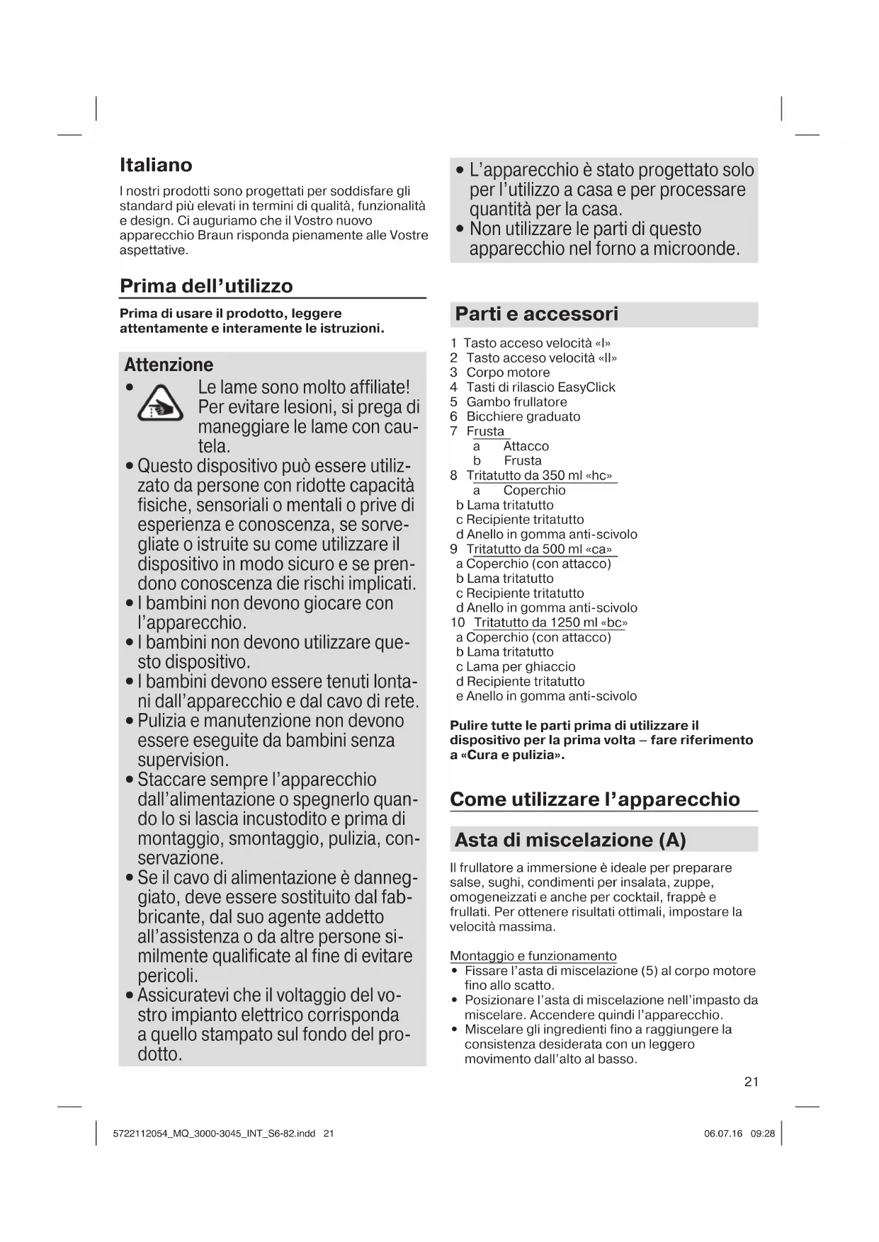 - Durante la lavorazione di cibi ad alta concentrazione di pigmento (ad es. carote), gli accessori possono cambiare colore. Strofinare queste parti con olio vegetale prima di pulirle. Le specifiche di progettazione e le presenti istruzioni d’uso sono soggette a modifica senza preavviso. Soggetto a modifiche senza preavviso. Non smaltire il prodotto insieme ai rifiuti domestici quando non più necessario. Il prodotto può essere smaltito presso un centro di assistenza Braun o un centro di raccolta adatto del proprio paese. I materiali e gli oggetti destinati al contatto con prodotti alimentari sono conformi alle prescrizioni del regolamento Europeo 1935/2004. 5722112054_MQ_3000-3045_INT_S6-82.indd 235722112054_MQ_3000-3045_INT_S6-82.indd 23 06.07.16 09:2806.07.16 09:2824 Nederlands Onze producten zijn ontwikkeld om te voldoen aan de strengste normen inzake kwaliteit, functionaliteit en design. Wij hopen van harte dat u geniet van uw nieuw Braun-toestel. Vóór gebruik Lees de handleiding voordat u het apparaat in gebruik neemt in zijn geheel zorgvuldig door. Waarschuwing