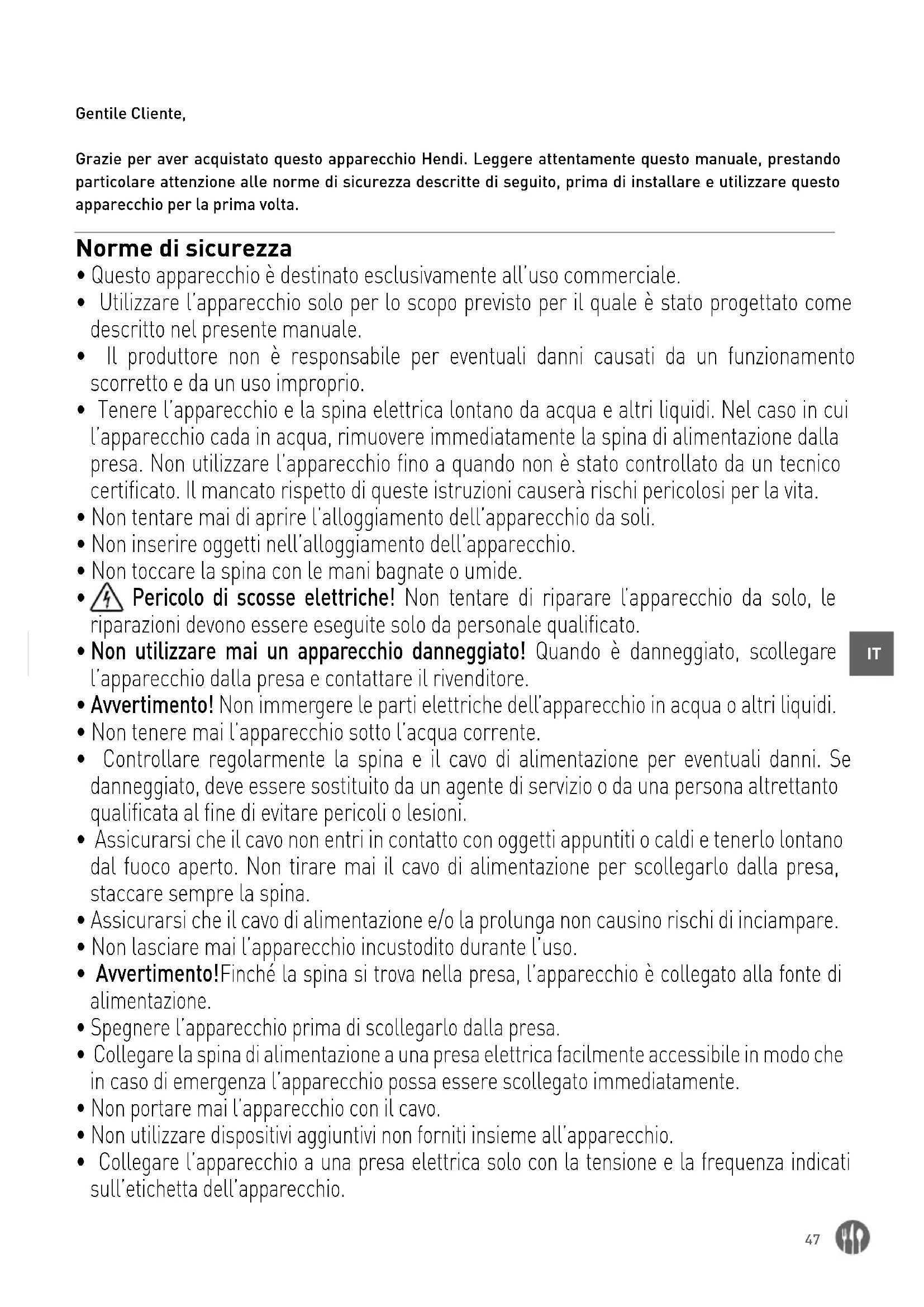 Gentile Cliente, Grazie per aver acquistato questo apparecchio Hendi. Leggere attentamente questo manuale, prestando particolare attenzione alle norme di sicurezza descritte di seguito, prima di installare e utilizzare questo apparecchio per la prima volta. Norme di sicurezza