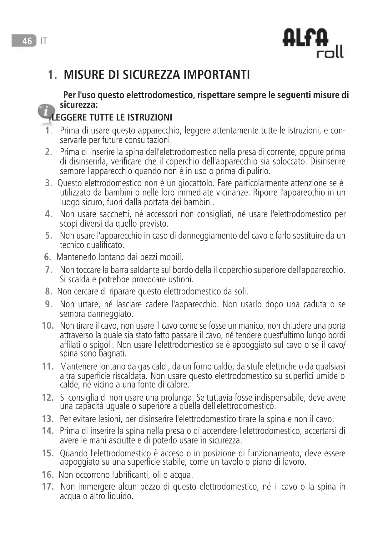 Scarica le istruzioni per il tuo Macchine per confezionamento sottovuoto in formato PDF gratuitamente! Trova il tuo manuale Roll - ALFA e riprendi in mano il tuo dispositivo elettronico. In questa pagina sono pubblicati tutti i documenti necessari per l'utilizzo del tuo dispositivo. Roll del marchio ALFA.