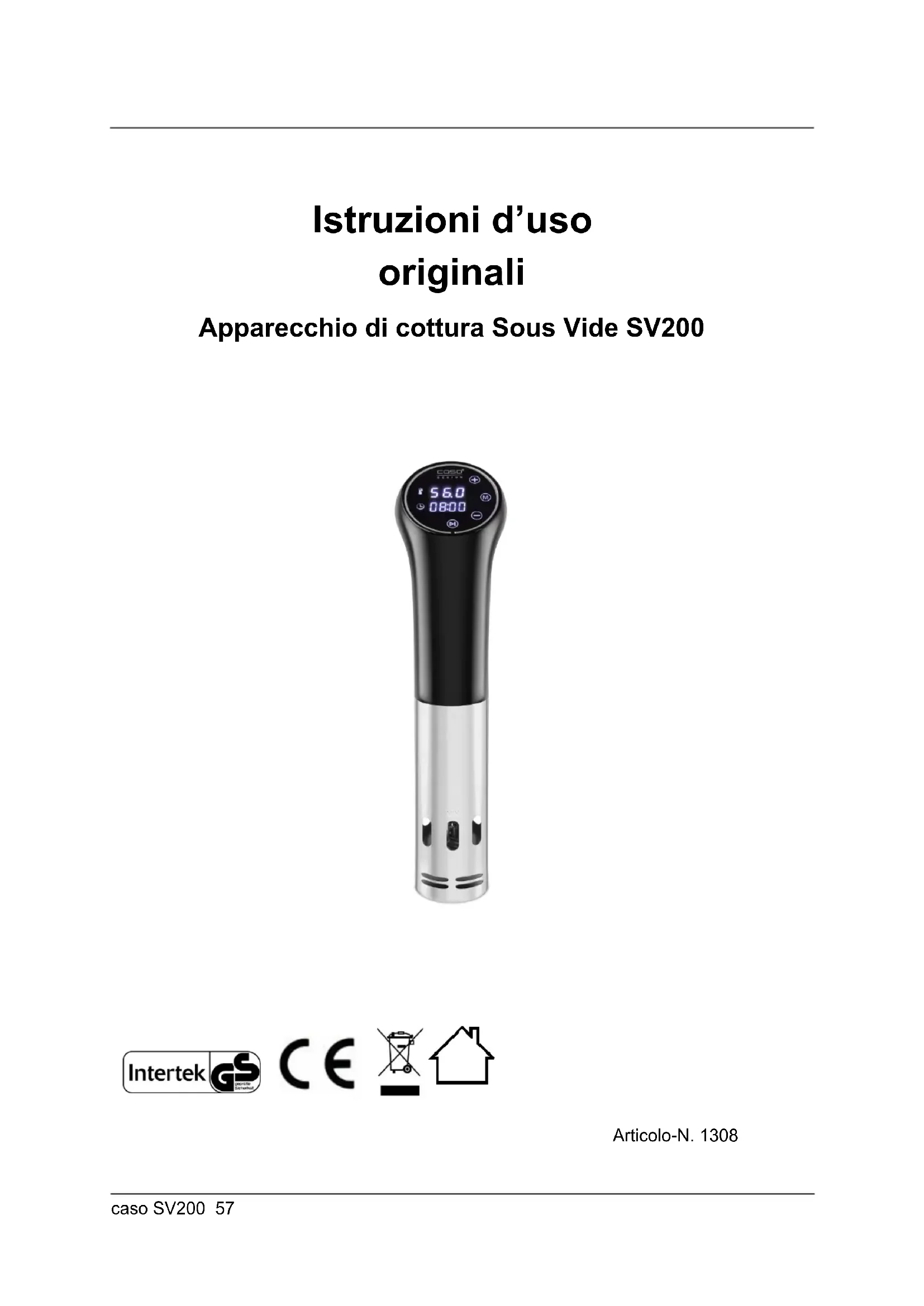 E4 La protezione da surriscaldamento è scattata. Se nel recipiente di cottura si trova troppo poca acqua e il sensore del livello acqua Min possibilmente non funzionasse correttamente, scatta la protezione di surriscaldamento „troppo poca acqua". Staccare la spina e lasciare raffreddare l'apparecchio. Rabboccare abbastanza acqua e infilare di nuovo la spina elettrica. Pericolo ► Se l'intero apparecchio e/o l'elemento di comando sono venuti a contatto con l'acqua, staccare la spina elettrica e rivolgersi al servizio di assistenza clienti. Attenzione, scossa elettrica!caso SV200 72 Indicazione ► Se non riesce a risolvere il problema con i passi sopra descritti, la preghiamo di rivolgersi al servizio Clienti. 52 Smaltimento dell’apparecchio obsoleto Apparecchi elettrici ed elettronici obsoleti contengono spesso ancora materiali preziosi. Essi contengono però anche sostanze nocive, che erano necessarie per il loro funzionamento e la loro sicurezza. Questi possono nuocere alla salute umana o all’ambiente se vengono gettati tra i rifiuti non riciclabili o in caso di un trattamento errato. Per questo eviti assolutamente di gettare il suo apparecchio obsoleto nella spazzatura non riciclabile. Indicazione ► Si serva dell'area ecologica realizzata nel suo comune di residenza, per la consegna ed il riciclo di apparecchi elettrici o elettronici obsoleti. Si informi eventualmente presso il Suo comune, il Suo servizio di nettezza urbana o presso il suo rivenditore. ► Si assicuri, che il suo apparecchio obsoleto venga stoccato a prova di bambini, fino al momento della sua rimozione. 53 Garanzia A partire dalla data di vendita assumiamo per questo prodotto una garanzia di 24 mesi per difetti, riconducibili ad errori di fabbricazione o nelle materie prime. Ciò non ha alcuna influenza sulle sue pretese di garanzia di legge in conformità al §439 e seguenti del BGB-E. Non contenute nella garanzia sono i danni, che si sono verificati a causa di un trattamento o un impiego inadeguato, così come i danni, che compromettono solo lievemente il funzionamento o il valore dell’apparecchio. Inoltre si escludono dalle pretese di garanzia pezzi d'usura, danni dovuti al trasporto, fin tanto questi non siano imputabili alla nostra responsabilità, così come danni, che sono riconducibili a riparazioni non eseguiti da noi. Questo apparecchio è stato realizzato per un utilizzo in ambito privato (impiego domestico) ed è stato realizzato con una potenza adeguata. Un eventuale utilizzo di tipo commerciale è assoggettabile alla garanzia, solo fintanto il suo utilizzo possa essere confrontato con quello in ambito privato. Non è previsto per un uso che vada oltre questo tipo di utilizzo commerciale. In caso di reclami giustificati, saremo liberi di scegliere se riparare l’apparecchio o se è il caso di sostituirlo con uno privo di malfunzionamenti. Malfunzionamenti aperti dovranno essere comunicati entro 14 giorni dalla fornitura. Altre pretese sono escluse. Per far valere una pretesa di garanzia, La preghiamo di mettersi in contatto con noi, prima di reinviarci l’apparecchio (sempre con scontrino d’acquisto!).caso SV200 73 54 Dati tecnici Apparecchio Apparecchio di cottura Sous Vide Nome SV200 N. articolo 1308 Dati connessione 220-240V~ 50/60 Hz Potenza assorbita 800 W Capacità 6-19 L Misure esterne (L/H/P) 37,8 cm di altezza, 85 cm di lunghezza cavo 6 cm di diametro in basso 9 cm di diametro in alto Peso netto 0,923 kgcaso SV200 74