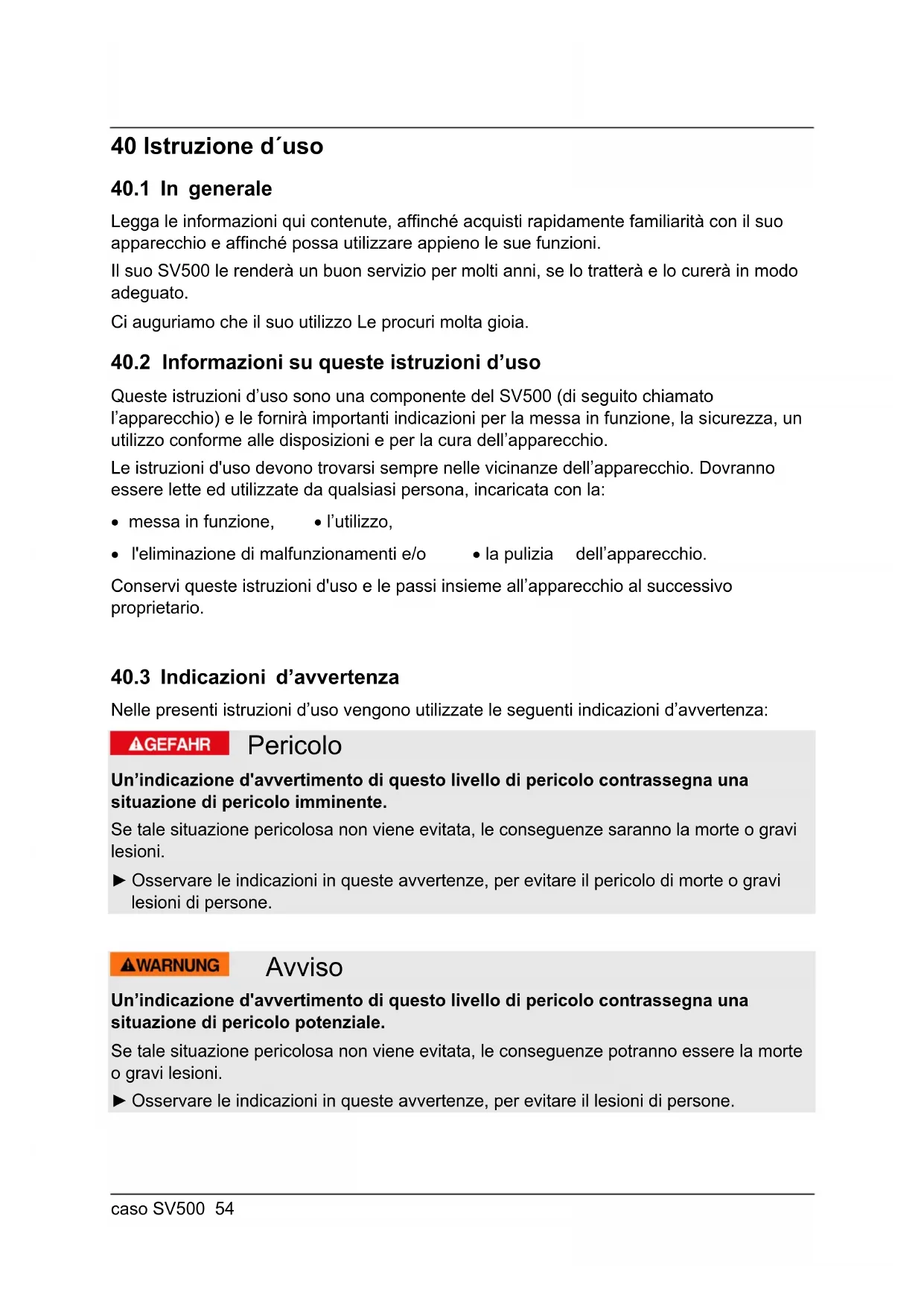 Avviso Un’indicazione d'avvertimento di questo livello di pericolo contrassegna una situazione di pericolo potenziale. Se tale situazione pericolosa non viene evitata, le conseguenze potranno essere la morte o gravi lesioni. ► Osservare le indicazioni in queste avvertenze, per evitare il lesioni di persone.caso SV500 55 Attenzione Un’indicazione d'avvertimento di questo livello di pericolo contrassegna una situazione di pericolo potenziale. Se tale situazione pericolosa non viene evitata, le conseguenze potranno essere lesioni leggere o di media entità. ► Osservare le indicazioni in queste avvertenze, per evitare il lesioni di persone. Indicazione Un indicazione contrassegna inoltre delle informazioni, che facilitano l’utilizzo della macchina.
