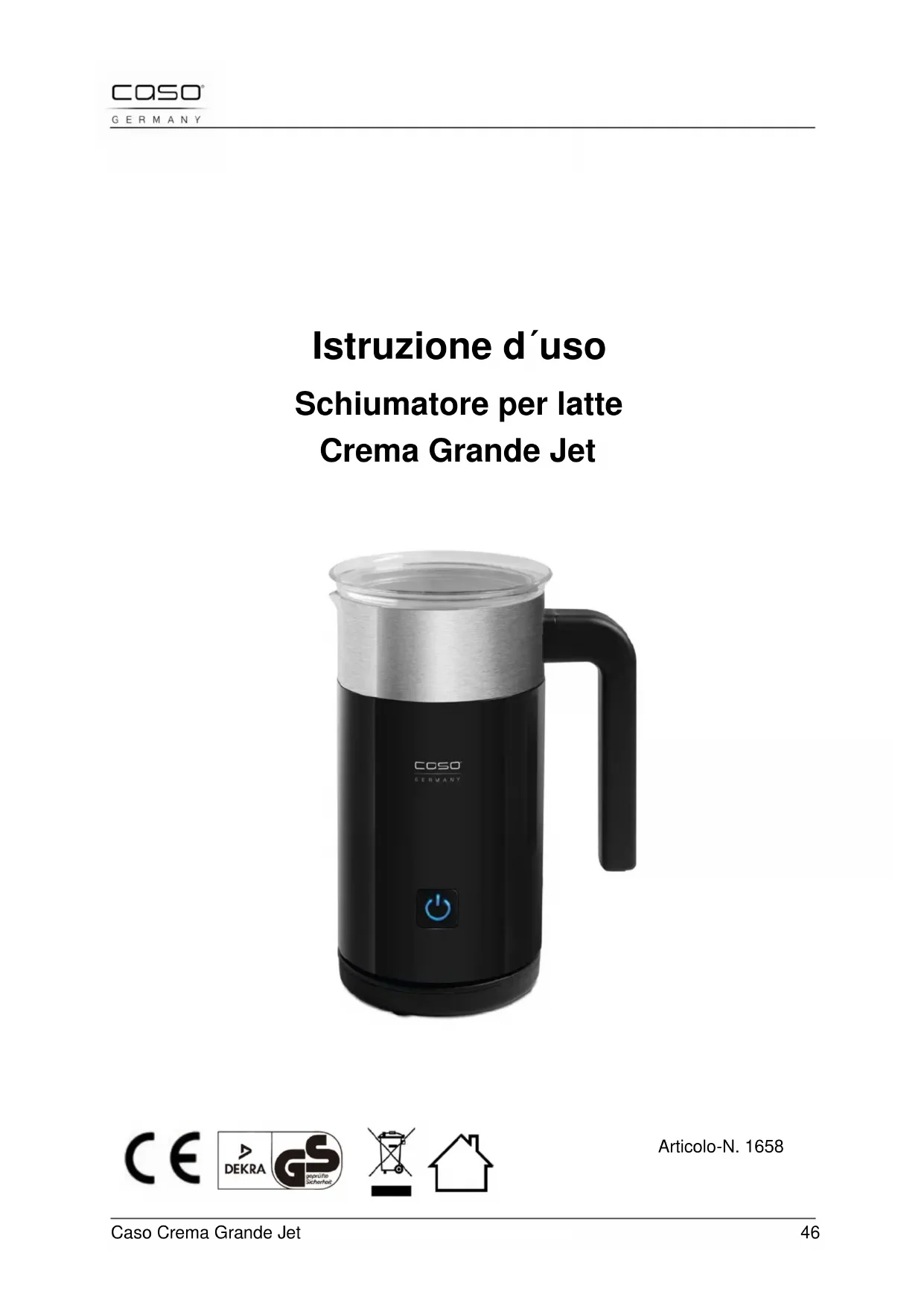 Scarica le istruzioni per il tuo Montalatte in formato PDF gratuitamente! Trova il tuo manuale Crema Grande Jet 1658 - CASO e riprendi in mano il tuo dispositivo elettronico. In questa pagina sono pubblicati tutti i documenti necessari per l'utilizzo del tuo dispositivo. Crema Grande Jet 1658 del marchio CASO.