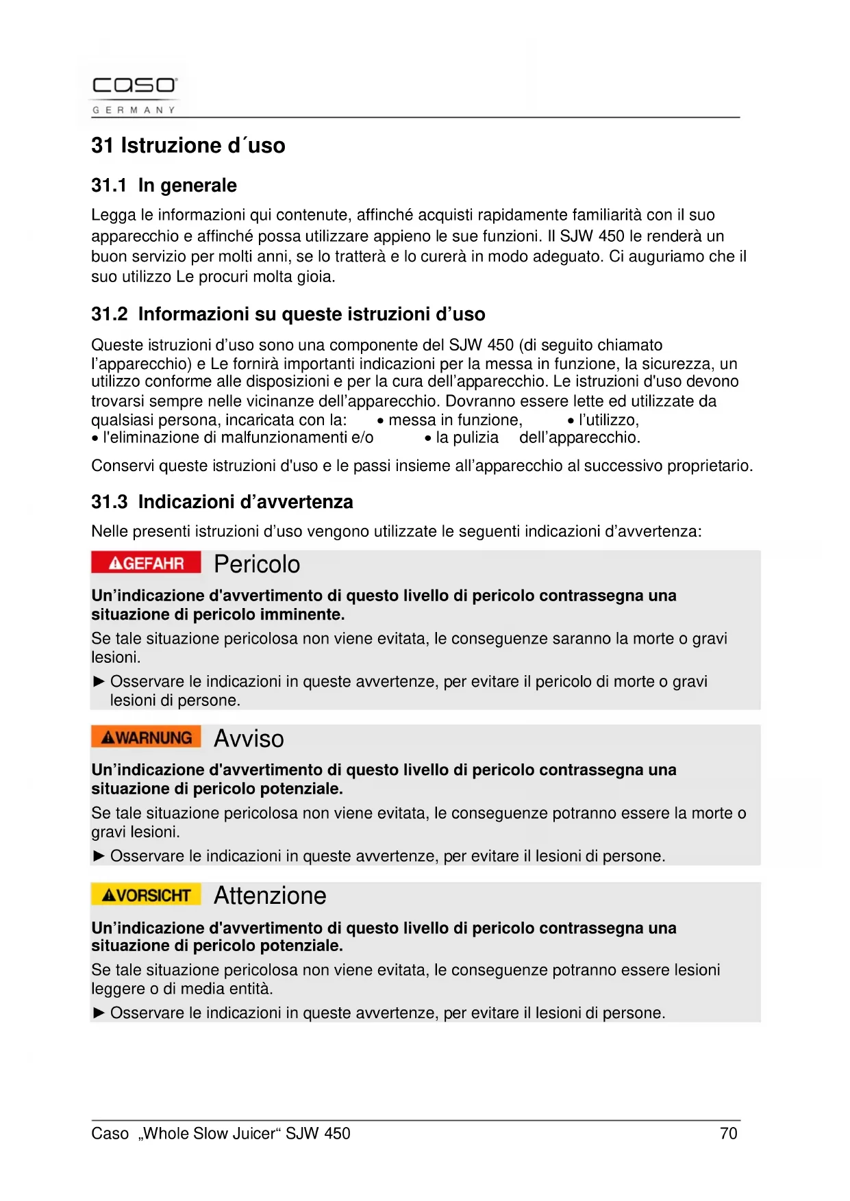 Indicazione Osservi le seguenti indicazioni di sicurezza per un utilizzo sicuro dell'apparecchio: ► Controlli prima dell'utilizzo, che l’apparecchio non presenti danni esterni. Non metta in funzione un apparecchio danneggiato. ► Questo apparecchio può essere utilizzato da persone con disabilità mentali, sensoriche o fisiche, solo se prima sono stati istruiti sul funzionamento sicuro e se capiscono i possibili pericoli esistenti. ► Tenere l'apparecchio e il cavo di corrente lontano dalla portata di bambini. ► Non fare giocare i bambini con l'apparecchio. ► Lavori di pulizia e manutenzione non devono essere eseguiti da bambiniCaso Entsafter „Whole Slow Juicer“ SJW 450 72 Indicazione ► Non lasciare l’apparecchio incustodito durante il suo funzionamento. ► Riparazioni dovranno essere eseguiti soltanto da personale specializzato e qualificato, addestrato dal produttore. Con riparazioni inadeguate possono verificarsi pericoli per l’utilizzatore. ► Una riparazione dell’apparecchio durante il periodo di garanzia dovrà essere effettuata soltanto da un servizio Clienti autorizzato dal produttore, altrimenti decade ogni diritto di garanzia per danni che ne conseguono. ► Componenti difettosi dovranno essere sostituiti soltanto da pezzi di ricambio originali. Solo con questi pezzi vi è la garanzia, che i requisiti di sicurezza siano soddisfatti. ► Non immergere l'apparecchio, il cavo e la spina nell'acqua e in altri liquidi e non metterli nella lavastoviglie. ► Non sovraccaricare l'apaprecchio e non farlo funzionare a vuoto. ► Non svuotare il contenitore dei rifiuti se non prima avete rimosso la spina dalla presa elettrica. ► Accertarsi che tutte le parti siano montate correttamente e che siano fissate. ► I prodotti alimentari devono soddisfare gli standard nazionali. ► L'uso sbagliato dell'apparecchio può causare lesioni. ► Le lame nel vano di riempimento sono molto taglienti. Non toccarle! ► Per evitare pericoli, non utilizzare mai accessori non raccomandati dal fabbricante. ► Non toccare i componenti in movimento. ► Prima di accenderlo, assicurarsi che l'apparecchio sia correttamente assemblato. ► Dopo ogni uso imposti l’interruttore nella posizione O. Prima di smontare l’apparecchio, si assicuri che il motore sia stato completamente arrestato.Caso Entsafter „Whole Slow Juicer“ SJW 450 73 Indicazione ► Non infilare le dita o altri oggetti nell'apertura durante il funzionamento dell'apparecchio (vano di riempimento). Utilizzare l'intasatore o un pezzo di frutta/verdura, per comprimere i prodotti alimentari, quando questi rimangono incastrati nel vano di riempimento. Nel caso ciò non dovesse funzionare, spegnere l'apparecchio e smontarlo nei suoi componenti per rimuovere i profotti alimentari rimasti incastrati. ► Non utilizzare l'apparecchio se il setaccio rotante o il rialzo per sorbetto sono danneggiati. ► Utilizzare l'apparecchio esclusivamente con il contenitore per i residui della spremitura. ► Spenga innanzitutto l’apparecchio, estraendo la spina dalla presa della corrente, prima di montare o smontare le parti. ► Non apporti alcuna modifica all’apparecchio. ► L'apparecchio non è adatto a farlo funzionare continuamente. Non lasciare funzionare l'apparecchio più di 15 minuti e non estrarre succo da più di 3 kg di generi alimentari. ► Spegnere l'apparecchio e staccare la spina, prima di sostituire dei componenti oppure toccate componenti in movimento. ► Non immergere l'apparecchio, il cavo e la spina nell'acqua e in altri liquidi e non metterli nella lavastoviglie. ► Non utilizzare l'apparecchio per altri scopi che per quelli normalmente in uso domestico. ► Non spremere prodotti alimentari estremamente duri (p. es. noci), prodotti ricchi di fibre alimentari (p. es. canna da zucchero) oppure prodotti alimentari che hanno poco succo (p. es. banane).Caso Entsafter „Whole Slow Juicer“ SJW 450 74