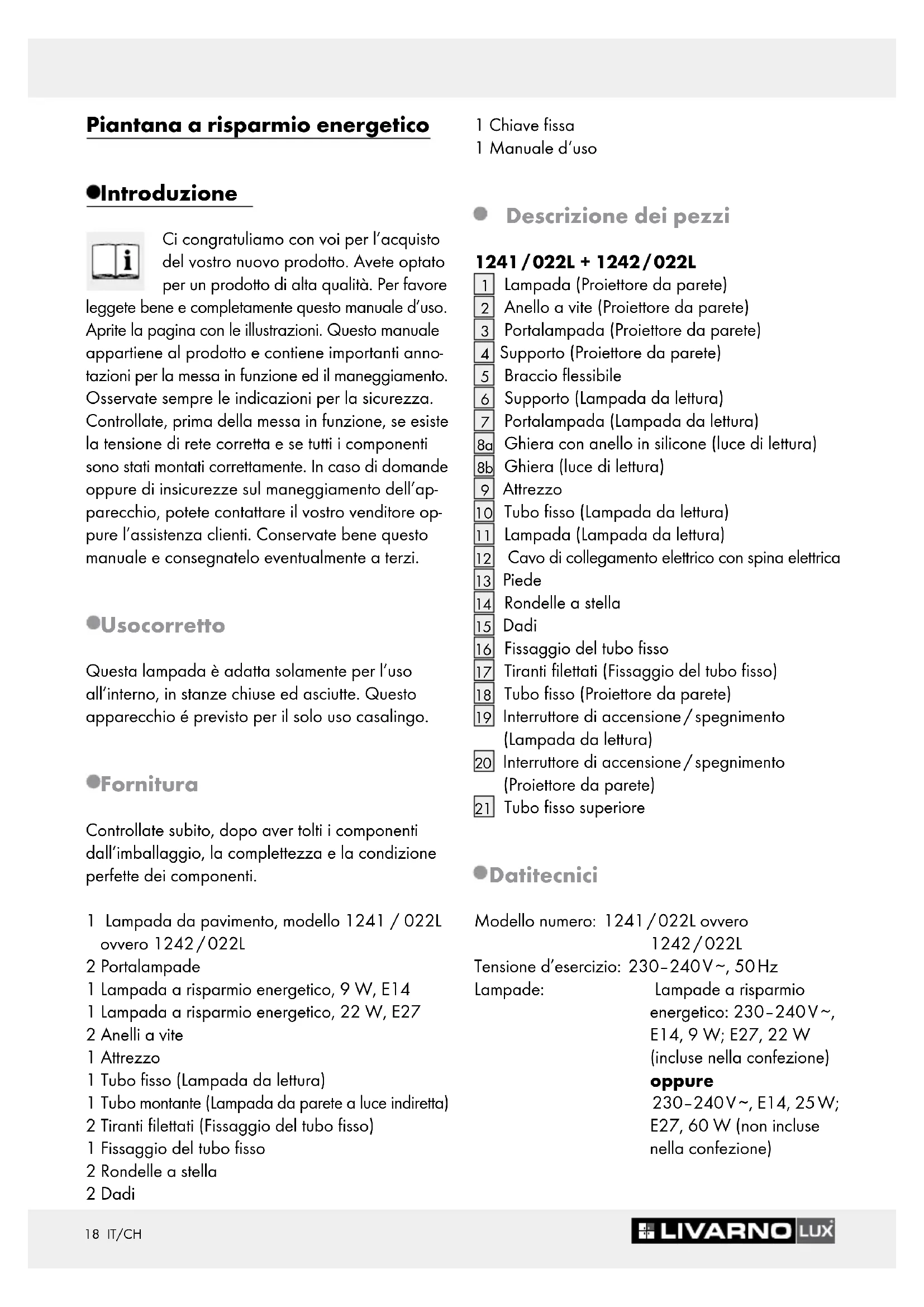 Aprite la pagina con le illustrazioni. Questo manuale appartiene al prodotto e contiene importanti anno- tazioni per la messa in funzione ed il maneggiamento. Osservate sempre le indicazioni per la sicurezza. Controllate, prima della messa in funzione, se esiste la tensione di rete corretta e se tutti i componenti sono stati montati correttamente. In caso di domande oppure di insicurezze sul maneggiamento dell’ap- parecchio, potete contattare il vostro venditore op- pure l’assistenza clienti. Conservate bene questo manuale e consegnatelo eventualmente a terzi. Uso corretto Questa lampada è adatta solamente per l’uso all’interno, in stanze chiuse ed asciutte. Questo apparecchio é previsto per il solo uso casalingo. Fornitura Controllate subito, dopo aver tolti i componenti dall’imballaggio, la complettezza e la condizione perfette dei componenti. 1 Lampada da pavimento, modello 1241 / 022L ovvero 1242 / 022L 2 Portalampade 1 Lampada a risparmio energetico, 9 W, E14 1 Lampada a risparmio energetico, 22 W, E27 2 Anelli a vite 1 Attrezzo 1 Tubo fisso (Lampada da lettura) 1 Tubo montante (Lampada da parete a luce indiretta) 2 Tiranti filettati (Fissaggio del tubo fisso) 1 Fissaggio del tubo fisso 2 Rondelle a stella 2 Dadi 1 Chiave fissa 1 Manuale d‘uso Descrizione dei pezzi 1241 / 022L + 1242 / 022L