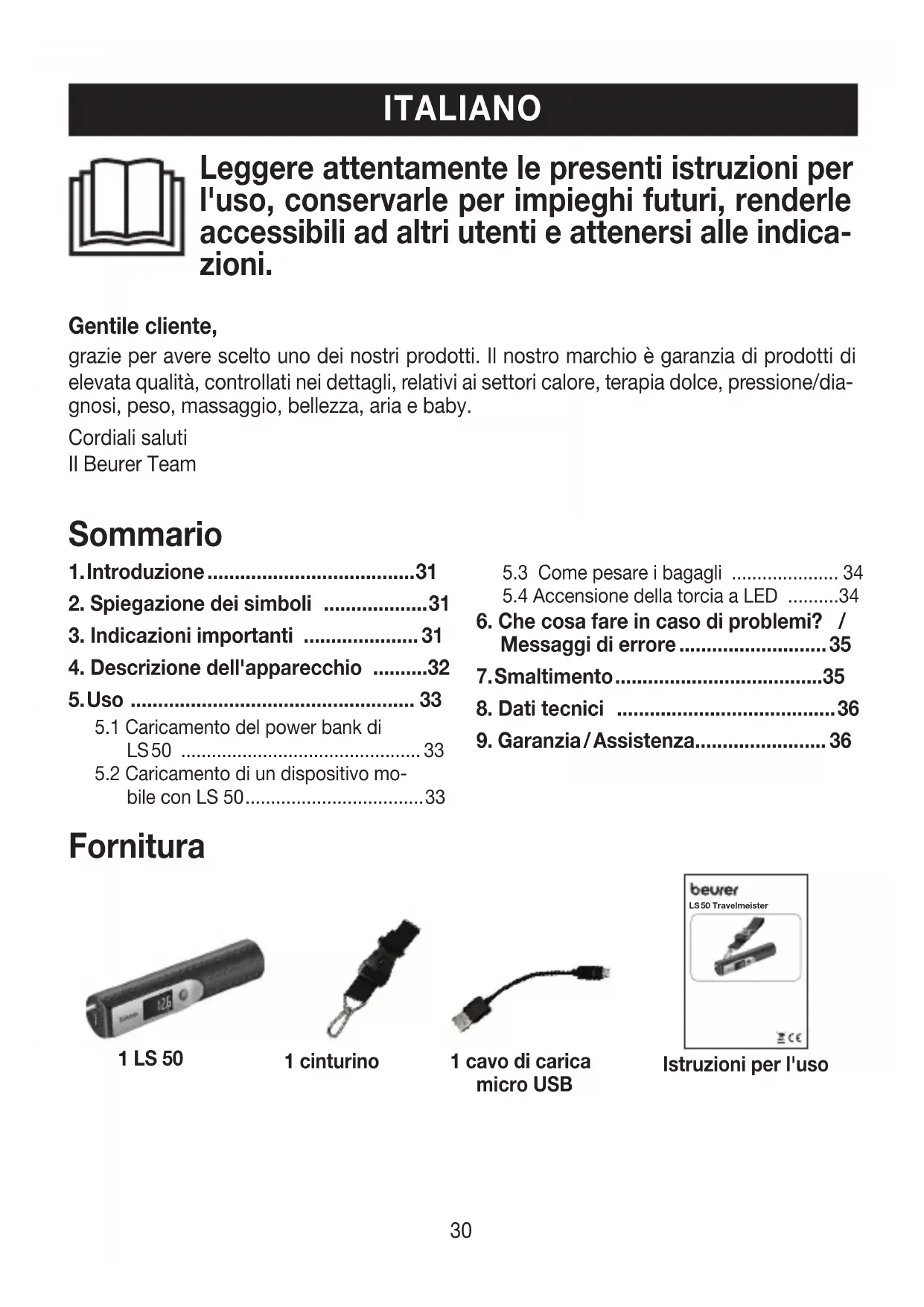 Fornitura 1 cinturino 1 LS 50 1 cavo di carica micro USB Istruzioni per l'uso LS 50 Travelmeister31