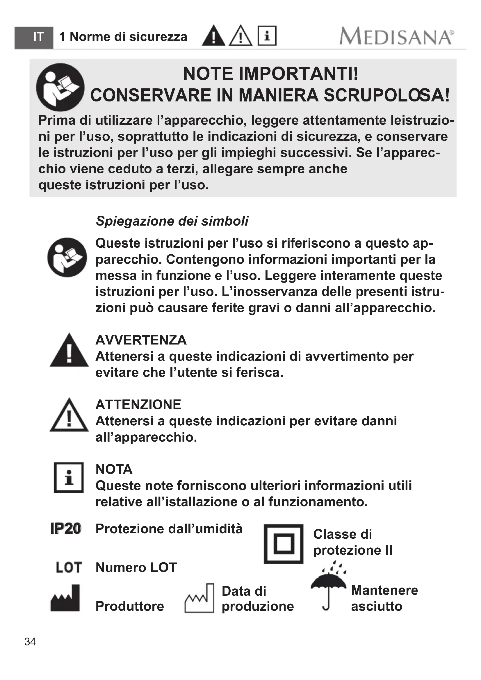 - I prodotti MEDISANA hanno una garanzia di tre anni a partire nella data di vendita. La data di acquisto deve essere comprovata in caso di garanzia alla ricevuta di acquisto o alla fattura.