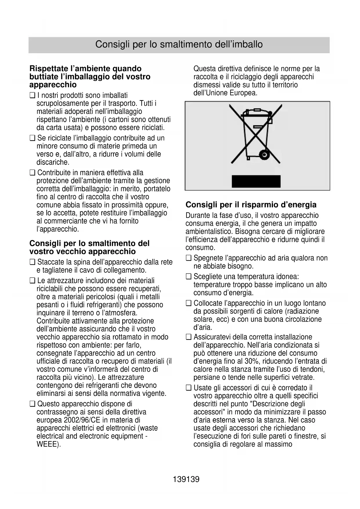 Consigli per lo smaltimento dell’imballo Rispettate l’ambiente quando buttiate l’imballaggio del vostro apparecchio ❏ I nostri prodotti sono imballati scrupolosamente per il trasporto. Tutti i materiali adoperati nell’imballaggio rispettano l’ambiente (i cartoni sono ottenuti da carta usata) e possono essere riciclati. ❏ Se riciclate l’imballaggio contribuite ad un minore consumo di materie primeda un verso e, dall’altro, a ridurre i volumi delle discariche. ❏ Contribuite in maniera effettiva alla protezione dell’ambiente tramite la gestione corretta dell’imballaggio: in merito, portatelo fino al centro di raccolta che il vostro comune abbia fissato in prossimità oppure, se lo accetta, potete restituire l’imballaggio al commerciante che vi ha fornito l’apparecchio. Consigli per lo smaltimento del vostro vecchio apparecchio ❏ Staccate la spina dell’apparecchio dalla rete e tagliatene il cavo di collegamento. ❏ Le attrezzature includono dei materiali riciclabili che possono essere recuperati, oltre a materiali pericolosi (quali i metalli pesanti o i fluidi refrigeranti) che possono inquinare il terreno o l’atmosfera. Contribuite attivamente alla protezione dell’ambiente assicurando che il vostro vecchio apparecchio sia rottamato in modo rispettoso con ambiente: per farlo, consegnate l’apparecchio ad un centro ufficiale di raccolta o recupero di materiali (il vostro comune v’informerà del centro di raccolta più vicino). Le attrezzature contengono dei refrigeranti che devono eliminarsi ai sensi della normativa vigente. ❏ Questo apparecchio dispone di contrassegno ai sensi della direttiva europea 2002/96/CE in materia di apparecchi elettrici ed elettronici (waste electrical and electronic equipment - WEEE). Questa direttiva definisce le norme per la raccolta e il riciclaggio degli apparecchi dismessi valide su tutto il territorio dell’Unione Europea. Consigli per il risparmio d’energia Durante la fase d’uso, il vostro apparecchio consuma energia, il che genera un impatto ambientalistico. Bisogna cercare di migliorare l’efficienza dell’apparecchio e ridurne quindi il consumo. ❏ Spegnete l’apparecchio ad aria qualora non ne abbiate bisogno. ❏ Scegliete una temperatura idonea: temperature troppo basse implicano un alto consumo d’energia. ❏ Collocate l’apparecchio in un luogo lontano da possibili sorgenti di calore (radiazione solare, ecc) e con una buona circolazione d’aria. ❏ Assicuratevi della corretta installazione dell’apparecchio. Nell’aria condizionata si può ottenere una riduzione del consumo d’energia fino al 30%, riducendo l’entrata di calore nella stanza tramite l’uso di tendoni, persiane o tende nelle superfici vetrate. ❏ Usate gli accessori di cui è corredato il vostro apparecchio oltre a quelli specifici descritti nel punto "Descrizione degli accessori" in modo da minimizzare il passo d’aria esterna verso la stanza. Nel caso usate degli accessori che richiedano l’esecuzione di fori sulle pareti o finestre, si consiglia di regolare al massimoOsservazioni importanti