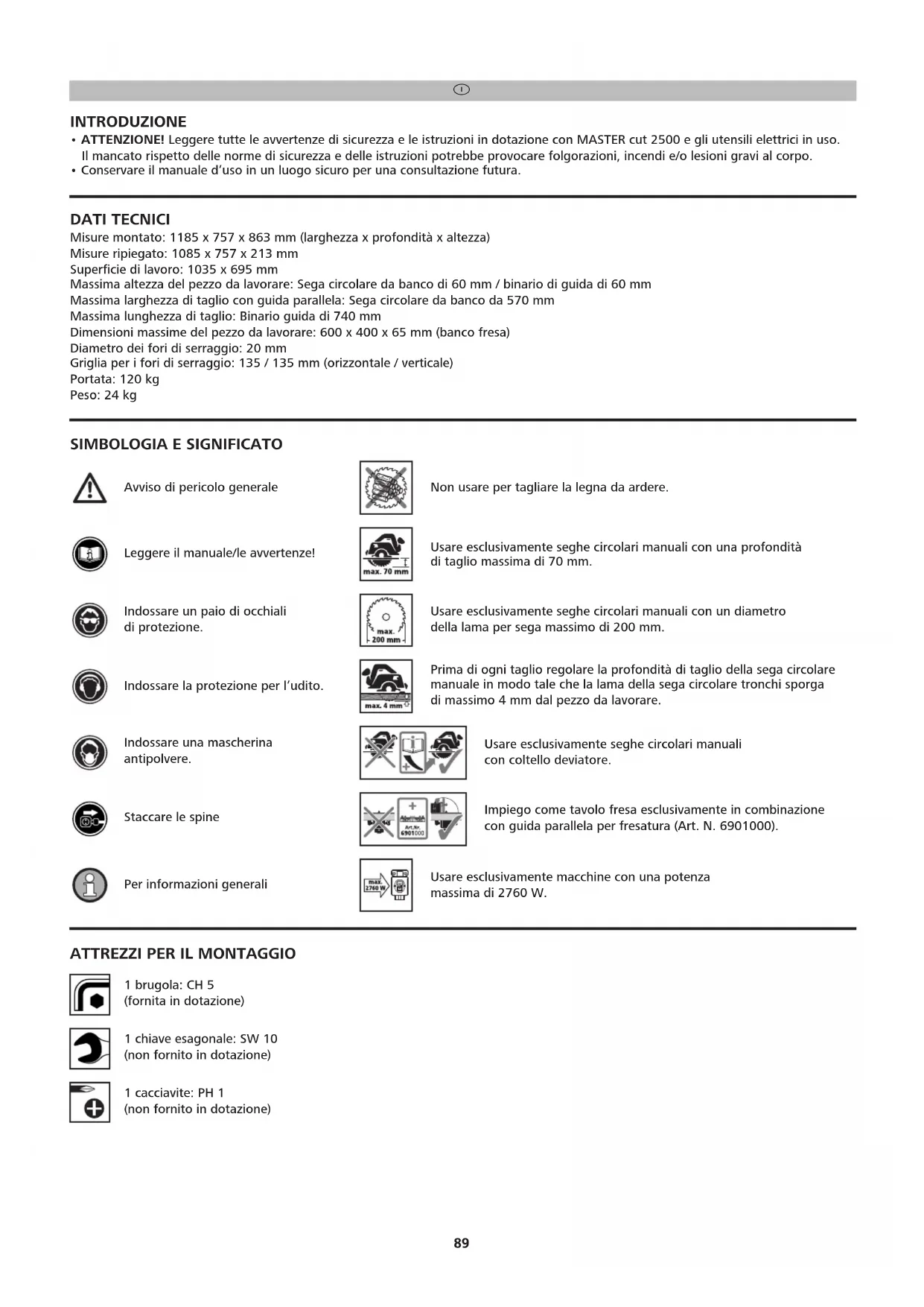 1 brugola: CH 5 (fornita in dotazione) 1 cacciavite: PH 1 (non fornito in dotazione) 1 chiave esagonale: SW 10 (non fornito in dotazione) BDAL 6902_116306902 26.04.17 11:51 Seite 8990 CONFORMITÀ D'USO MASTER cut 2500 è una troncatrice di precisione e centro di lavorazione. L'apparecchio è adatto agli utilizzi descritti di seguito.