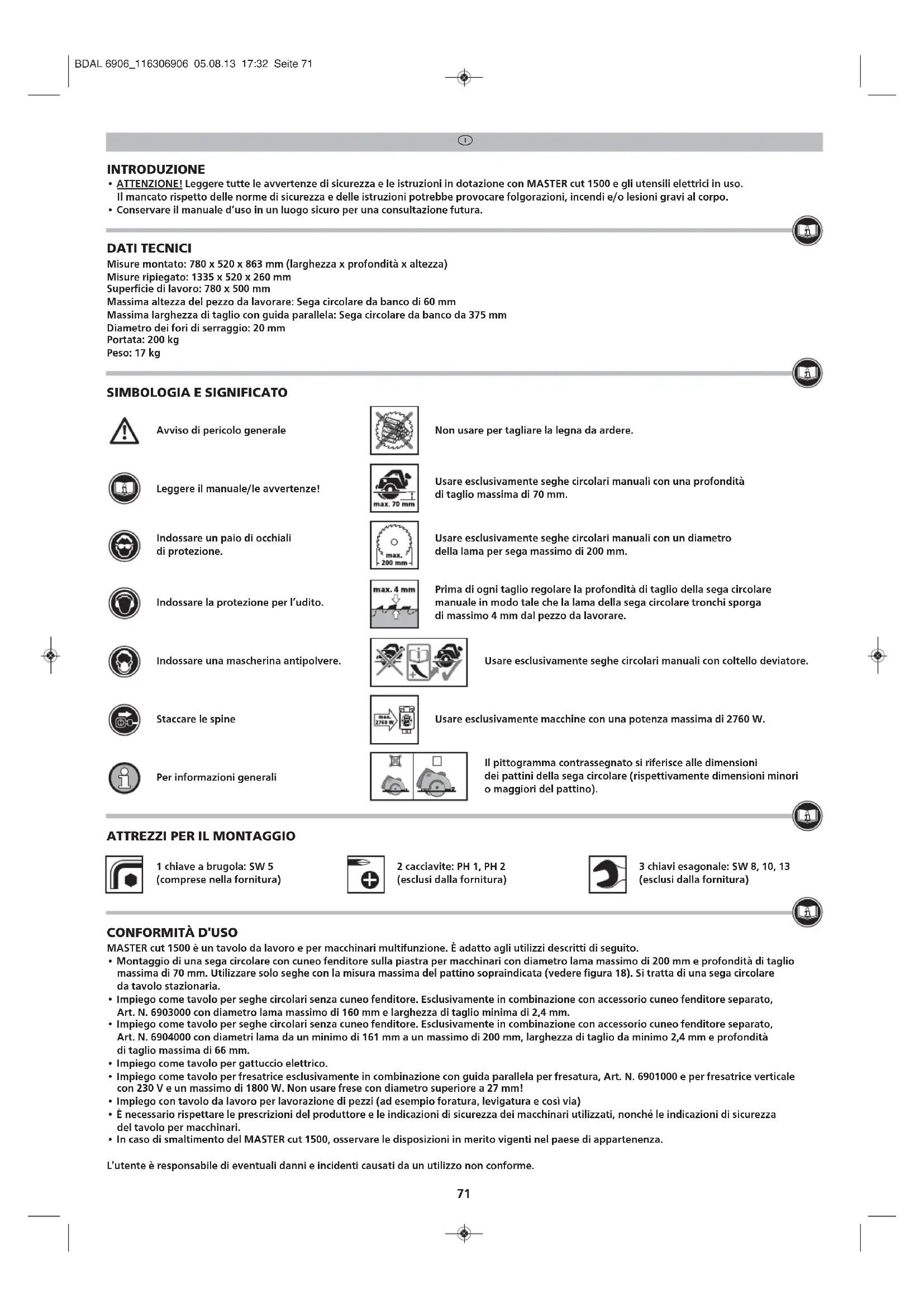 1 chiave a brugola: SW 5 (comprese nella fornitura) 2 cacciavite: PH 1, PH 2 (esclusi dalla fornitura) 3 chiavi esagonale: SW 8, 10, 13 (esclusi dalla fornitura) CONFORMITÀ D'USO MASTER cut 1500 è un tavolo da lavoro e per macchinari multifunzione. È adatto agli utilizzi descritti di seguito.